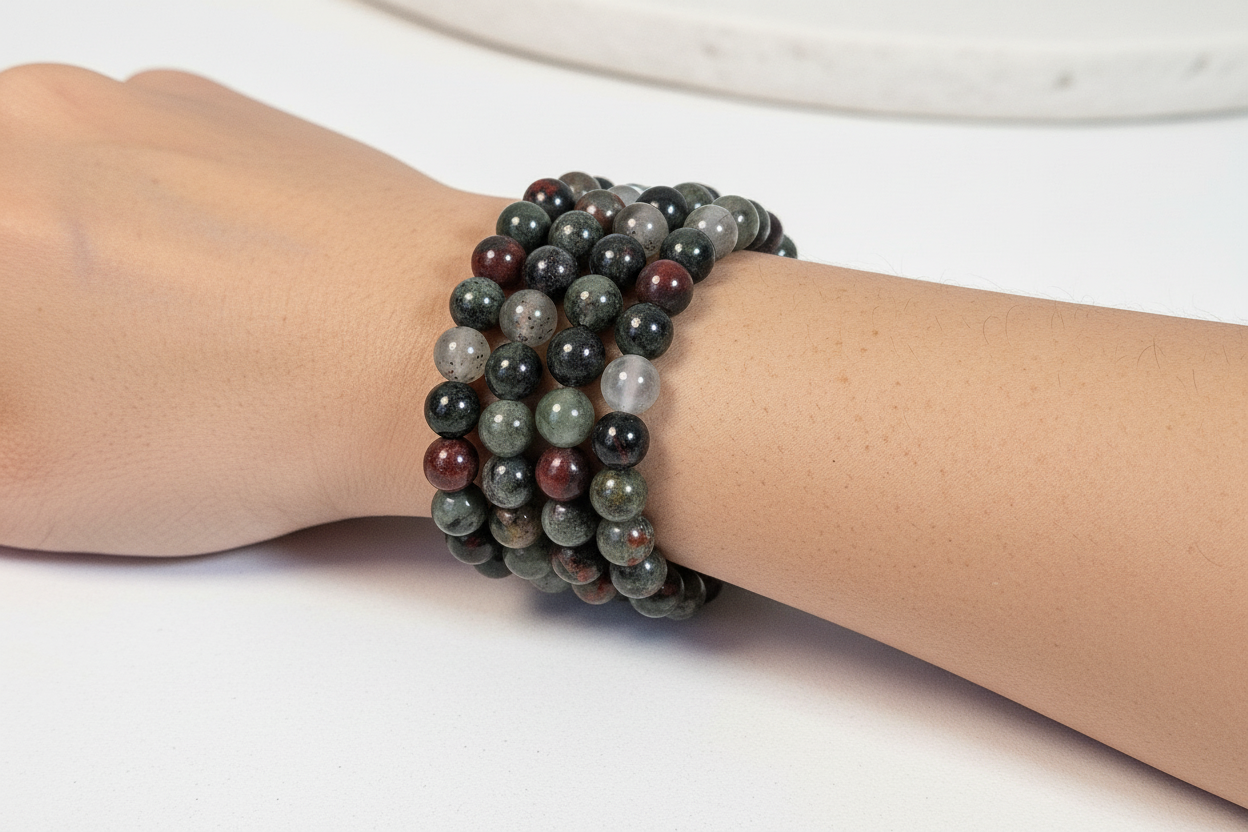 De Afrikaanse Bloedsteen armband (6 mm) is een krachtige edelsteenarmband met diepe groentinten en subtiele rode accenten. Deze bijzondere steen staat bekend om zijn aardende en beschermende energie en wordt vaak gedragen om kracht, moed en vitaliteit te ondersteunen.