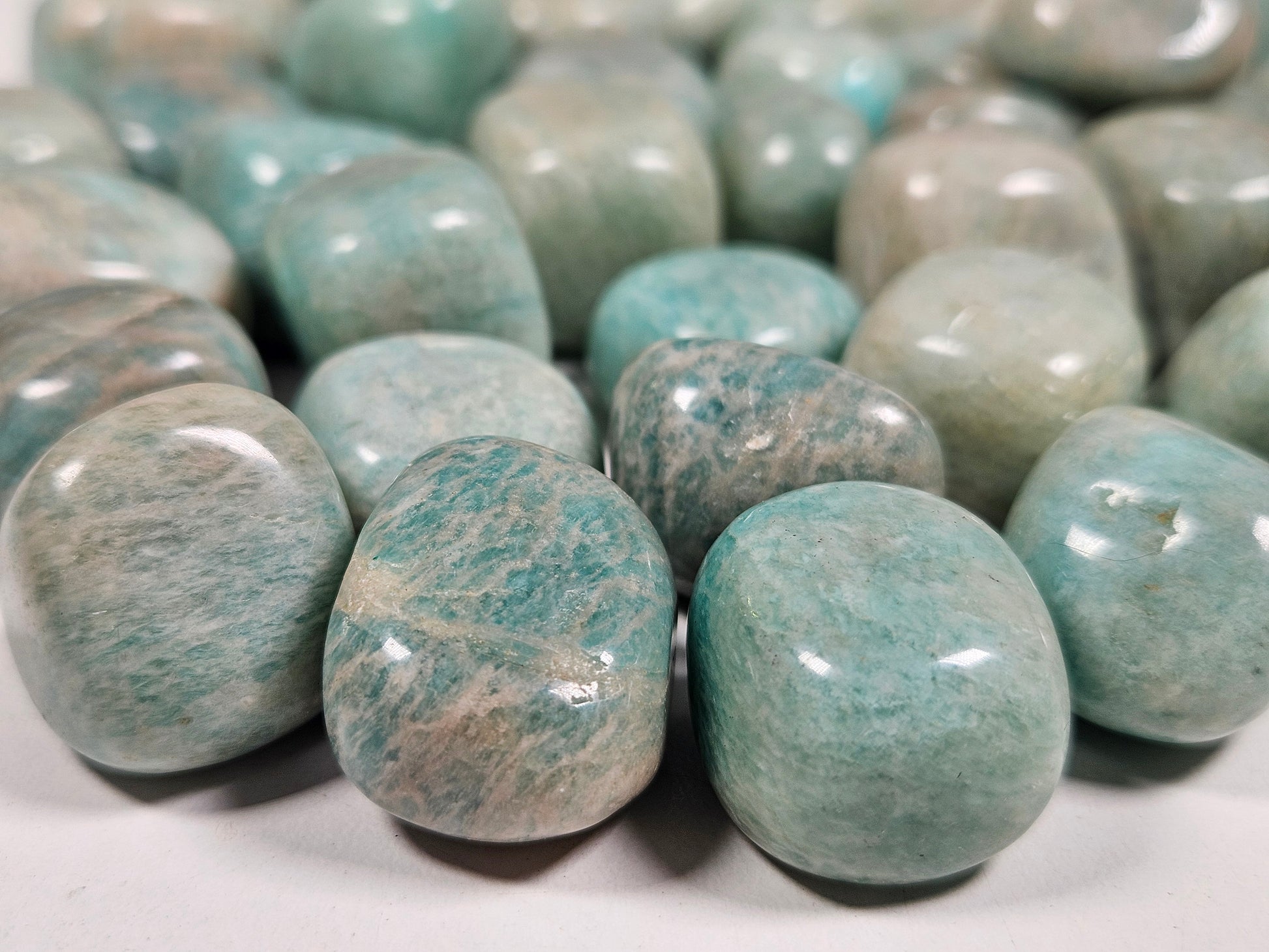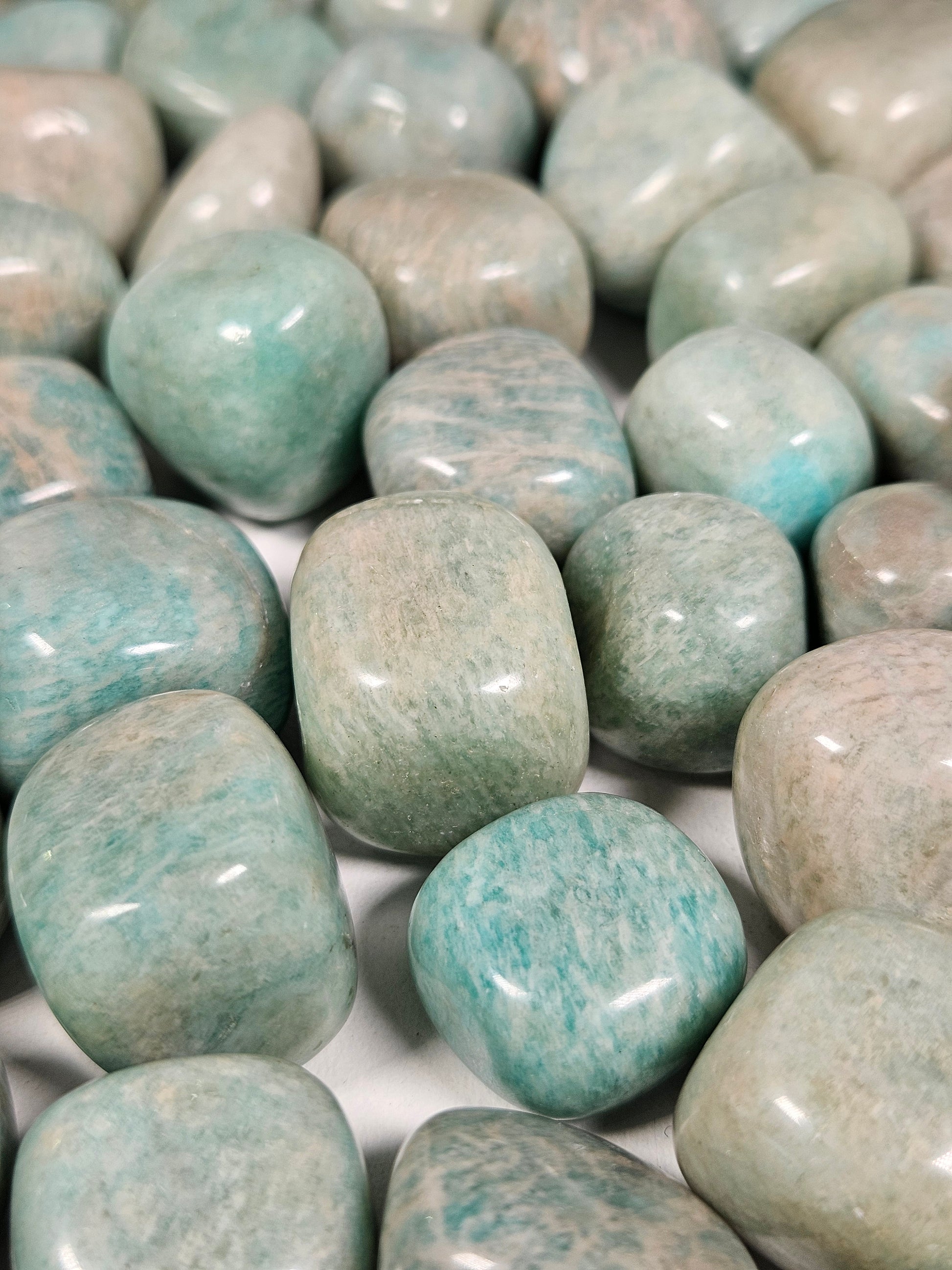 Amazoniet trommelsteen van ongeveer 2 cm is een prachtige steen met zachte blauwgroene tinten. Deze gladde, gepolijste steen ligt prettig in de hand en is ideaal om bij je te dragen als dagelijkse ondersteuning.