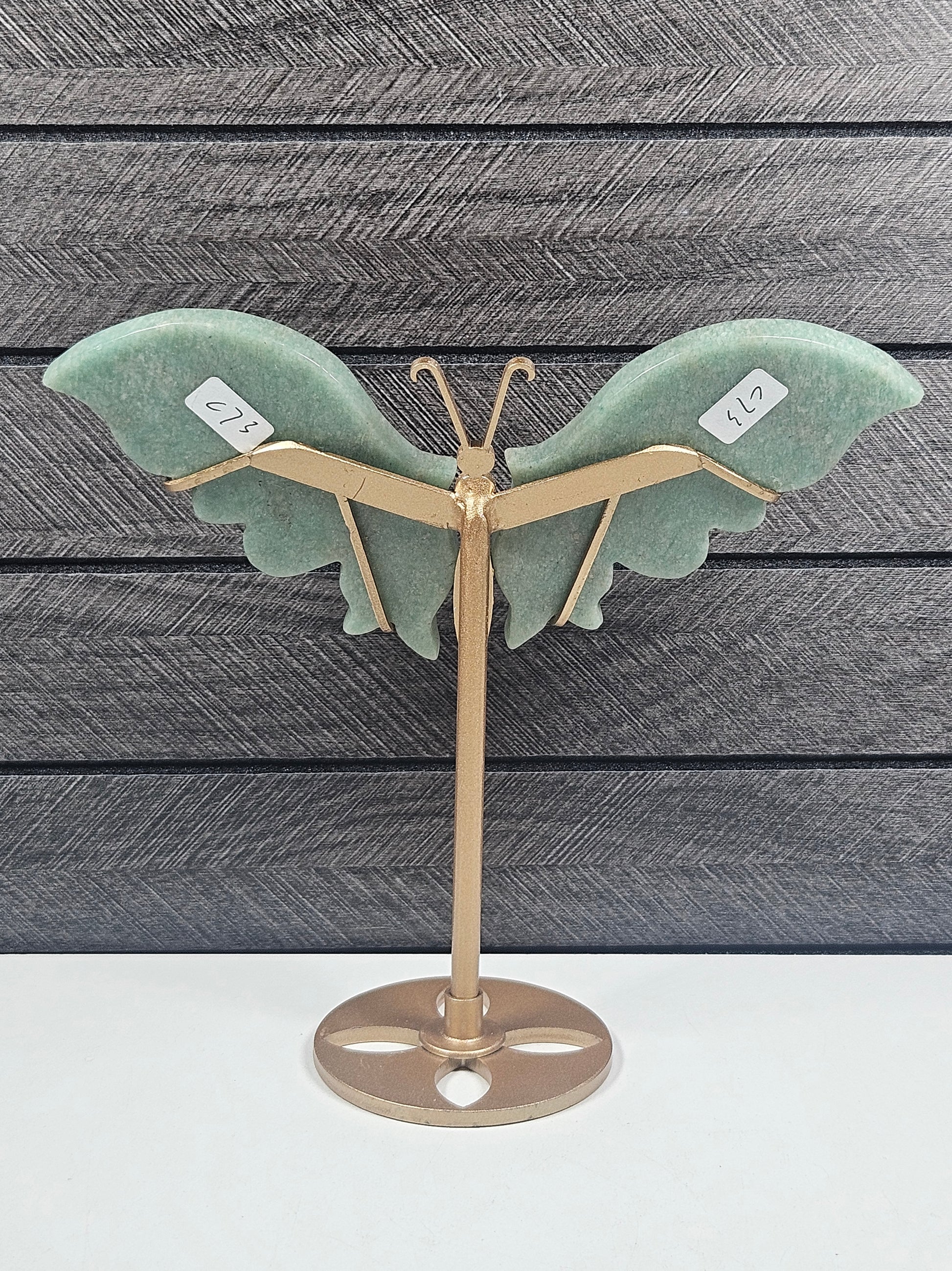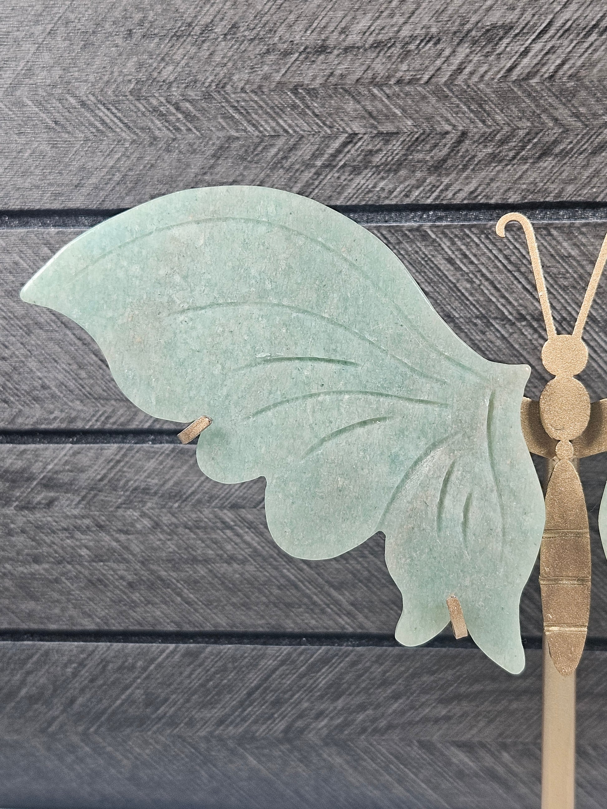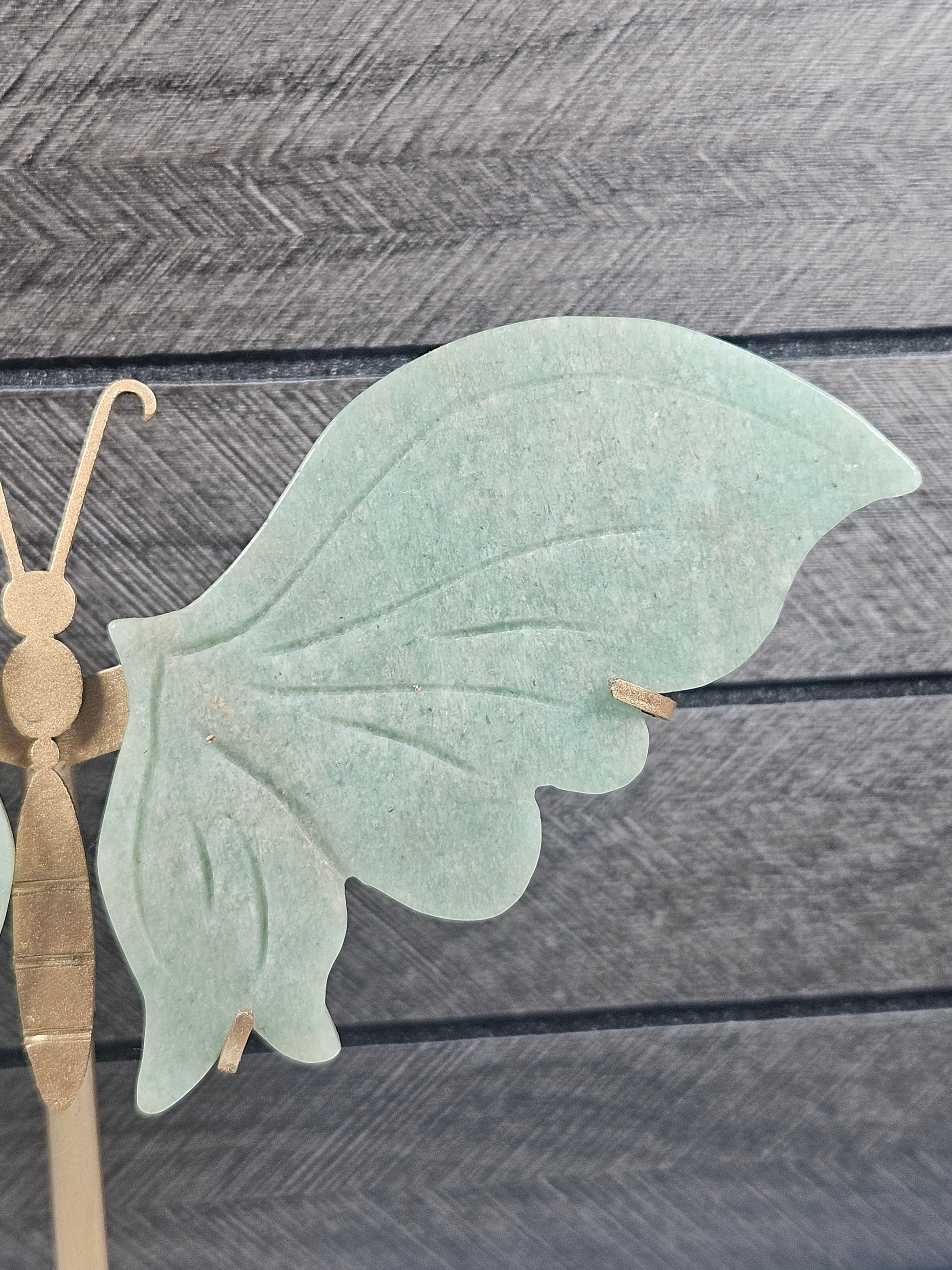 Deze prachtige amazoniet vlinder straalt rust en zachtheid uit met haar frisse groenblauwe tinten. De natuurlijke kleurvariaties geven de vleugels een levendige, maar tegelijkertijd kalmerende uitstraling, waardoor dit stuk direct opvalt zonder overheersend te zijn.