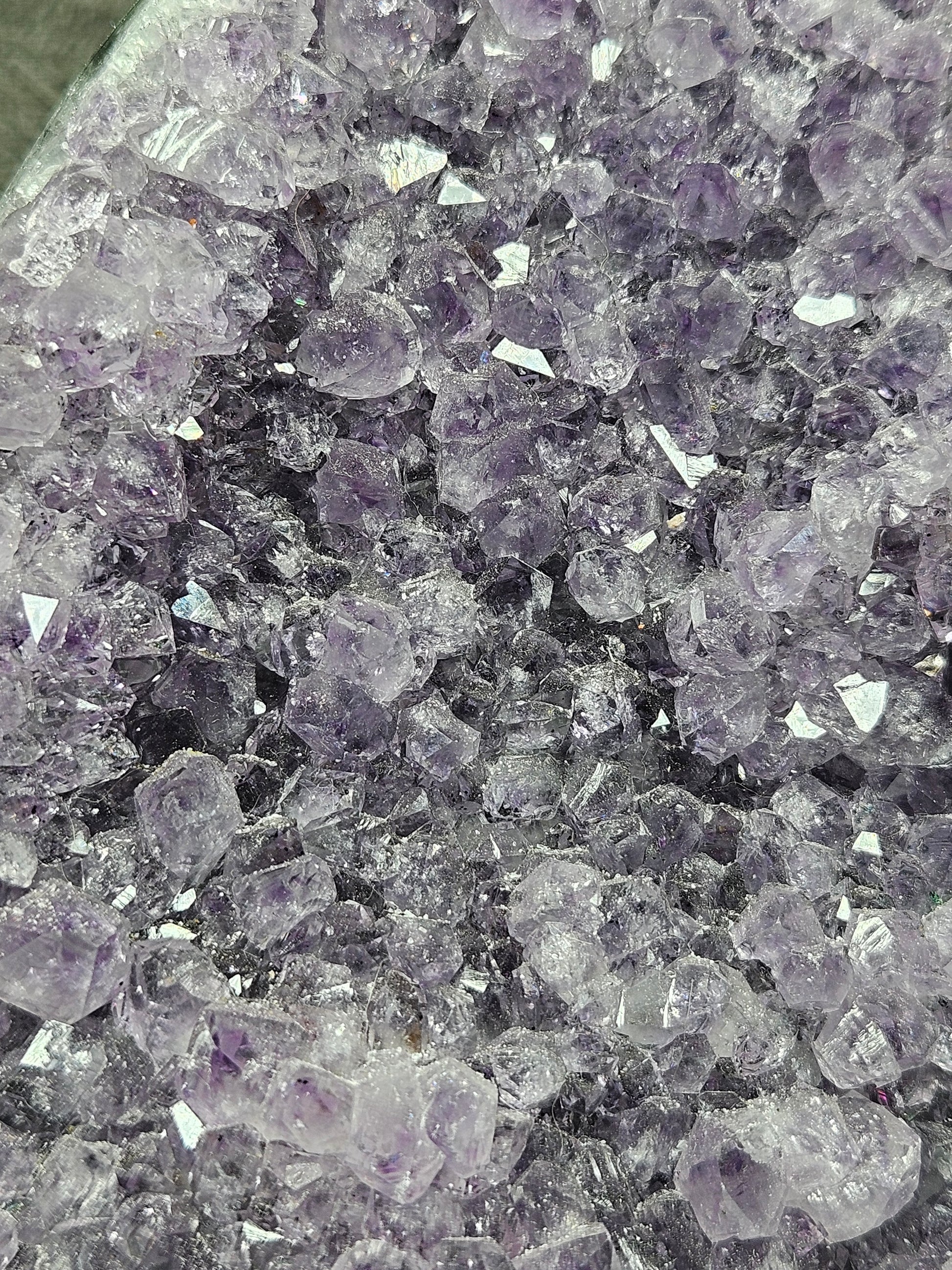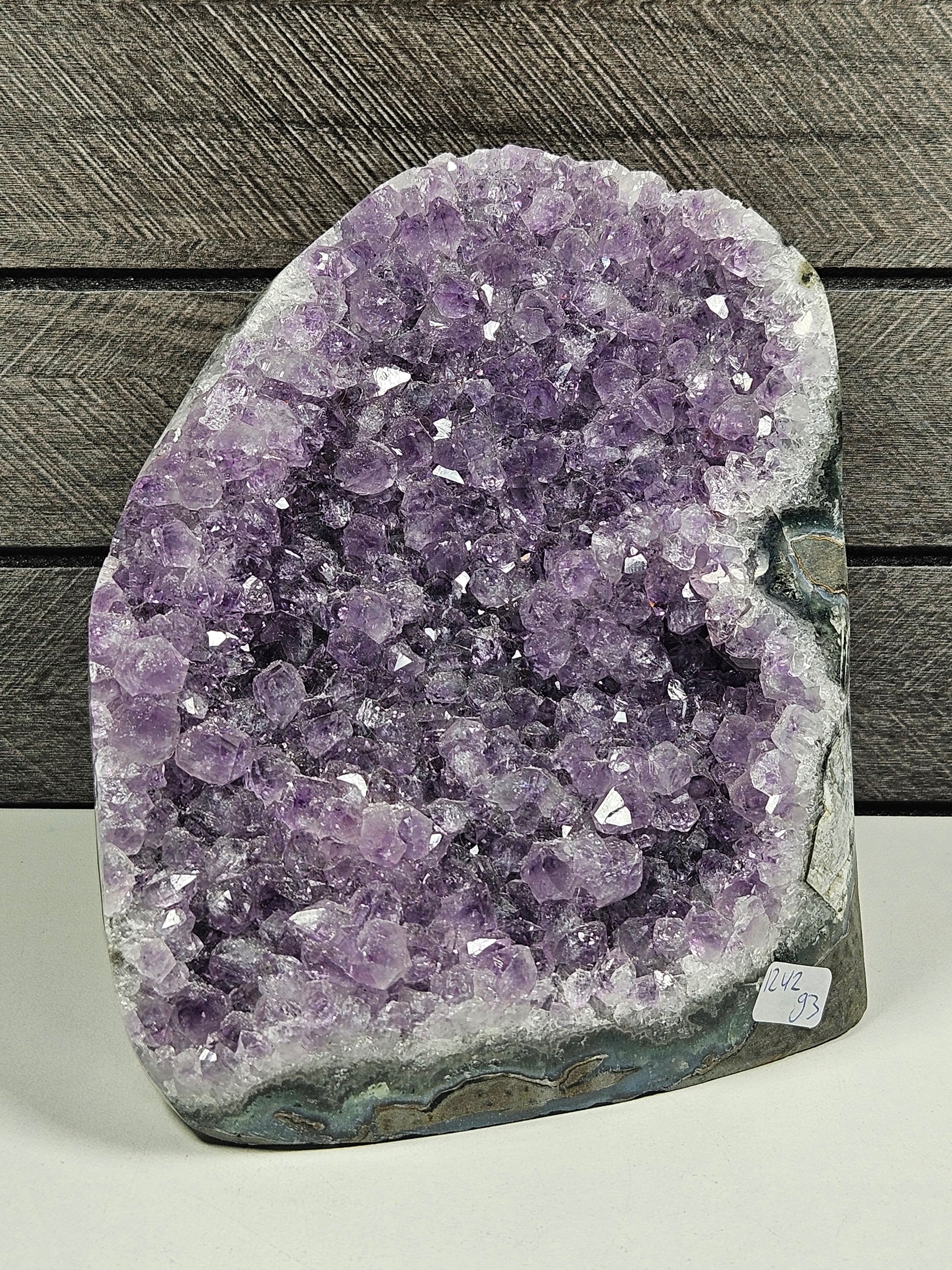 Deze Amethist op standvlak is een krachtig en elegant natuurproduct met een diepe paarse kleur en natuurlijke kristalstructuren. Met een gewicht van 1242 gram en afmetingen van 11,5 cm hoog en 10,5 cm breed is dit een stevig en indrukwekkend stuk dat dankzij het standvlak stabiel rechtop geplaatst kan worden.