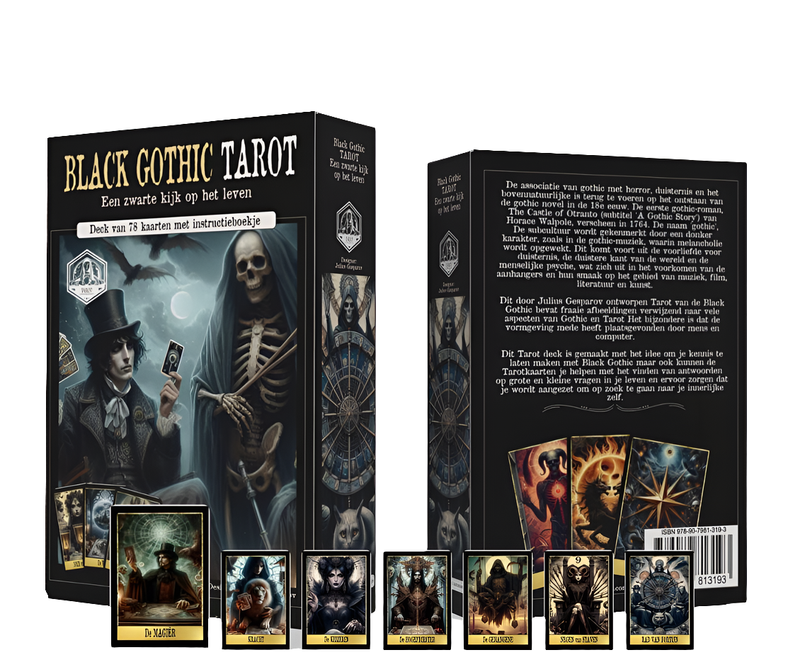 De associatie van gothic met horror, duisternis en het bovennatuurlijke is terug te voeren op het ontstaan van de gothic novel in de 18e eeuw. De eerste gothic-roman, The Castle of Otranto (subtitel 'A Gothic Story') van Horace Walpole, verscheen in 1764. De naam 'gothic', De subcultuur wordt gekenmerkt door een donker karakter, zoals in de gothic-muziek, waarin melancholie wordt opgewekt. Dit komt voort uit de voorliefde voor duisternis, de duistere kant van de wereld en de menselijke psyche, wat zich uit in het voorkomen van de aanhangers en hun smaak op het gebied van muziek, film, literatuur en kunst. Dit door Julius Gesparov ontworpen Tarot van de Black Gothic bevat fraaie afbeeldingen verwijzend naar vele aspecten van Gothic en Tarot Het bijzondere is dat de vormgeving mede heeft plaatsgevonden door mens en computer. Dit Tarot deck is gemaakt met het idee om je kennis te laten maken met Black Gothic maar ook kunnen de Tarotkaarten je helpen met het vinden van antwoorden op grote en kleine vragen in je leven en ervoor zorgen dat je wordt aangezet om op zoek te gaan naar je innerlijke zelf.