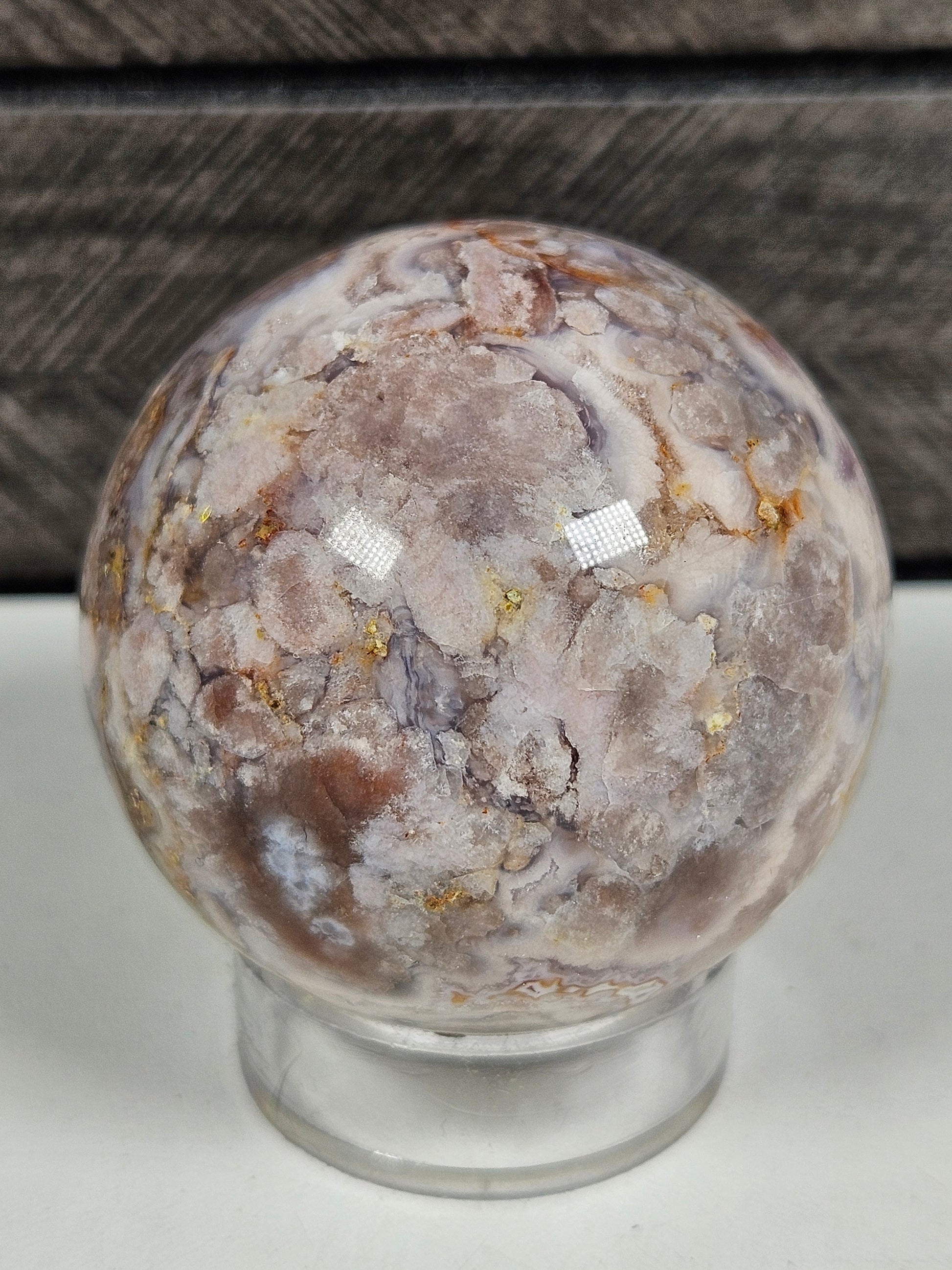 Deze bloemagaat bol is een uniek stuk natuursteen. De kenmerkende patronen zijn volledig natuurlijk gevormd, waardoor elke bol een eigen karakter en uitstraling heeft. Je ontvangt precies het exemplaar dat op de foto staat.