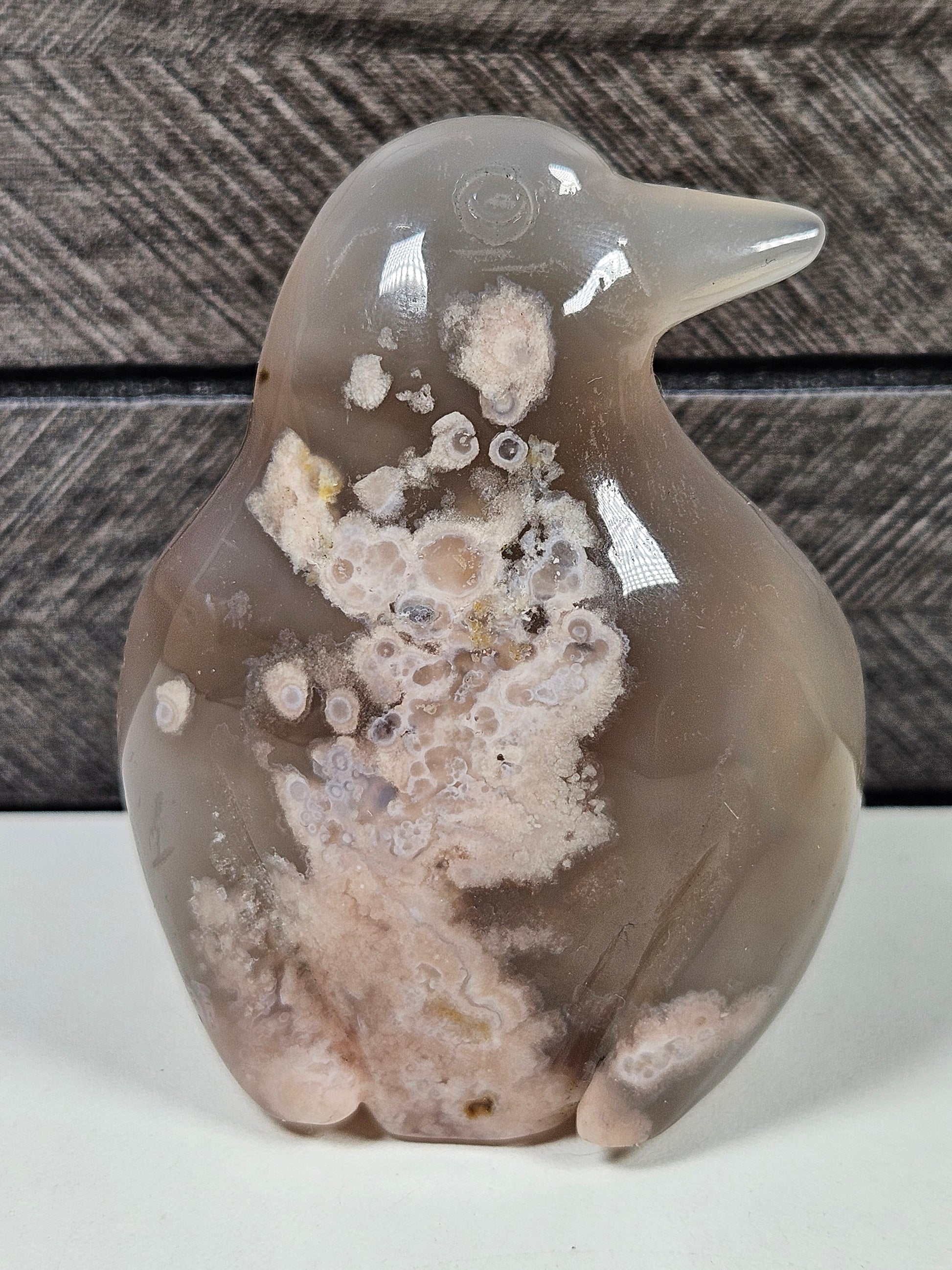 Deze prachtige bloemagaat sculptuur in de vorm van een pinguïn is een bijzonder en speels edelsteenbeeld met zachte, natuurlijke tinten. De steen heeft kenmerkende bloemachtige patronen die lijken op kleine bloesems in de steen. Deze unieke structuren geven het beeld een rustige en harmonieuze uitstraling.