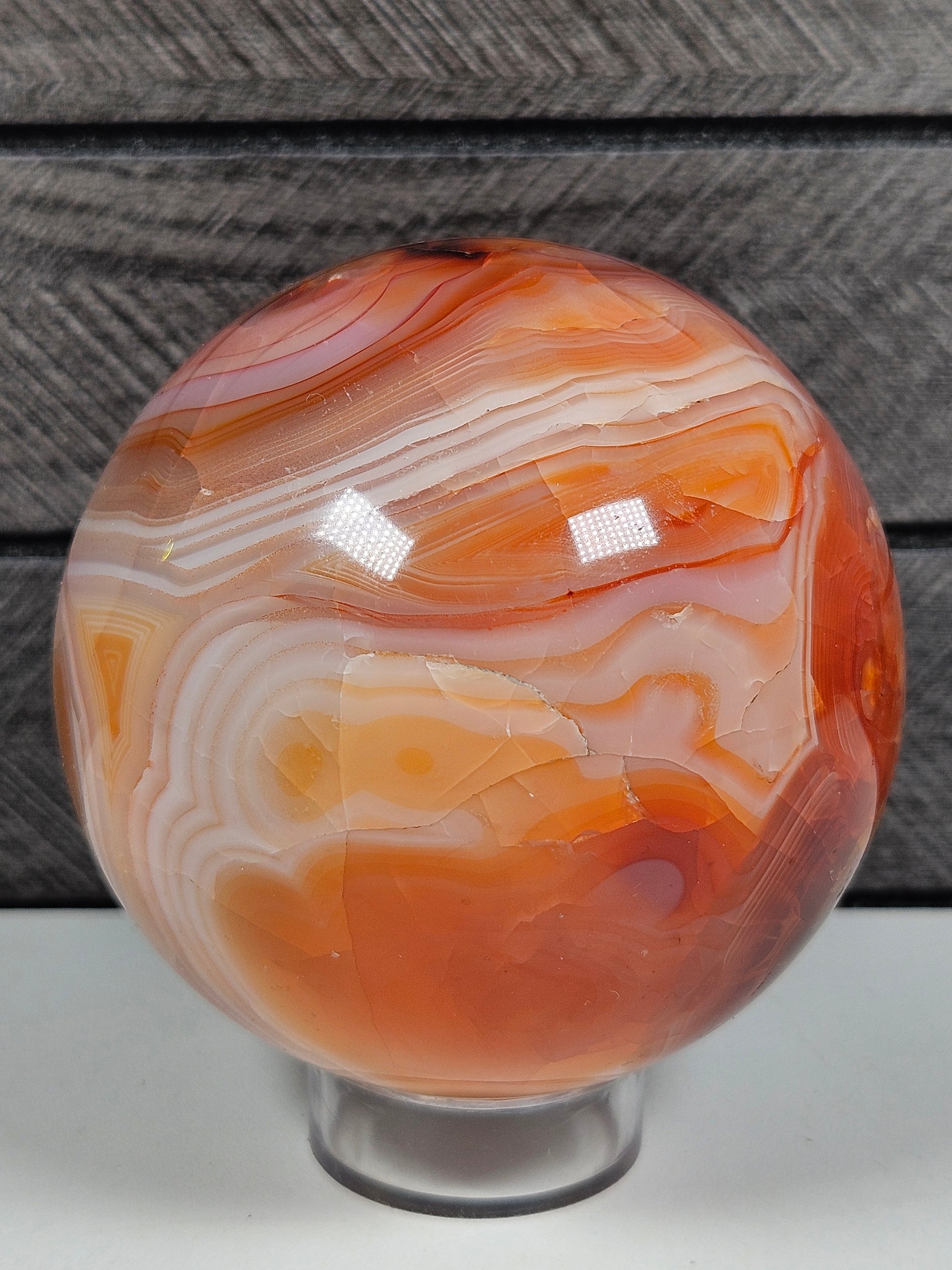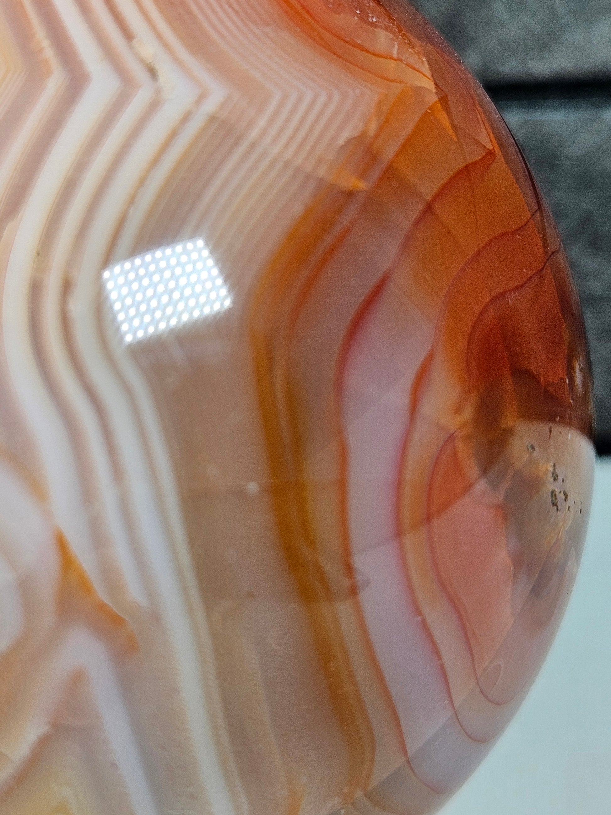 Deze prachtige carneool bol heeft warme tinten van oranje, rood en wit die vloeiend in elkaar overlopen. De steen heeft een levendige en energieke uitstraling met een zachte glans die het natuurlijke karakter mooi benadrukt. Door de bolvorm komt het kleurenspel vanuit elke hoek prachtig naar voren, wat dit stuk zowel krachtig als decoratief maakt.