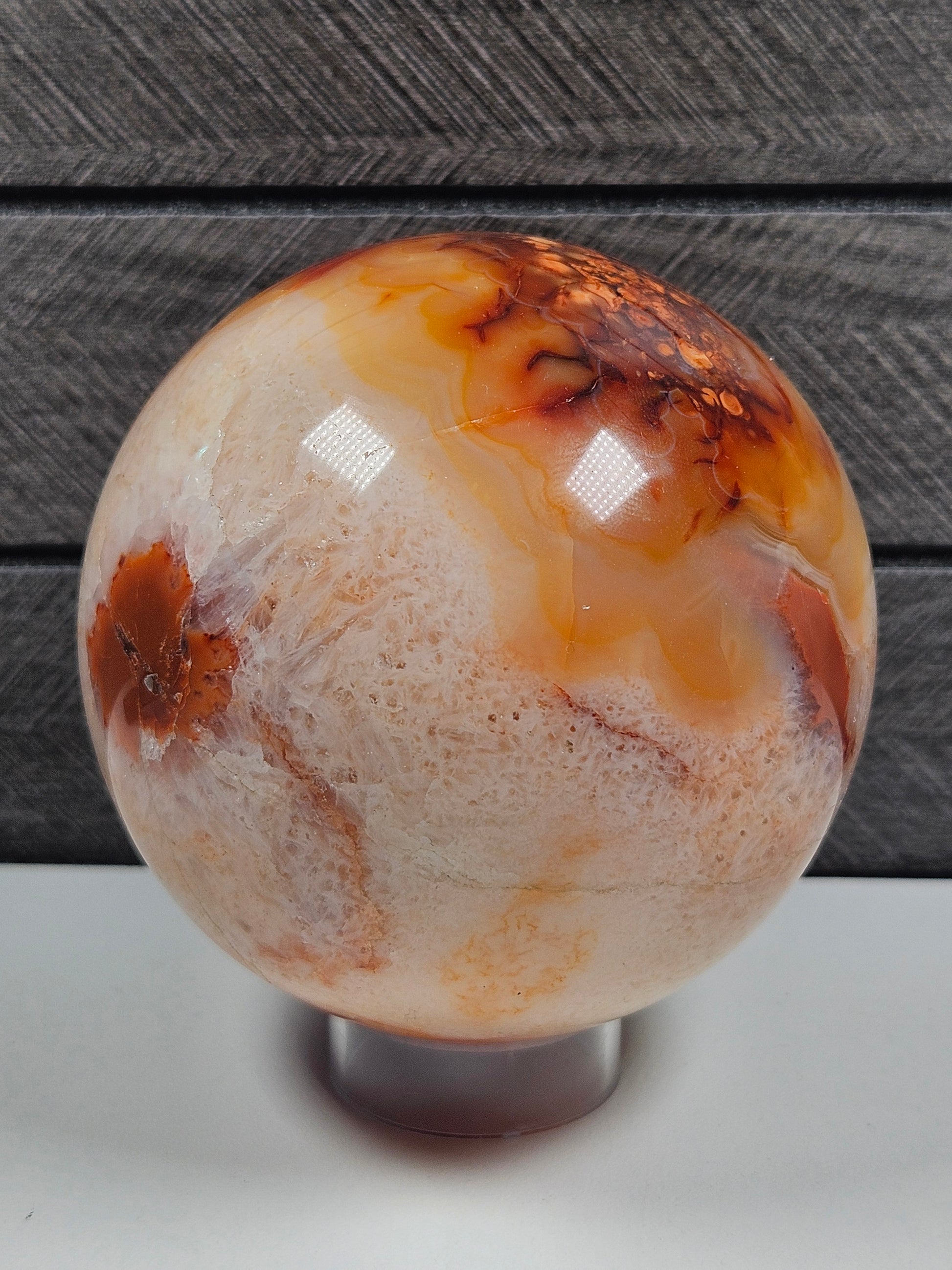 Dit specifieke exemplaar heeft een unieke kleurverdeling en natuurlijke tekening. Door het formaat ligt de bol prettig in de hand en is hij ook zeer geschikt voor plaatsing op een bolhouder, plank of bureau.