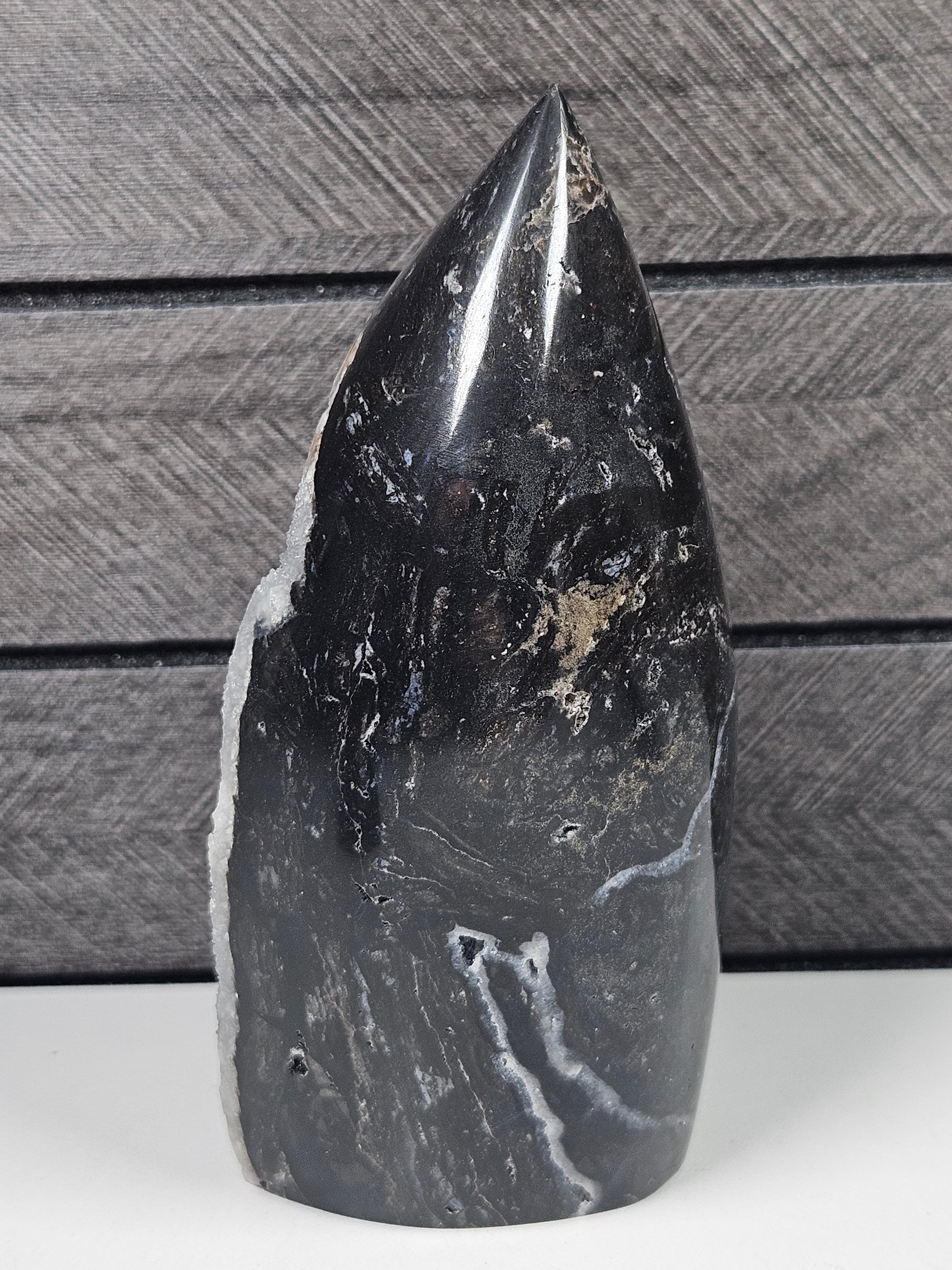 Dit specifieke exemplaar heeft een unieke vorm en natuurlijke tekening. Dankzij het slanke maar stabiele formaat staat de sculptuur stevig en is hij eenvoudig te plaatsen op een bureau, plank, altaar of in een edelstenenverzameling.