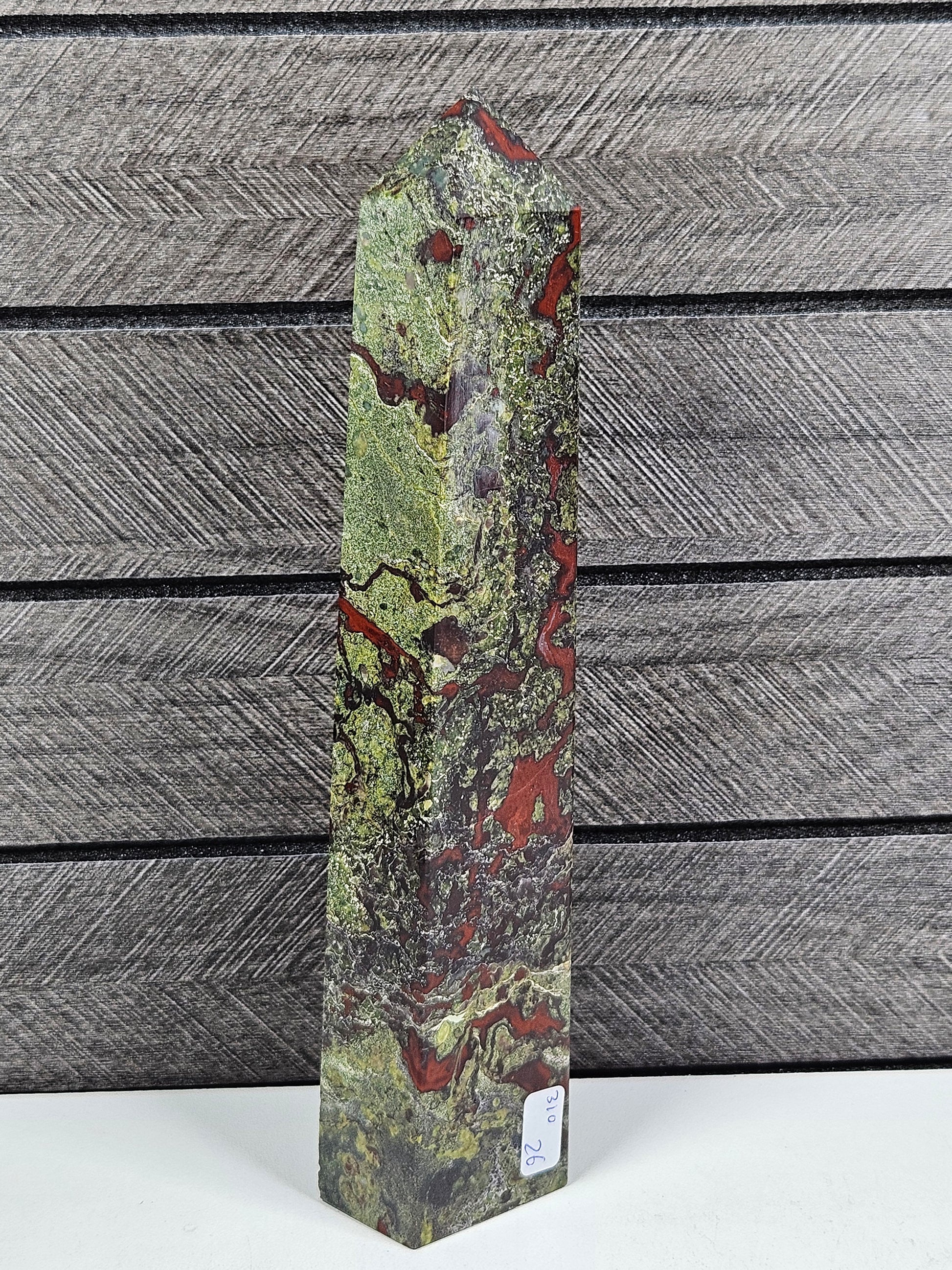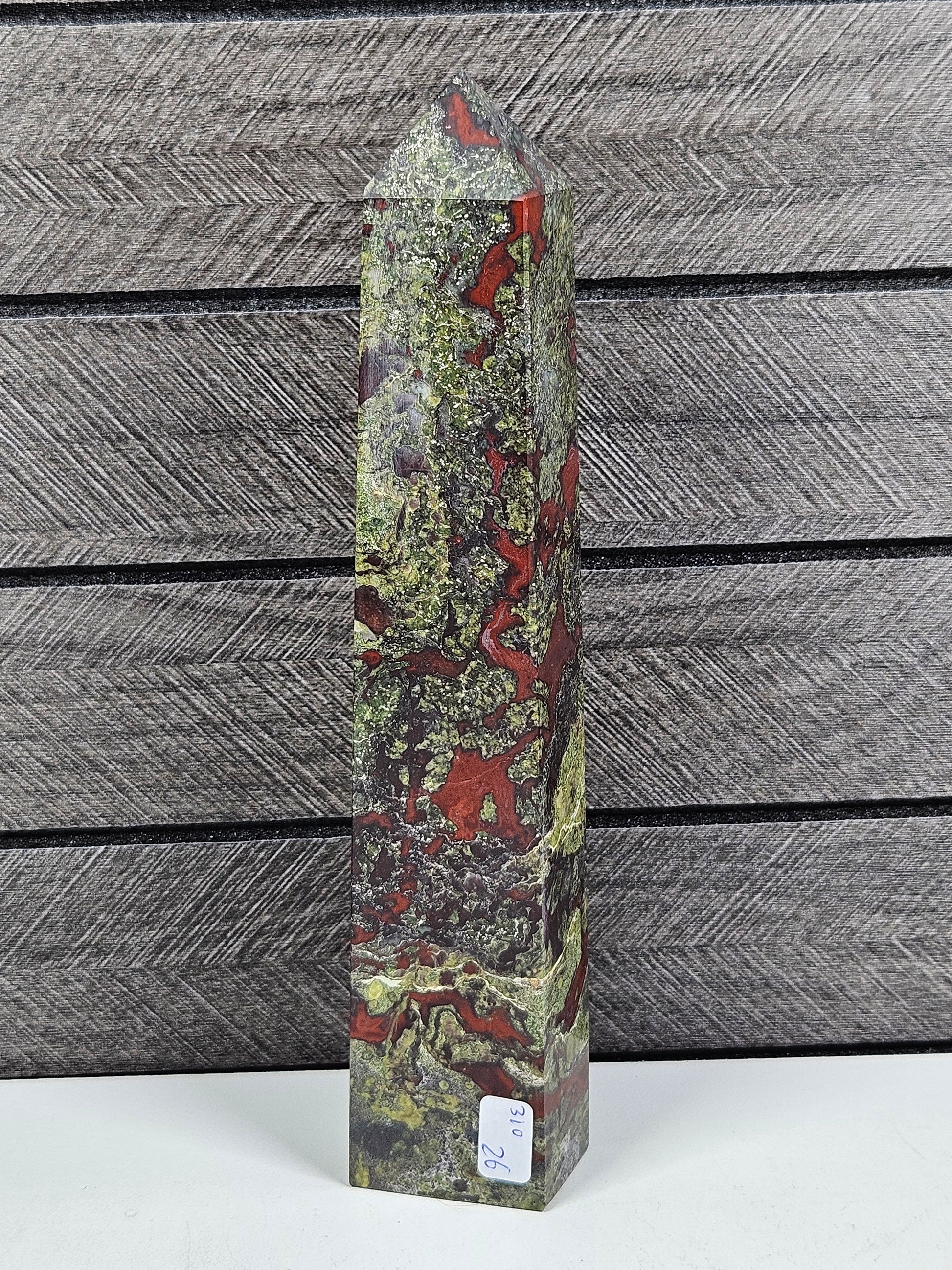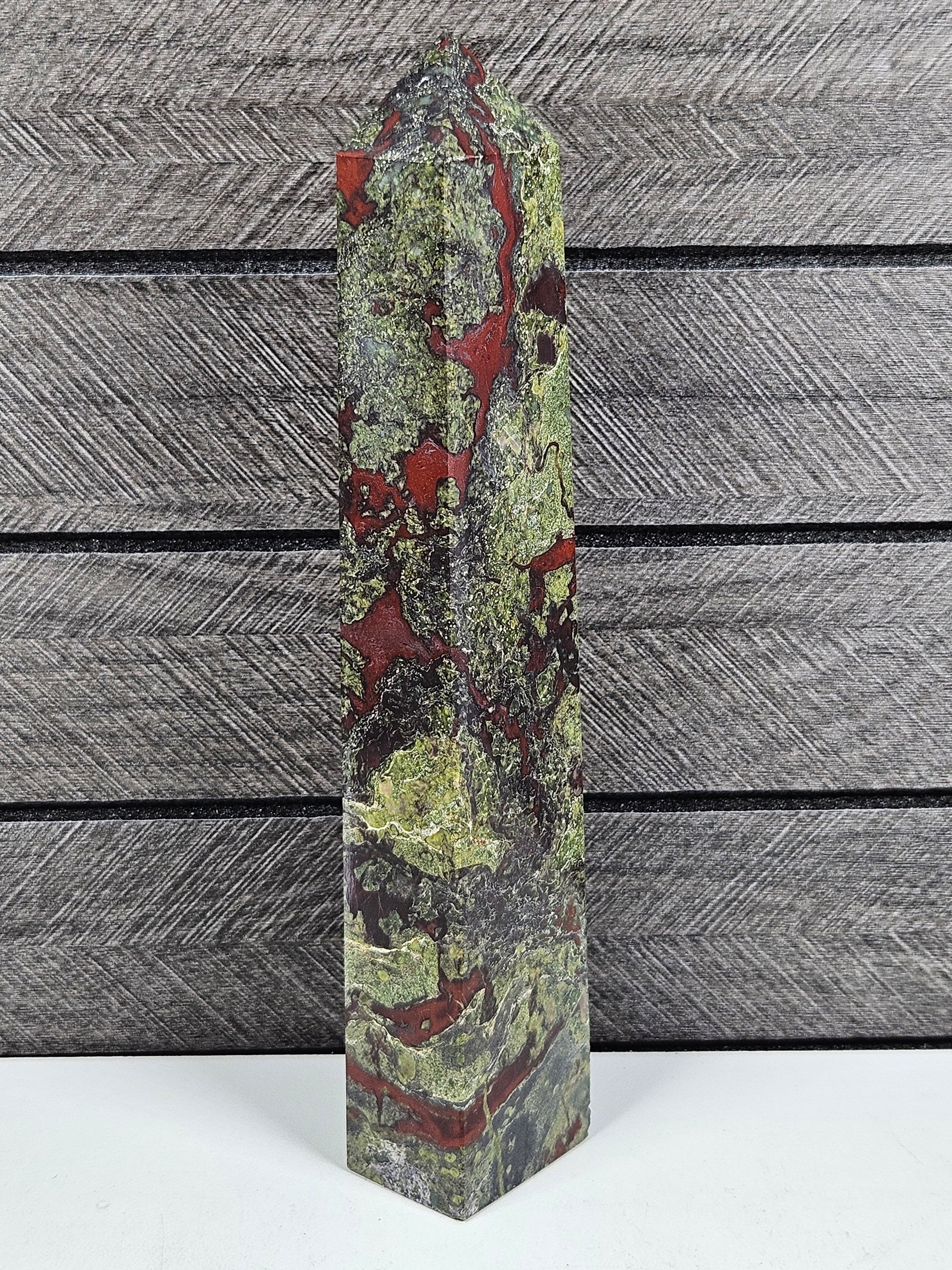 Deze prachtige drakenbloed toren heeft een krachtige en aardse uitstraling met een bijzonder samenspel van diepe groene en roodachtige tinten. De natuurlijke patronen geven de steen een levendig en karaktervol uiterlijk. Dankzij de torenvorm wordt de energie van de steen versterkt en omhoog geleid, terwijl de unieke tekening vanuit elke hoek mooi zichtbaar blijft.