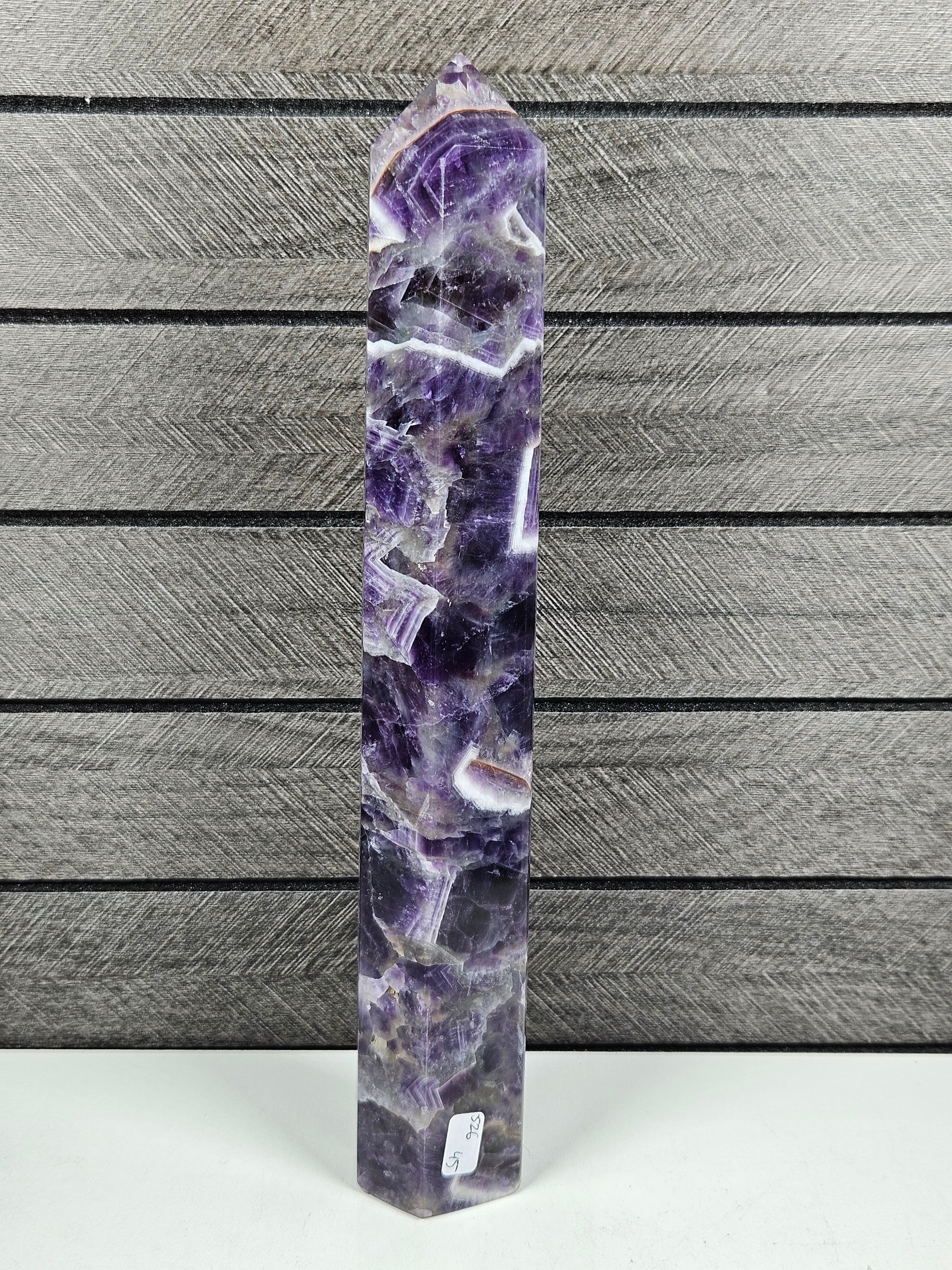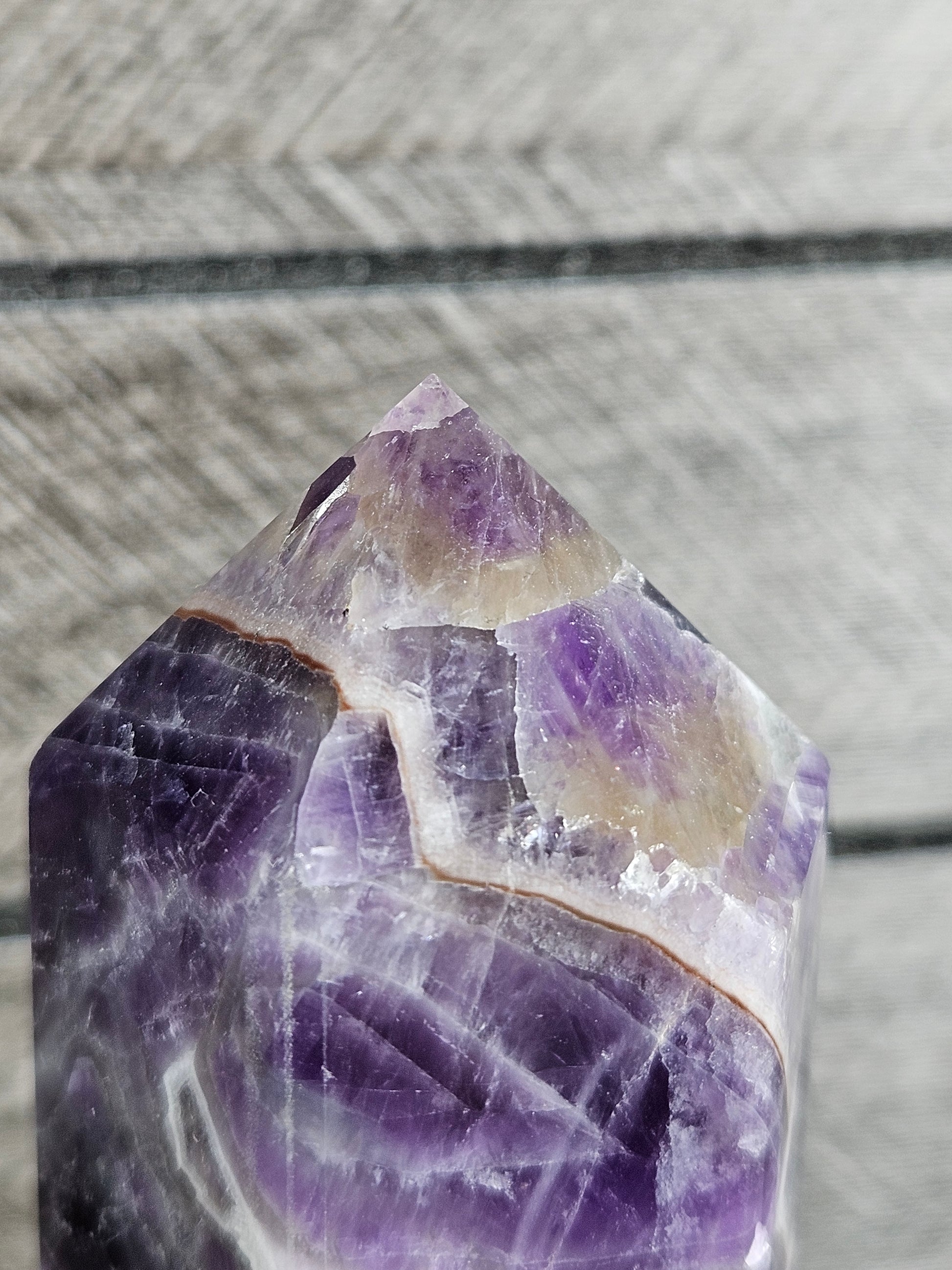Deze dream amethist toren is een uniek stuk natuursteen. Kleur, patronen en structuren zijn volledig natuurlijk gevormd, waardoor elke toren een eigen karakter en uitstraling heeft. Je ontvangt precies het exemplaar dat op de foto staat.