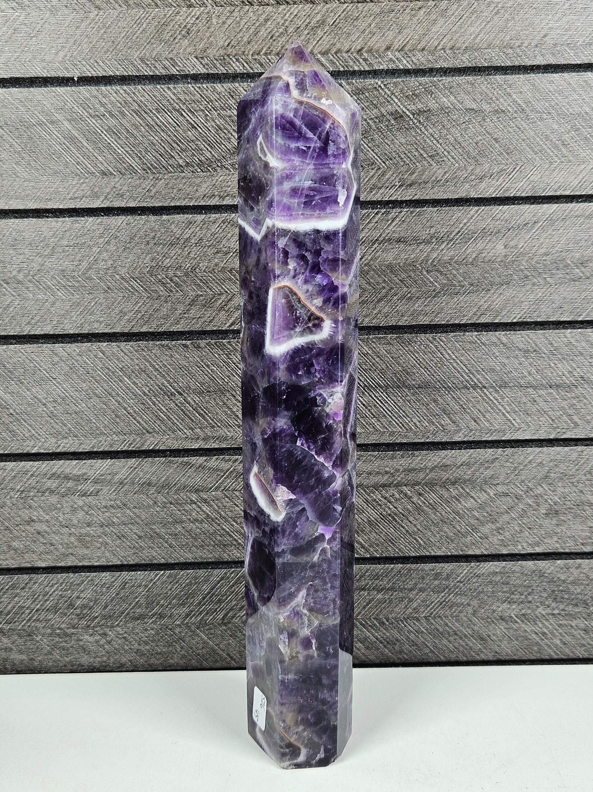 Deze prachtige dream amethist toren heeft een diepe en mystieke uitstraling met mooie paarse tinten en kenmerkende witte banden. De combinatie van kleuren en patronen geeft de steen een levendig en gelaagd karakter. Dankzij de torenvorm wordt de energie van de steen versterkt en mooi naar boven geleid, terwijl de natuurlijke tekening vanuit elke hoek zichtbaar blijft.
