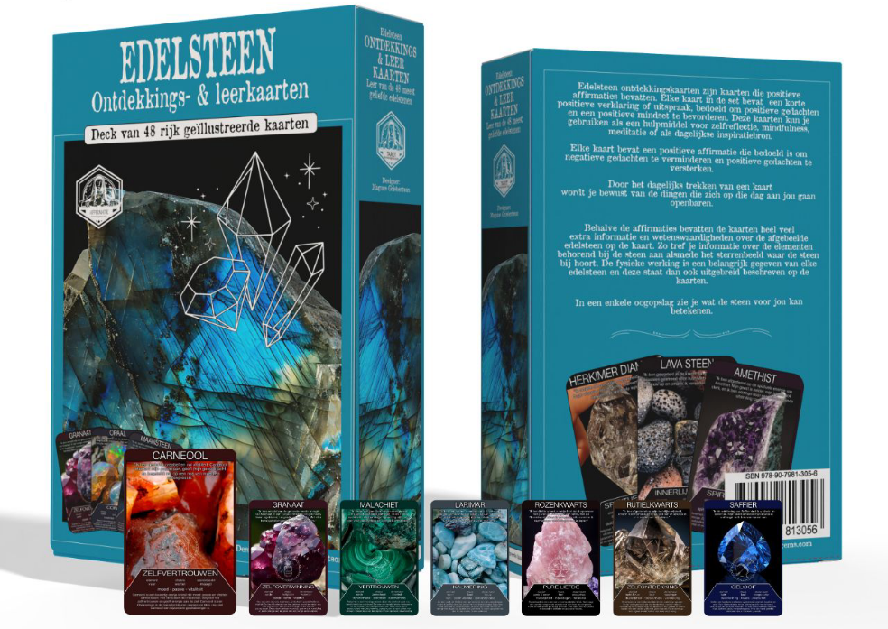 Edelsteen ontdekkingskaarten zijn kaarten die positieve affirmaties bevatten. Elke kaart in de set bevat een korte positieve verklaring of uitspraak, bedoeld om positieve gedachten en een positieve mindset te bevorderen. Deze kaarten kun je gebruiken als een hulpmiddel voor zelfreflectie, mindfulness, meditatie of als dagelijkse inspiratiebron. Elke kaart bevat een positieve affirmatie die bedoeld is om negatieve gedachten te verminderen en positieve gedachten te versterken. Door het dagelijks trekken van een kaart wordt je bewust van de dingen die zich op die dag aan jou gaan openbaren. Behalve de affirmaties bevatten de kaarten heel veel extra informatie en wetenswaardigheden over de afgebeelde edelsteen op de kaart. Zo tref je informatie over de elementen behorend bij de steen aan alsmede het sterrenbeeld waar de steen bij hoort. De fysieke werking is een belangrijk gegeven van elke edelsteen en deze staat dan ook uitgebreid beschreven op de kaarten. In een enkele oogopslag zie je wat de steen voor jou kan betekenen.