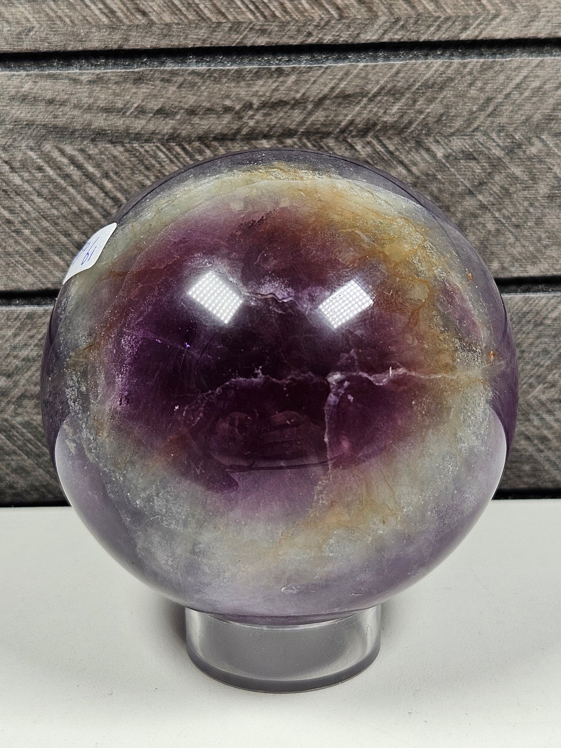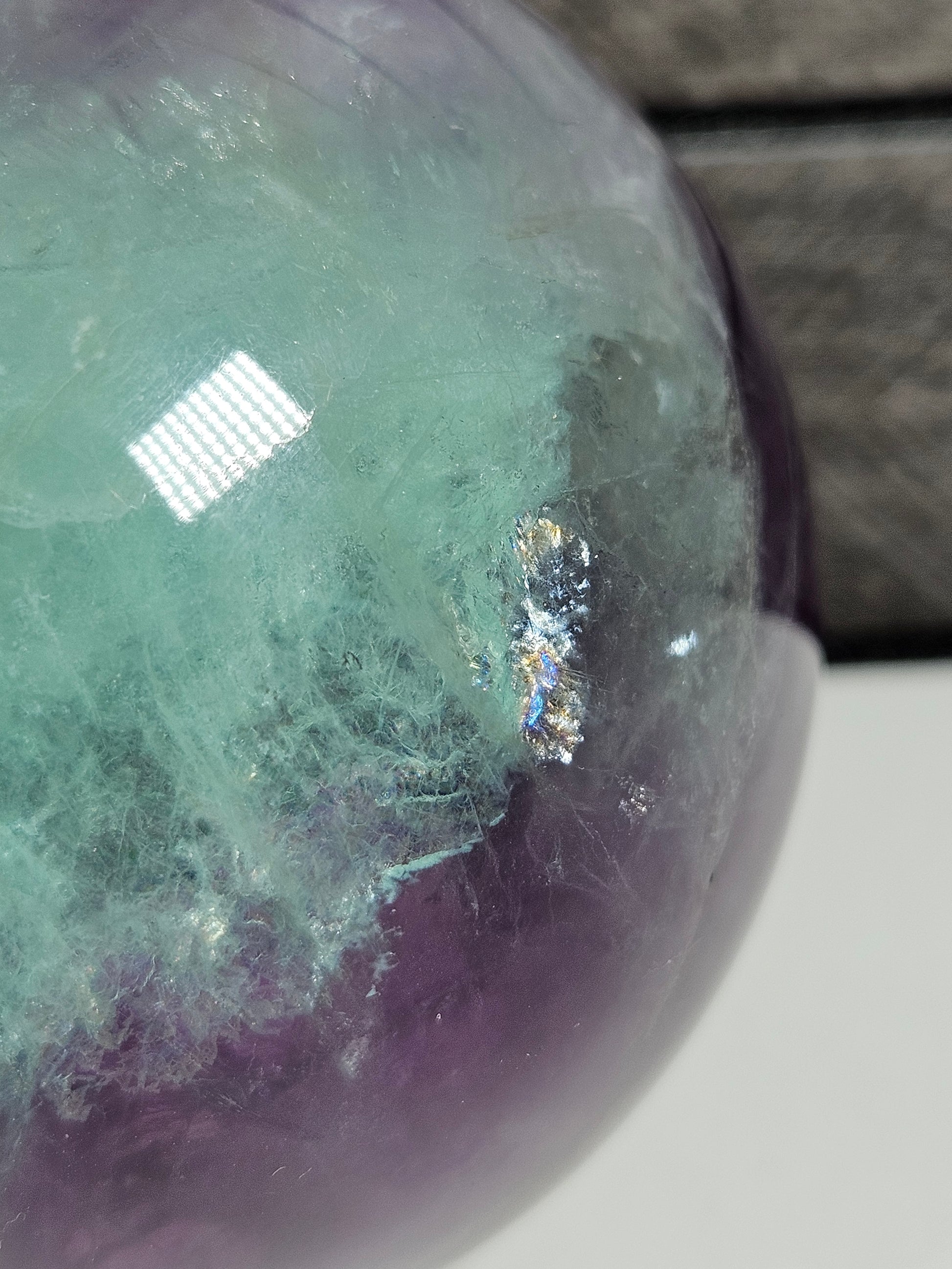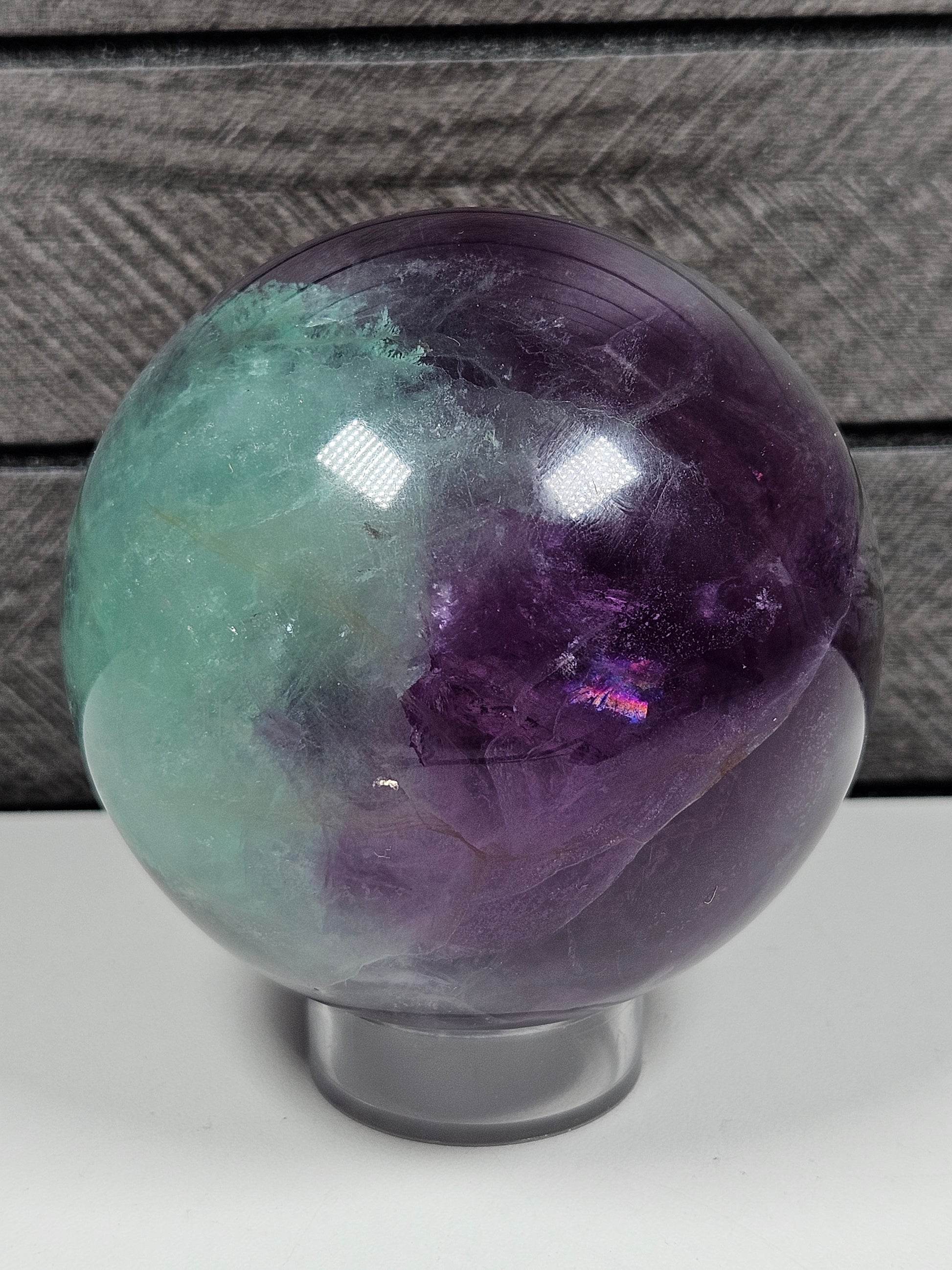 Dit specifieke exemplaar heeft een unieke kleurverdeling met een bijzondere combinatie van groen, paars en een vleugje geel. Door het royale formaat en gewicht heeft de bol een sterke aanwezigheid en komt hij prachtig tot zijn recht op een bolhouder, tafel, plank of in een edelstenenverzameling.