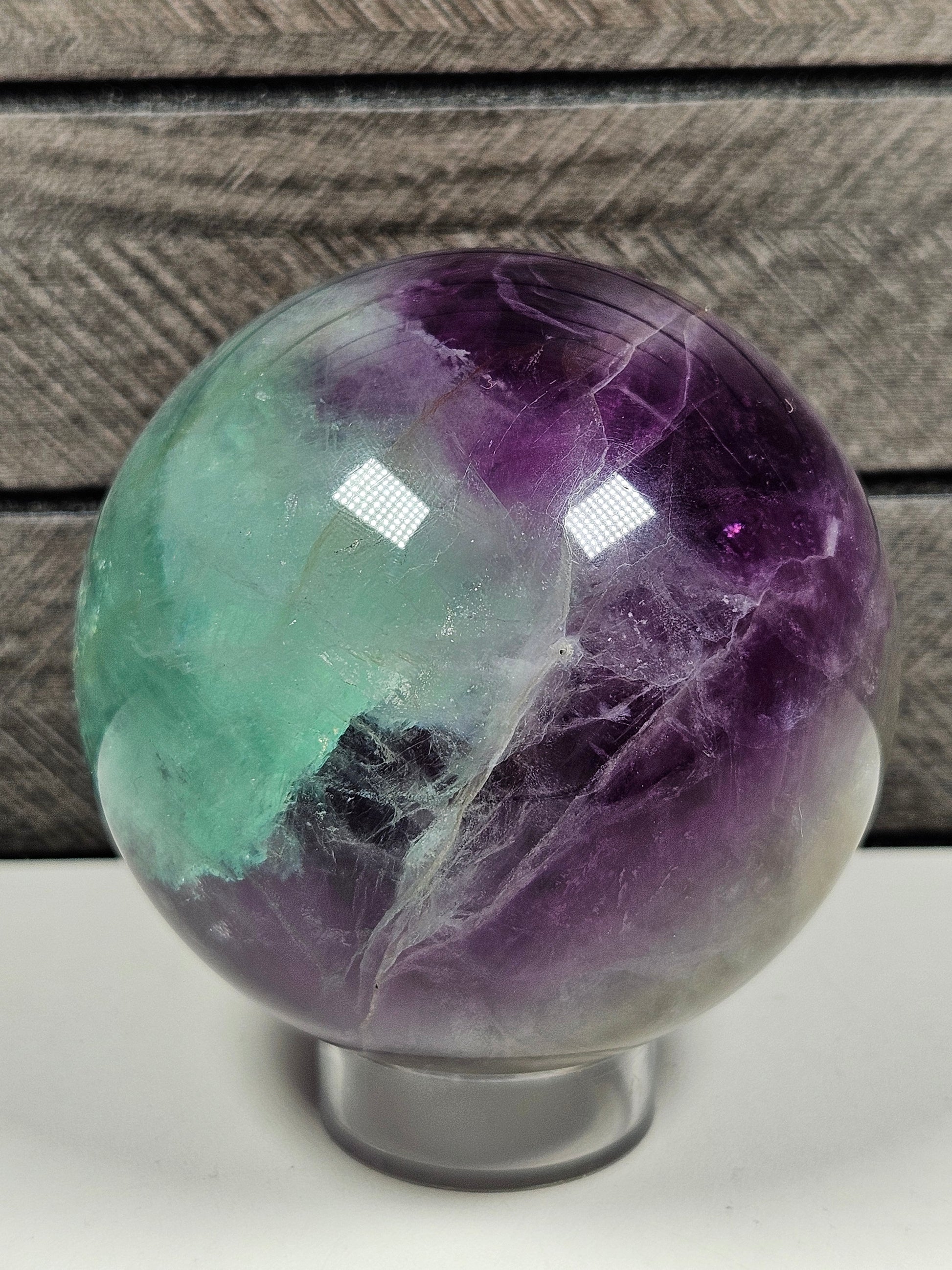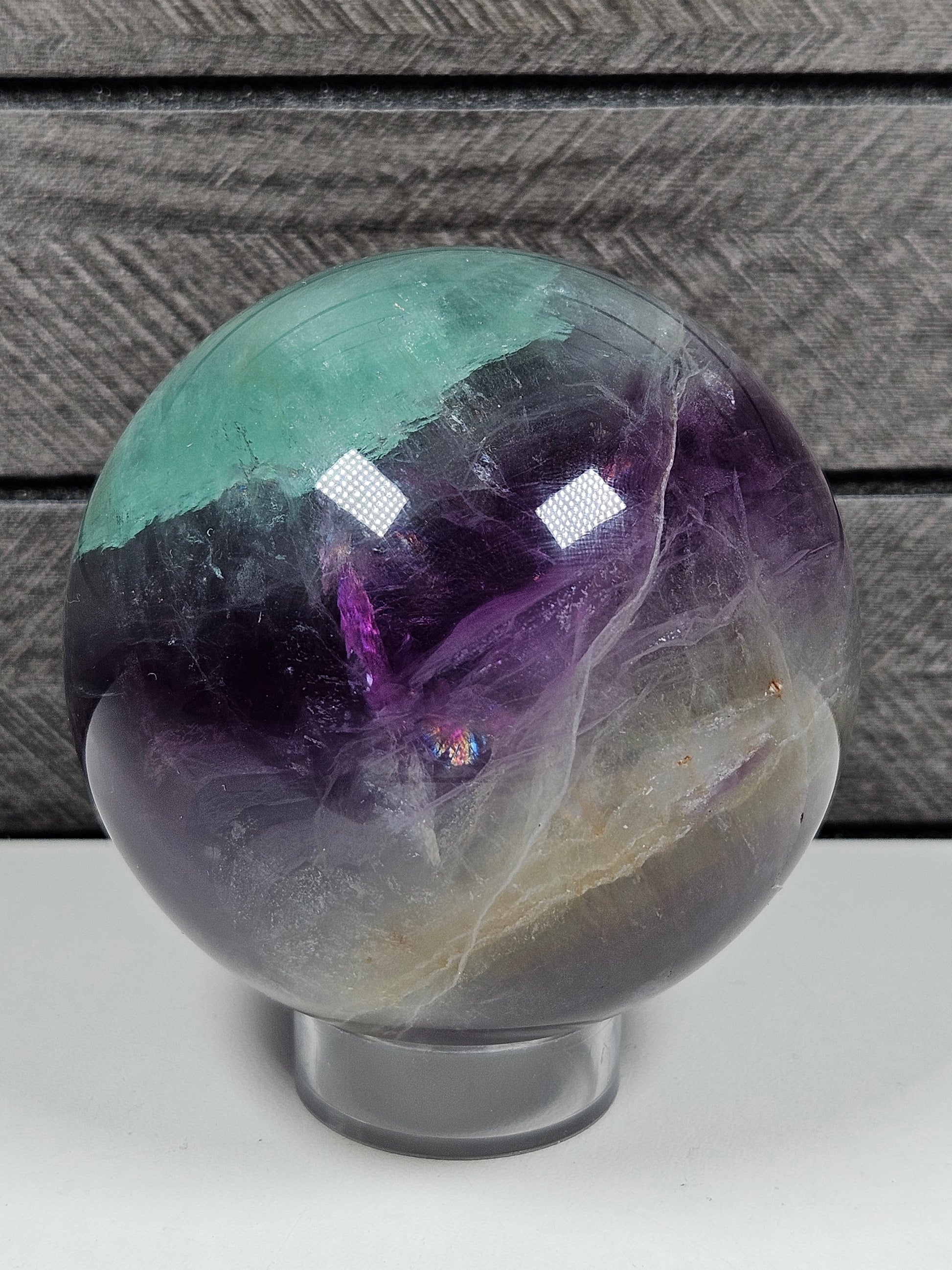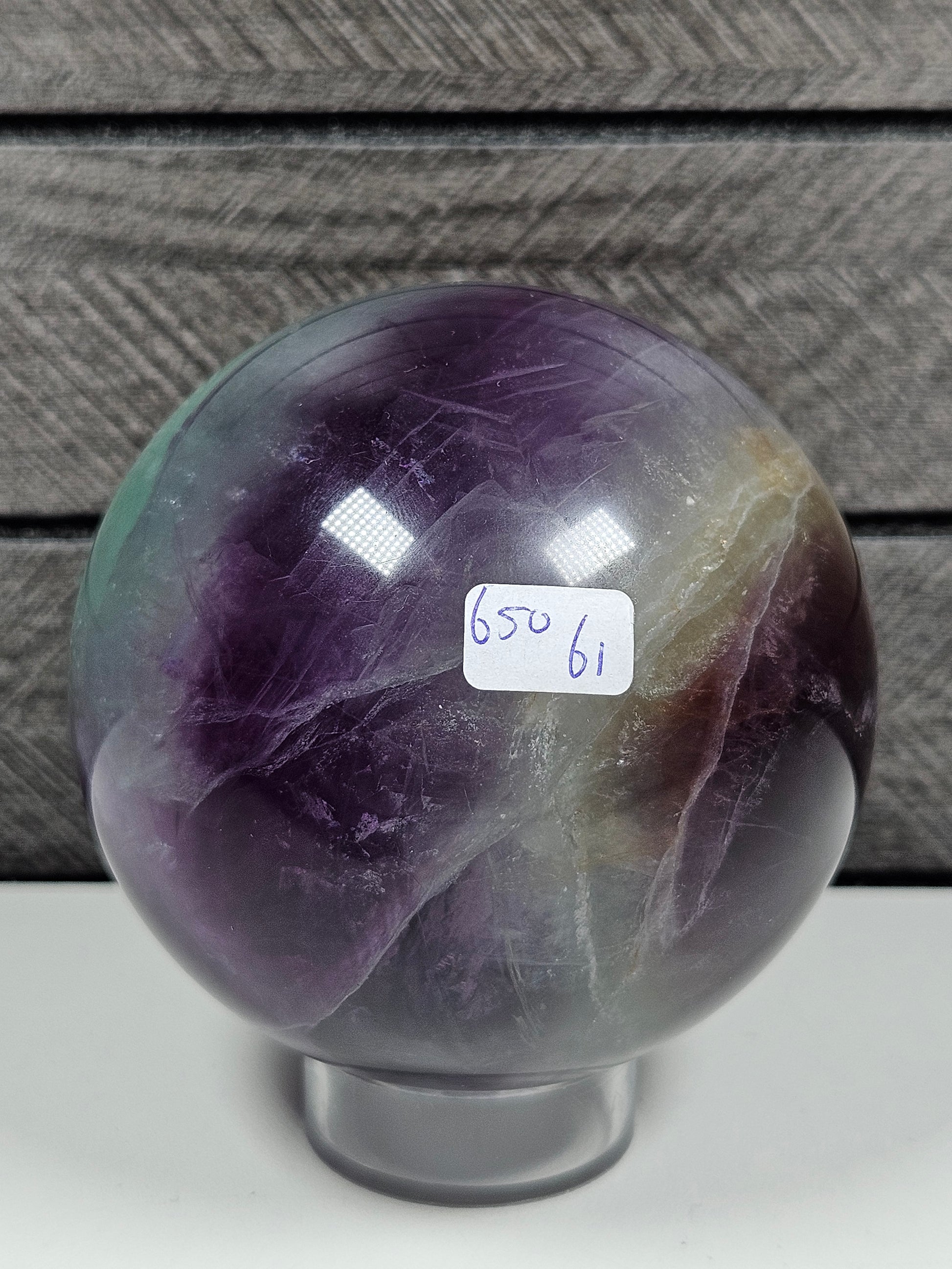 Dit specifieke exemplaar heeft een unieke kleurverdeling met een bijzondere combinatie van groen, paars en een vleugje geel. Door het royale formaat en gewicht heeft de bol een sterke aanwezigheid en komt hij prachtig tot zijn recht op een bolhouder, tafel, plank of in een edelstenenverzameling.