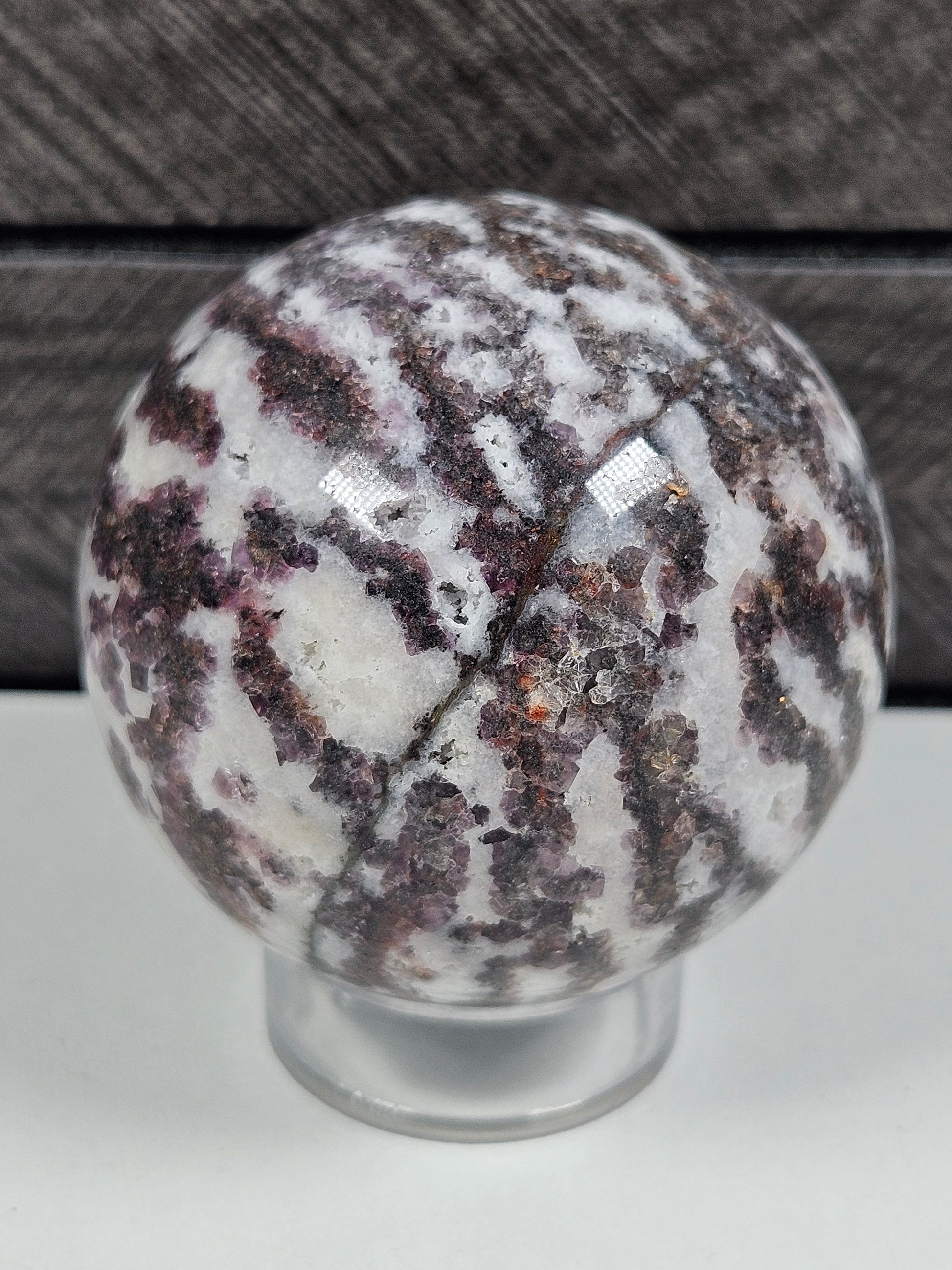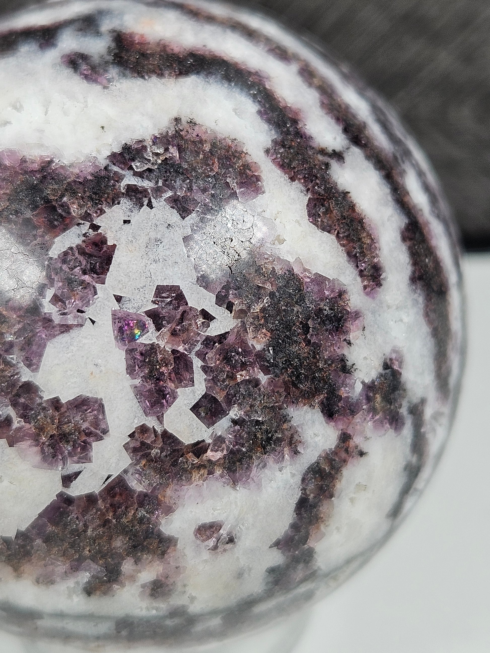 Dit specifieke exemplaar heeft een unieke kleurverdeling en natuurlijke overgangen tussen transparante, gekleurde en lichte zones. De gepolijste afwerking laat de diepte en gelaagdheid van de steen goed tot zijn recht komen. Door het compacte formaat is deze Fluoriet / Calciet bol geschikt voor plaatsing op een bureau, plank, altaar of in een edelstenenverzameling.
