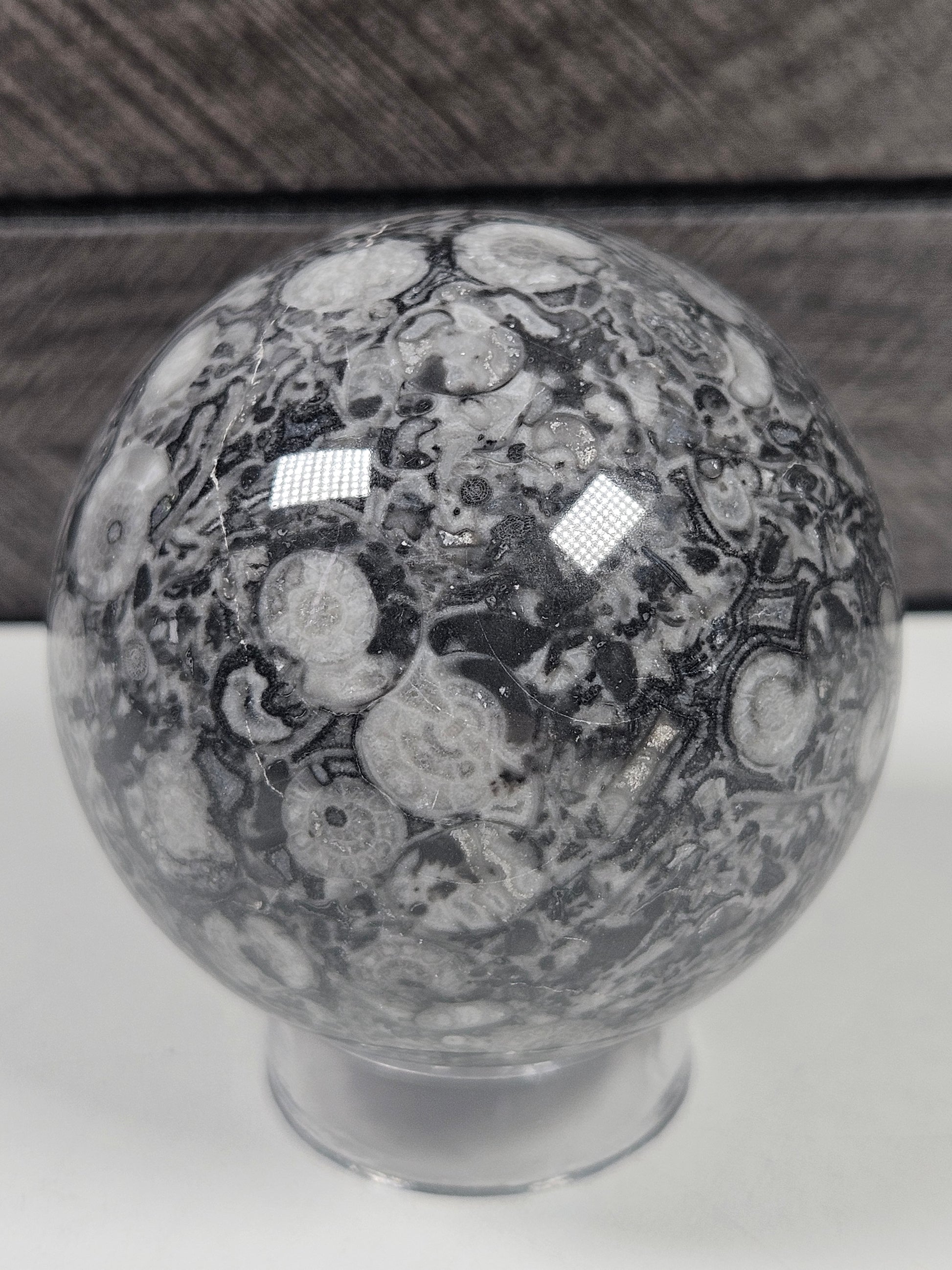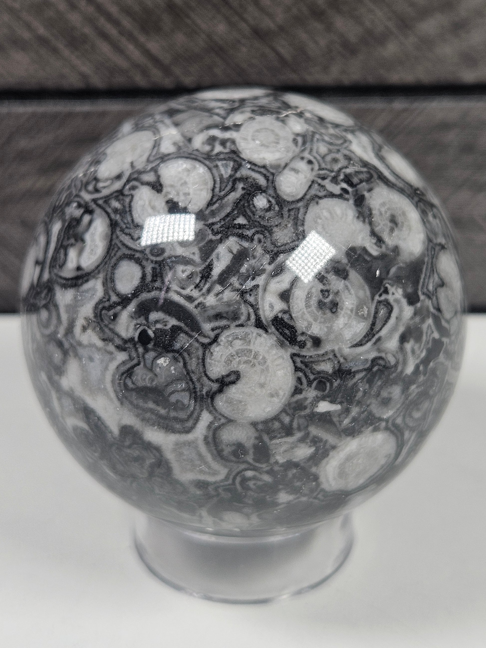 De kleuren variëren van warme bruintinten tot zachte crèmekleuren, met fossiele insluitsels die de bol een levendig en bijna verhaalachtig karakter geven.