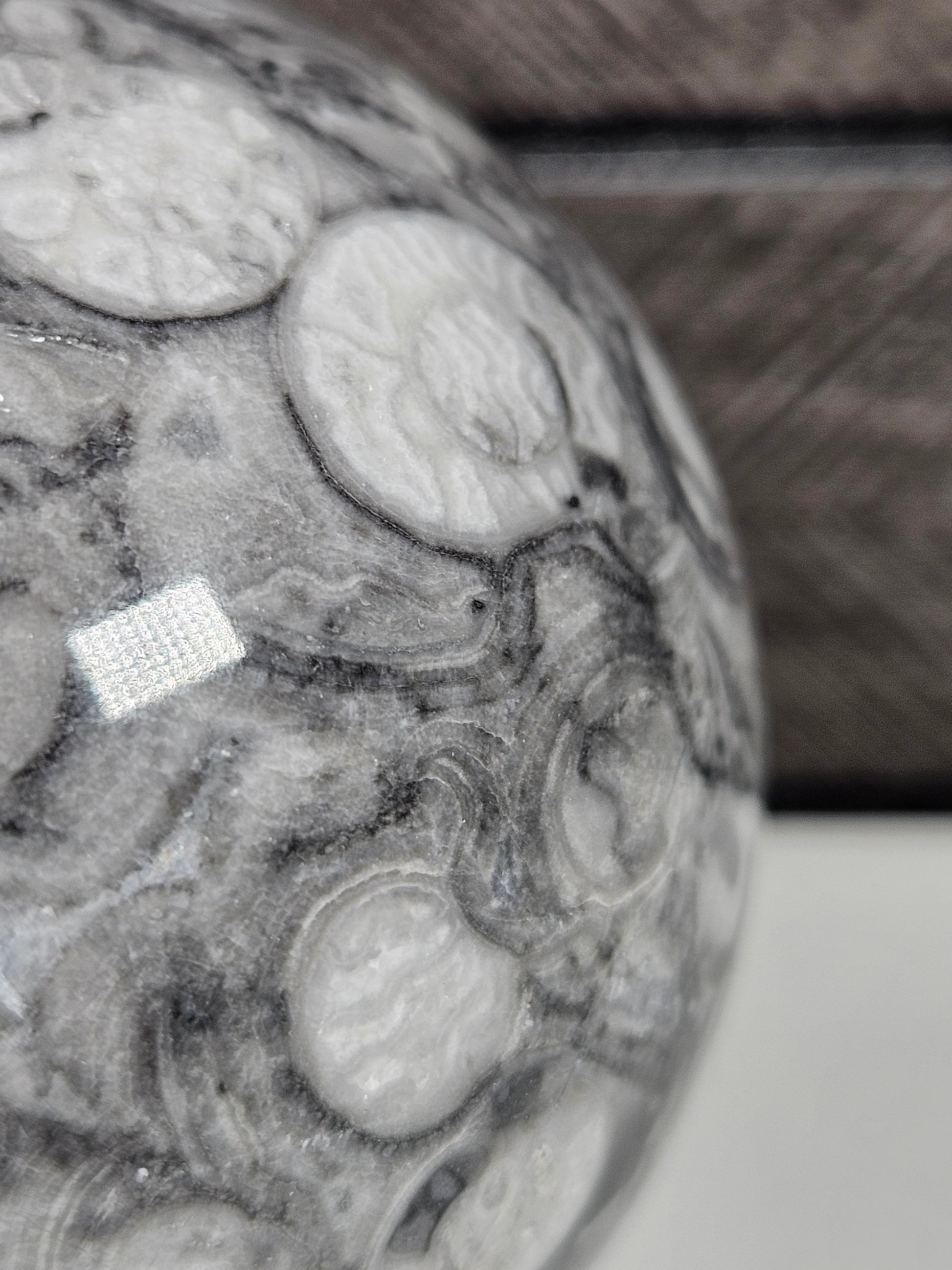 Deze fossiel jaspis bol is een uniek stuk natuursteen. Kleur, patronen en fossiele structuren zijn volledig natuurlijk gevormd, waardoor elk stuk een eigen karakter en uitstraling heeft. Je ontvangt precies de bol die op de foto staat.
