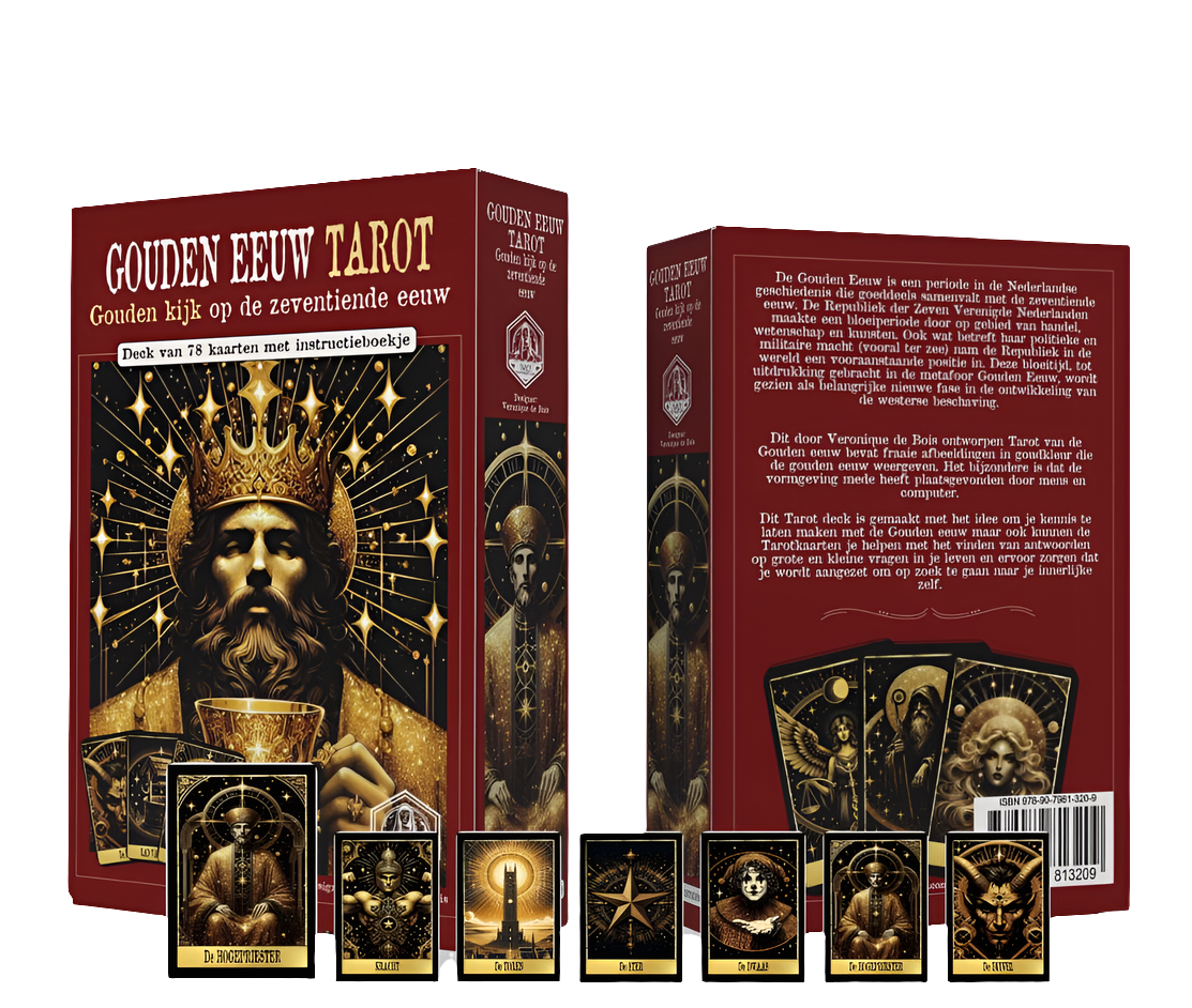 De Gouden Eeuw is een periode in de Nederlandse geschiedenis die goeddeels samenvalt met de zeventiende eeuw. De Republiek der Zeven Verenigde Nederlanden maakte een bloeiperiode door op gebied van handel, wetenschap en kunsten. Ook wat betreft haar politieke en militaire macht (vooral ter zee) nam de Republiek in de wereld een vooraanstaande positie in. Deze bloeitijd, tot uitdrukking gebracht in de metafoor Gouden Eeuw, wordt gezien als belangrijke nieuwe fase in de ontwikkeling van de westerse beschaving. Dit door Veronique de Bois ontworpen Tarot van de Gouden eeuw bevat fraaie afbeeldingen in goudkleur die de gouden eeuw weergeven. Het bijzondere is dat de vormgeving mede heeft plaatsgevonden door mens en computer. Dit Tarot deck is gemaakt met het idee om je kennis te laten maken met de Gouden eeuw maar ook kunnen de Tarotkaarten je helpen met het vinden van antwoorden op je grote en kleine vragen in je leven en ervoor zorgen dat wordt aangezet om op zoen te gaan naar je innerlijke zelf.