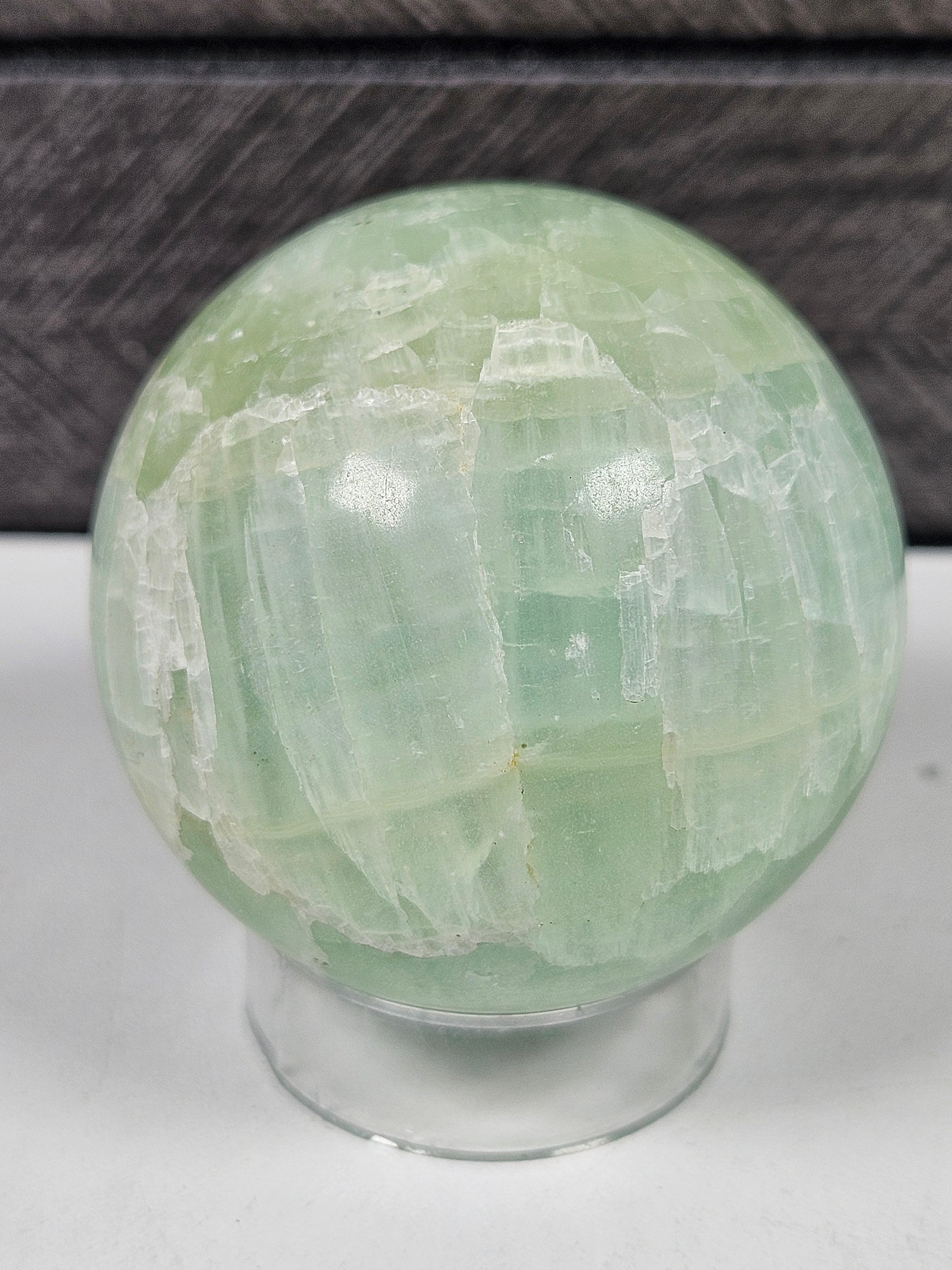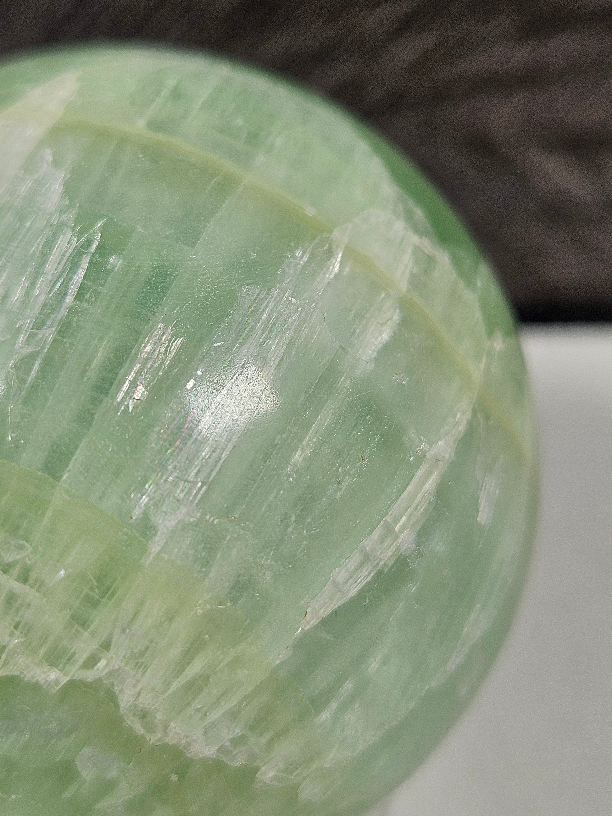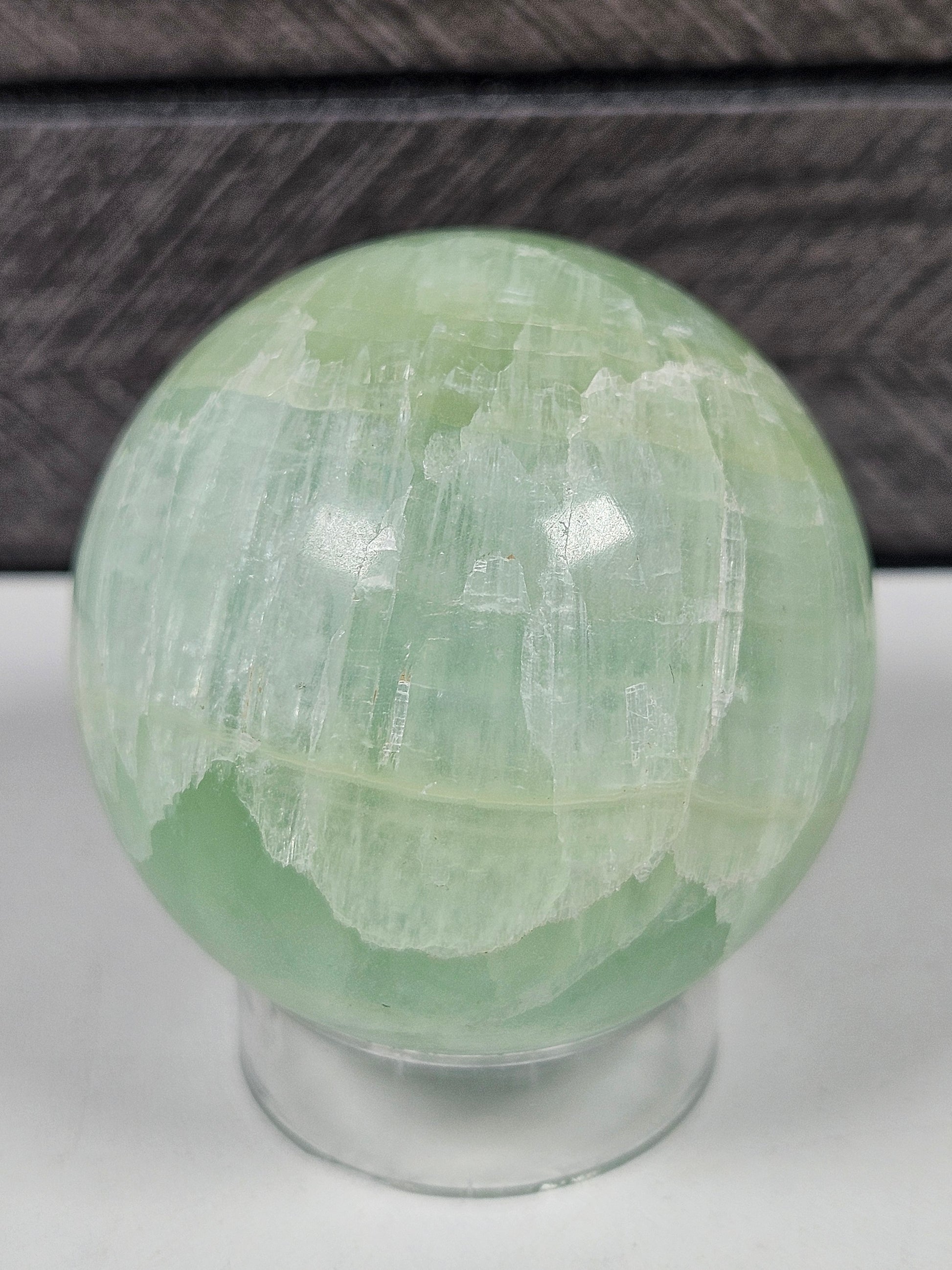 Deze zachte en rustgevende groene (pistache) calciet bol straalt frisse, harmonieuze energie uit met zijn lichtgroene tinten en natuurlijke patronen. Met een gewicht van 178 gram en een diameter van 4,9 cm is deze bol een mooie, compacte toevoeging aan je interieur, altaar of edelstenencollectie.