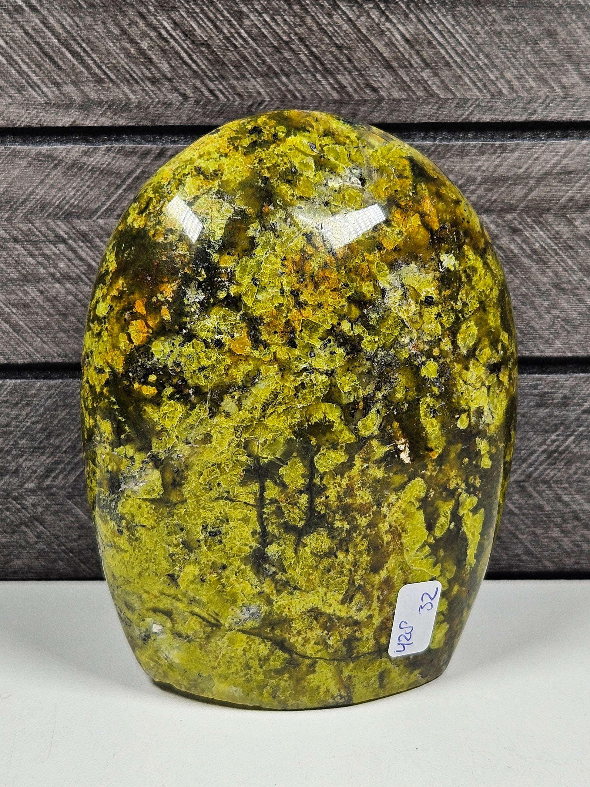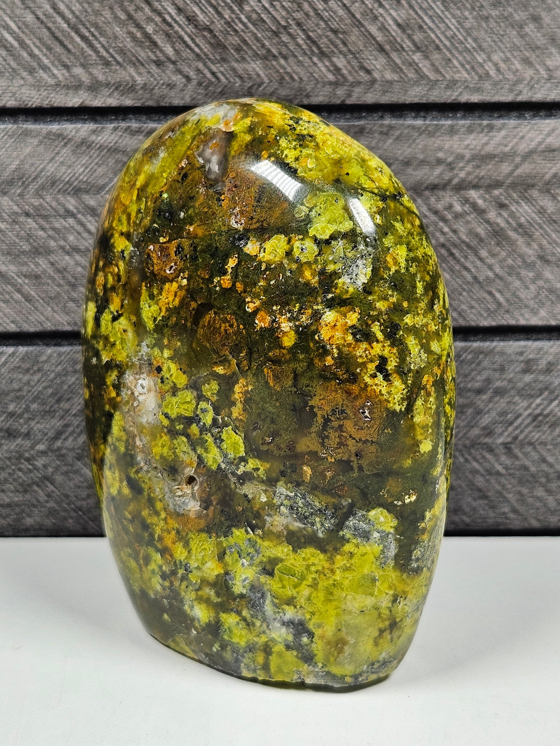 Deze groene opaal sculptuur is een uniek stuk natuursteen. Kleur, patronen en structuur zijn volledig natuurlijk gevormd, waardoor elk stuk een eigen karakter en uitstraling heeft. Je ontvangt precies het exemplaar dat op de foto staat.
