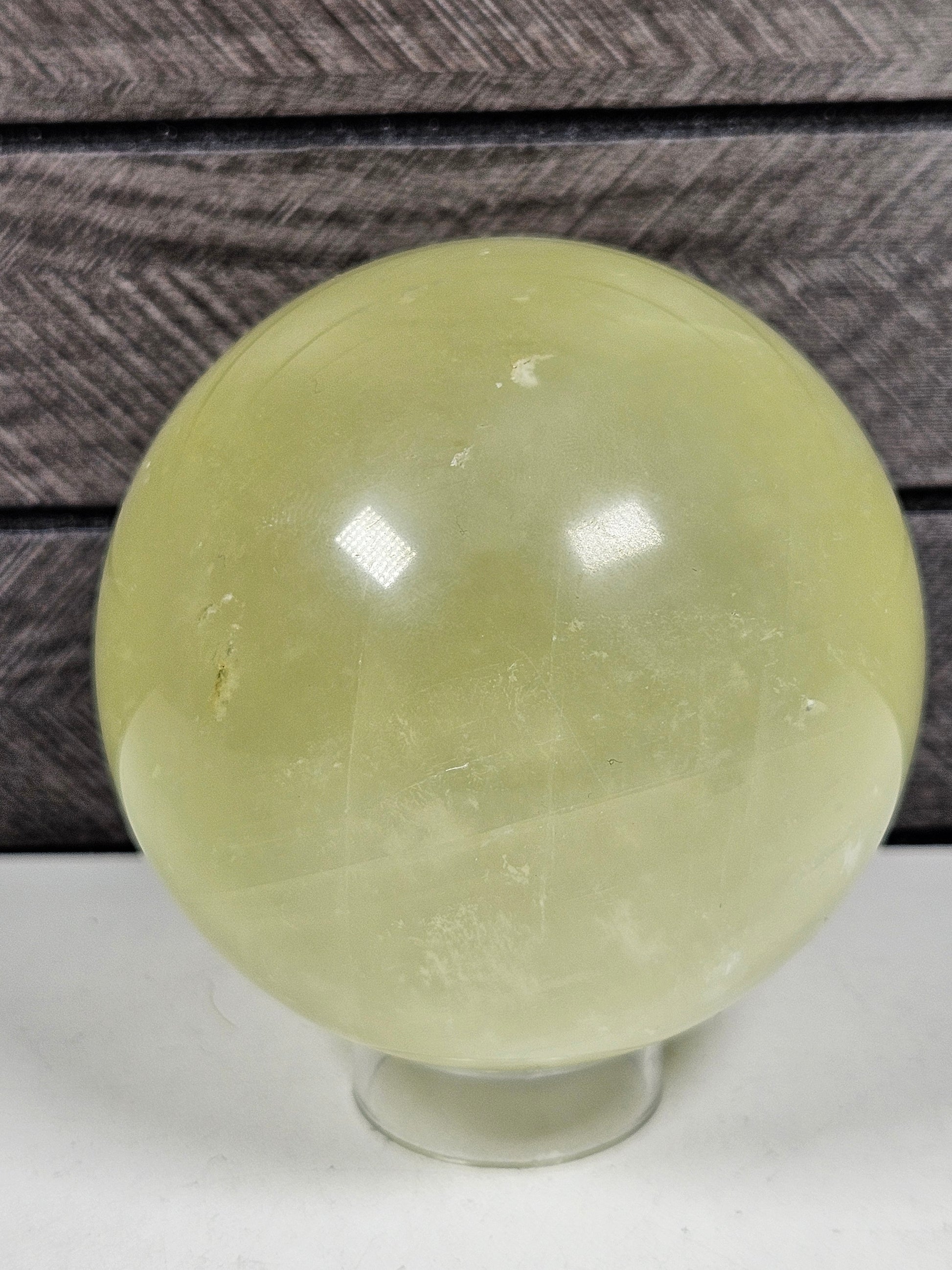 Deze groene optisch calciet bol is een uniek stuk natuursteen. Kleur, helderheid en structuur zijn volledig natuurlijk gevormd, waardoor elke bol een eigen karakter en uitstraling heeft. Je ontvangt precies het exemplaar dat op de foto staat.