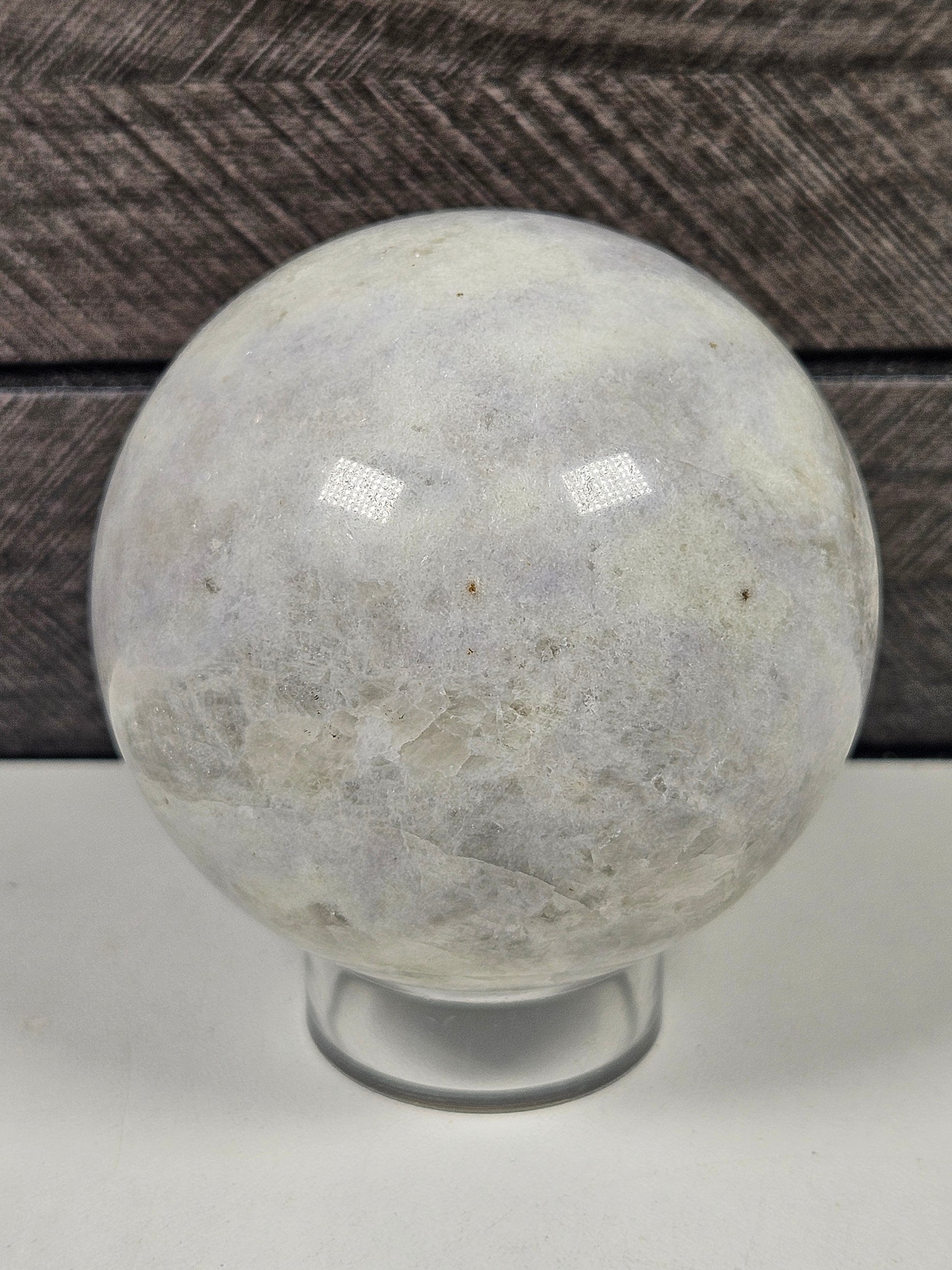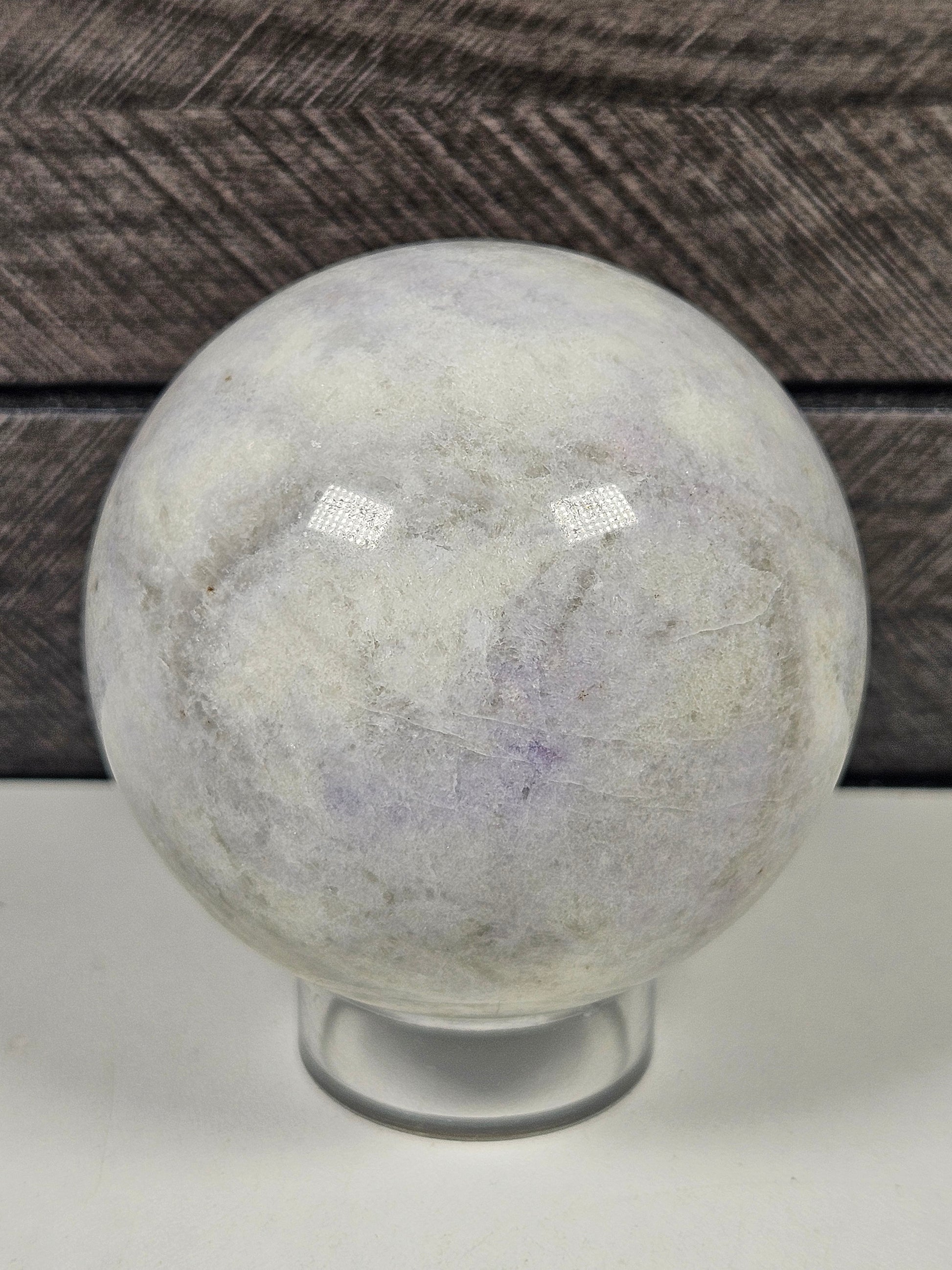 Deze bijzondere hackmaniet bol is een fascinerende edelsteen met een zachte, melkachtige tot lichtpaarse uitstraling en een unieke eigenschap. Met een gewicht van 408 gram en een diameter van 6,4 cm is deze bol een krachtige en opvallende toevoeging aan je interieur, altaar of edelstenencollectie.