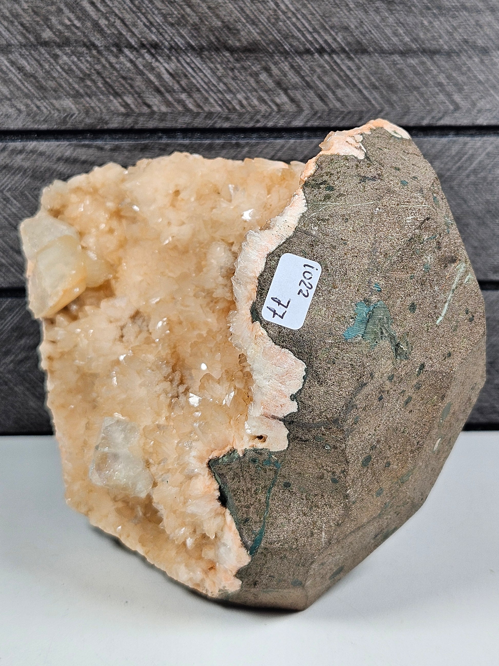 Deze heulandiet geode is een uniek stuk natuursteen. Kristalvorming, structuur en kleur zijn volledig natuurlijk ontstaan, waardoor elk stuk een eigen karakter en uitstraling heeft. Je ontvangt precies het exemplaar dat op de foto staat.