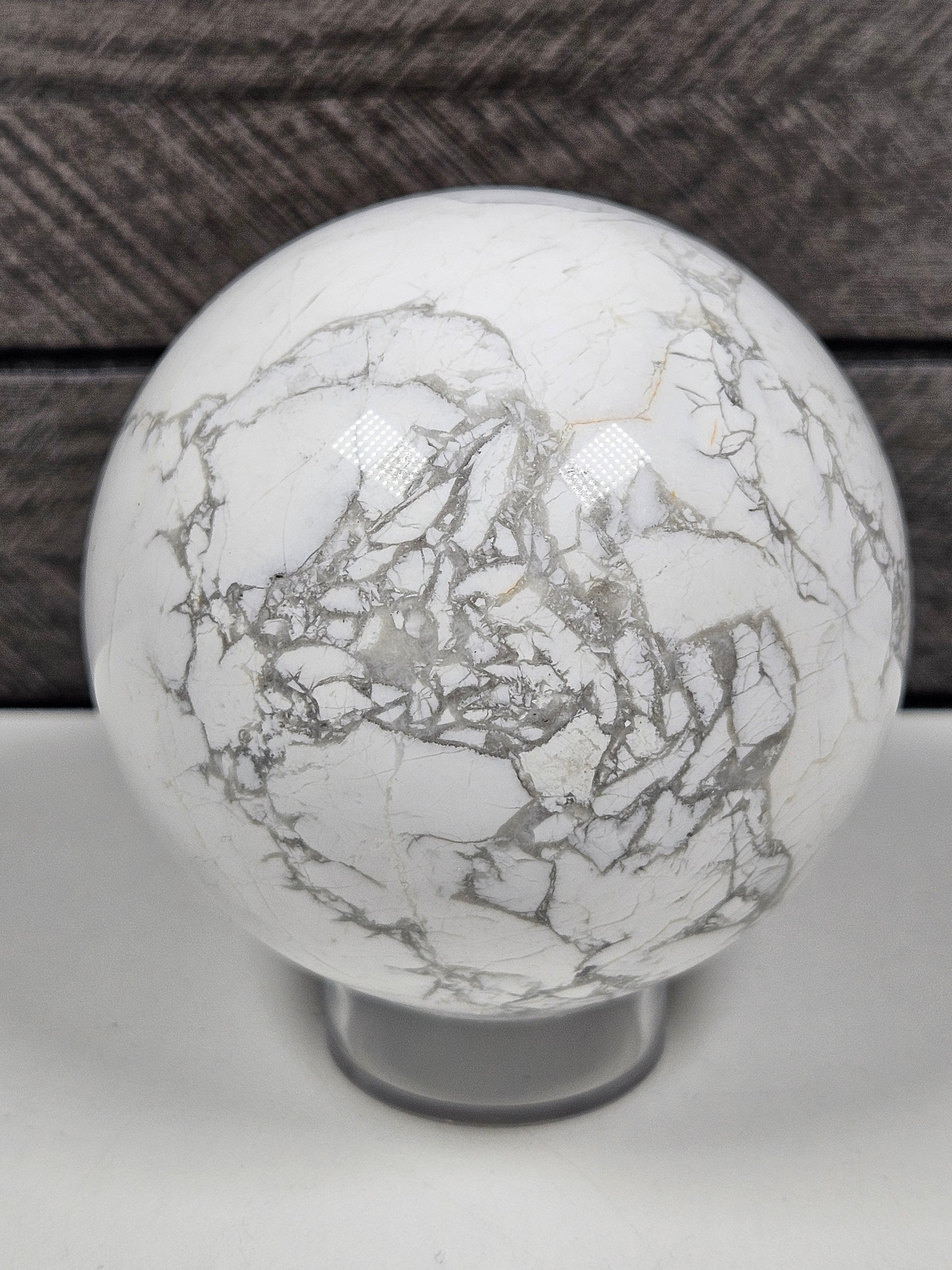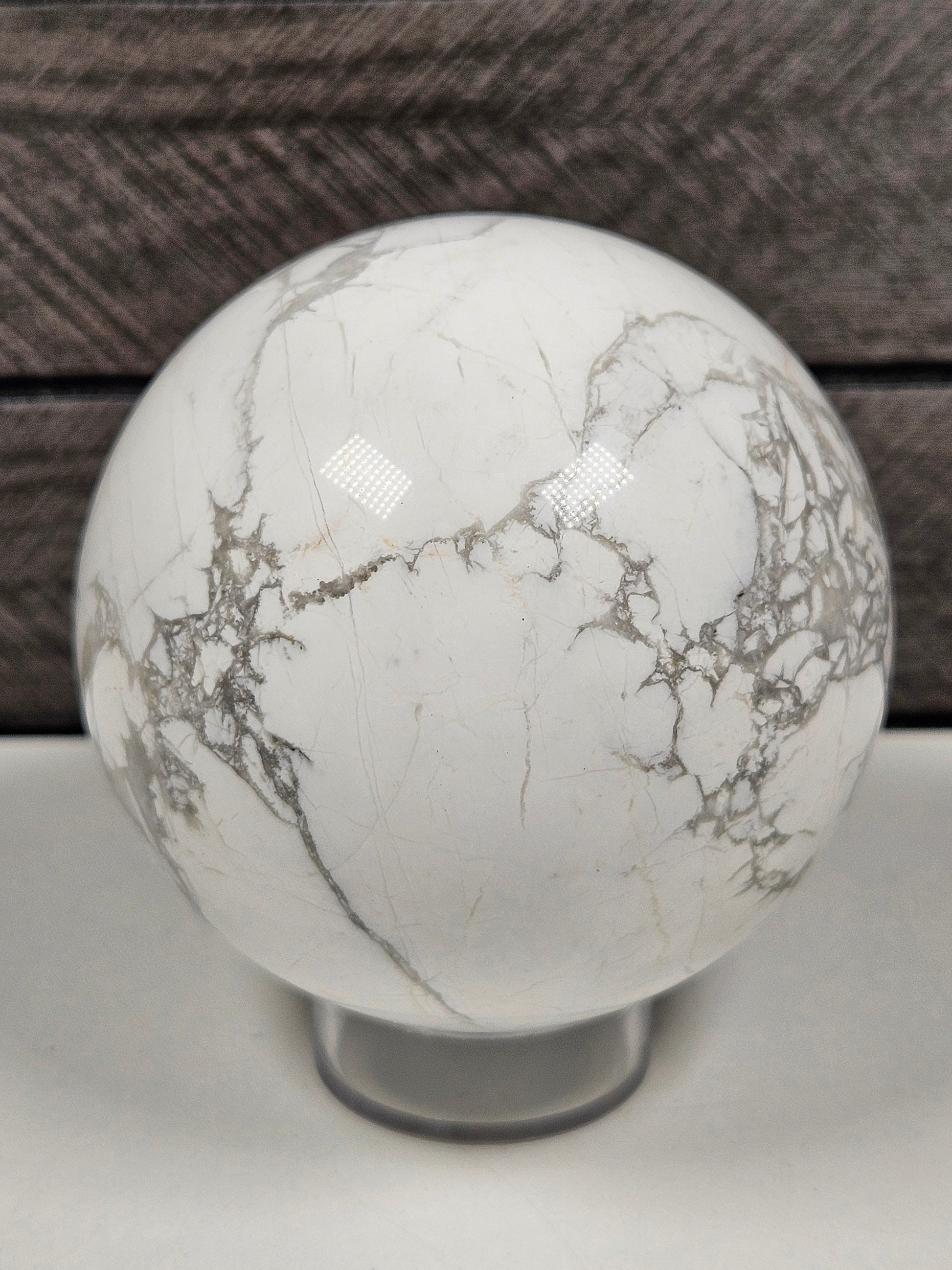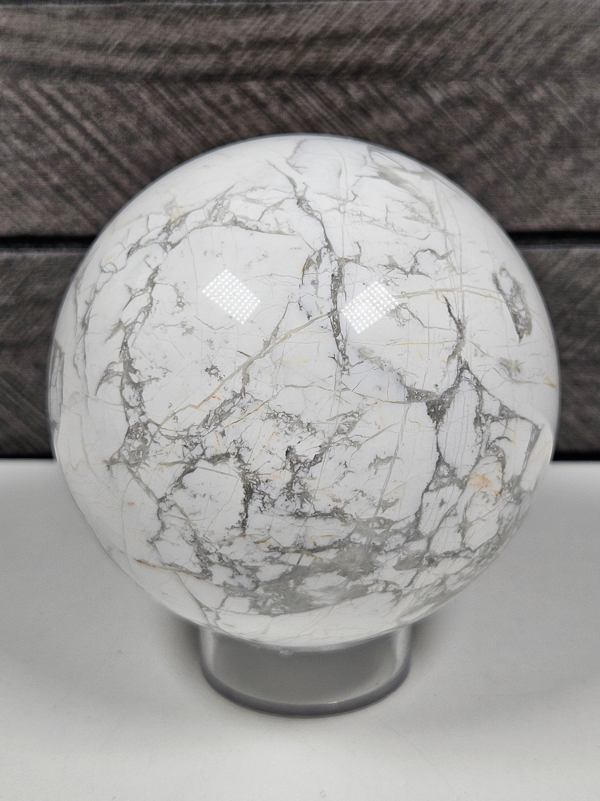 Deze Howliet bol van 550 gram met een diameter van circa 7,1 cm is een elegante edelstenen bol met een frisse witte basis en karakteristieke grijze aders. De natuurlijke marmerachtige tekening geeft de steen een rustige en verfijnde uitstraling. Dankzij de gepolijste afwerking komen de patronen rondom mooi naar voren.