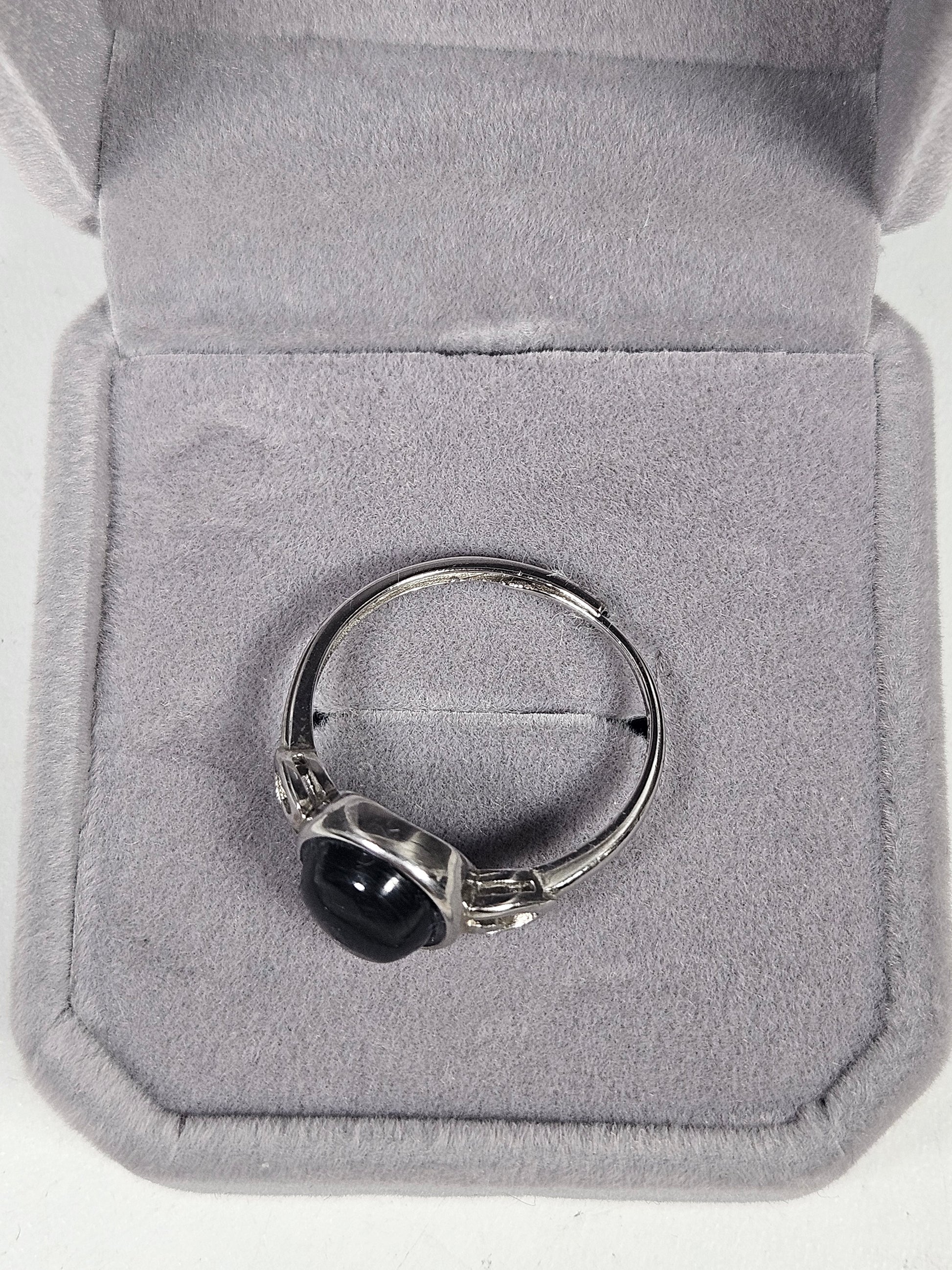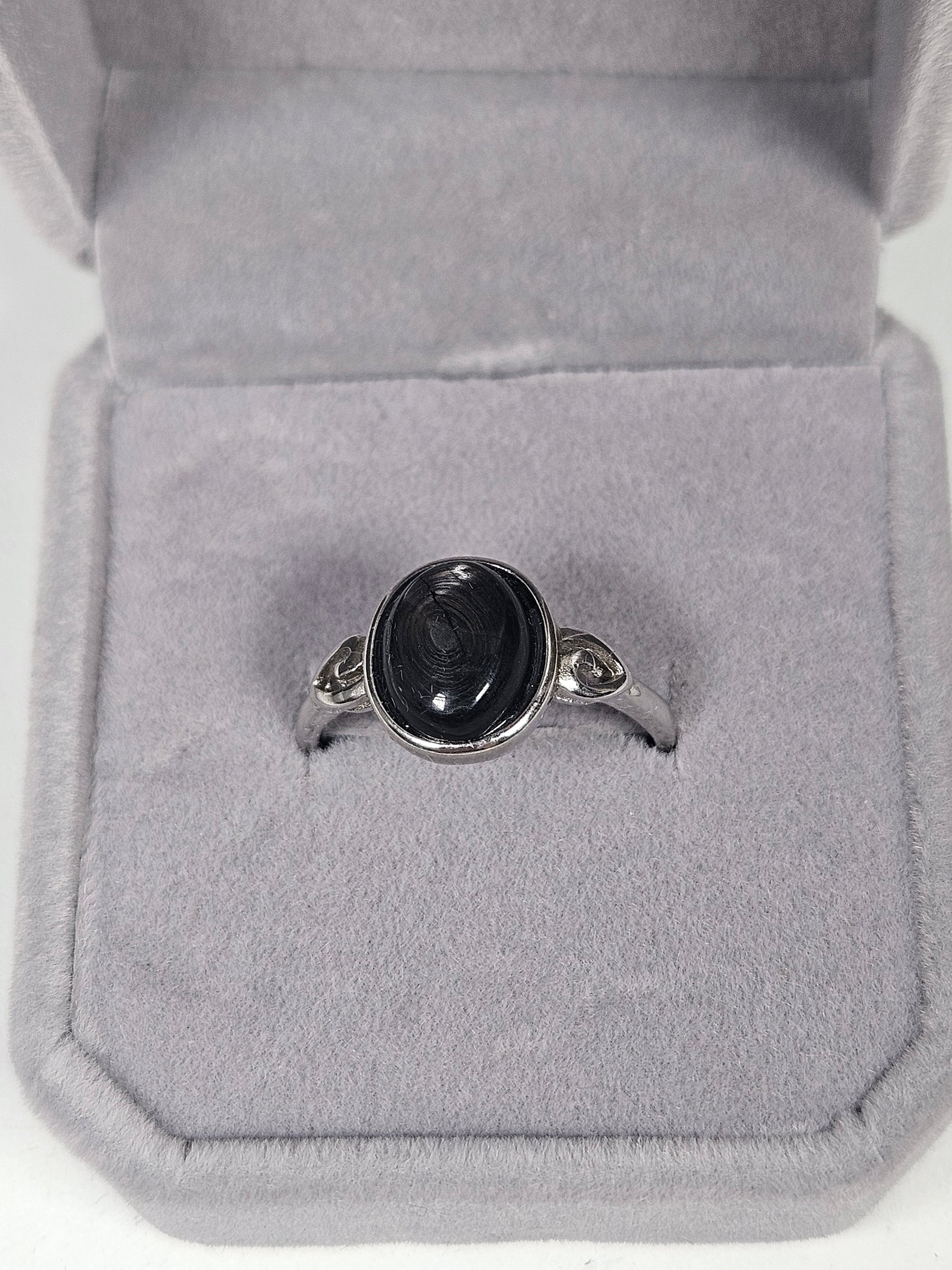 Deze stijlvolle hypersteen ring heeft een mysterieuze en elegante uitstraling met diepe donkergrijze tot zwarte tinten en een subtiele zilverachtige glans. Bij beweging in het licht kan de steen een zijdeachtig reflecterend effect laten zien, wat zorgt voor een bijzondere en luxe uitstraling. De S925 zilveren setting geeft de ring een tijdloze en verfijnde afwerking.