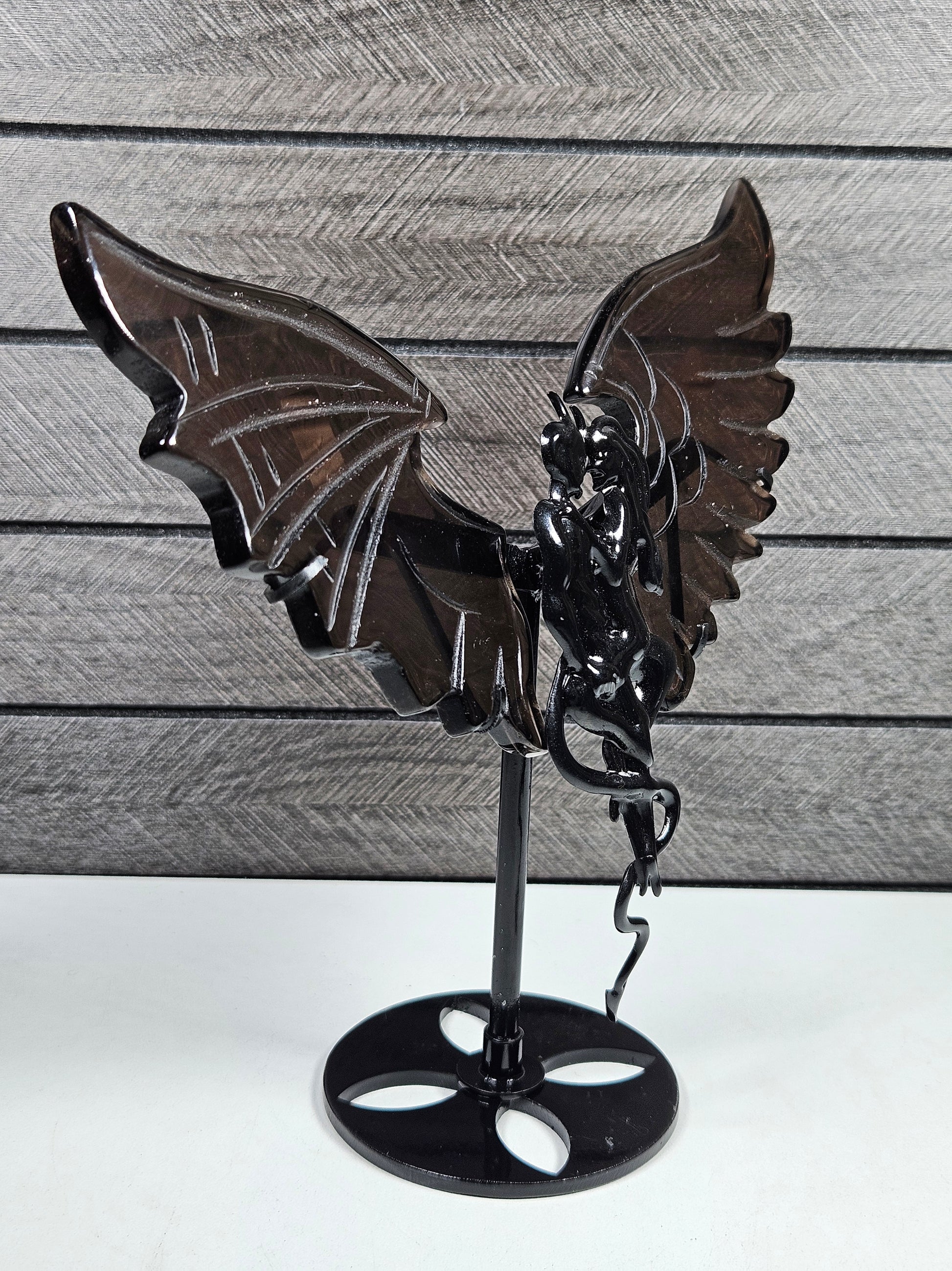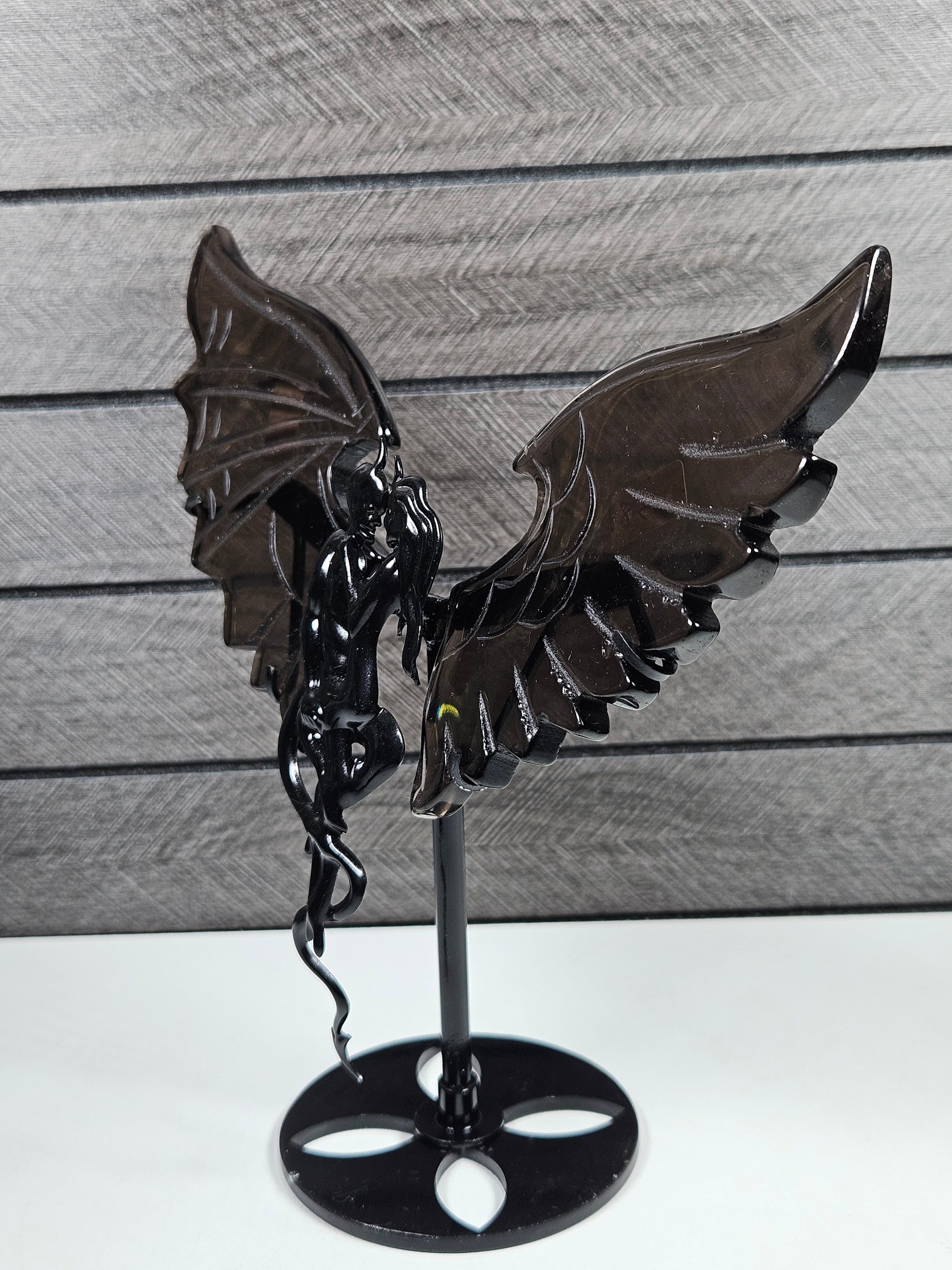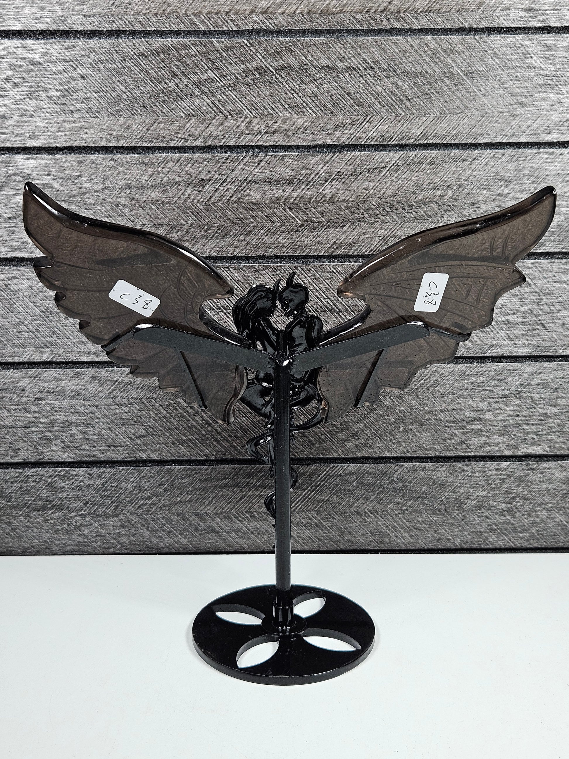 IJs obsidiaan, met zijn doorschijnende rookgrijze tinten en zachte glans, geeft deze carving een bijna etherische uitstraling. De engel straalt zachtheid, helderheid en bescherming uit, terwijl de duivel staat voor kracht, schaduwwerk en innerlijke waarheid. Samen vormen ze een evenwichtig geheel dat herinnert aan de balans tussen licht en donker, groei en reflectie, kracht en overgave.