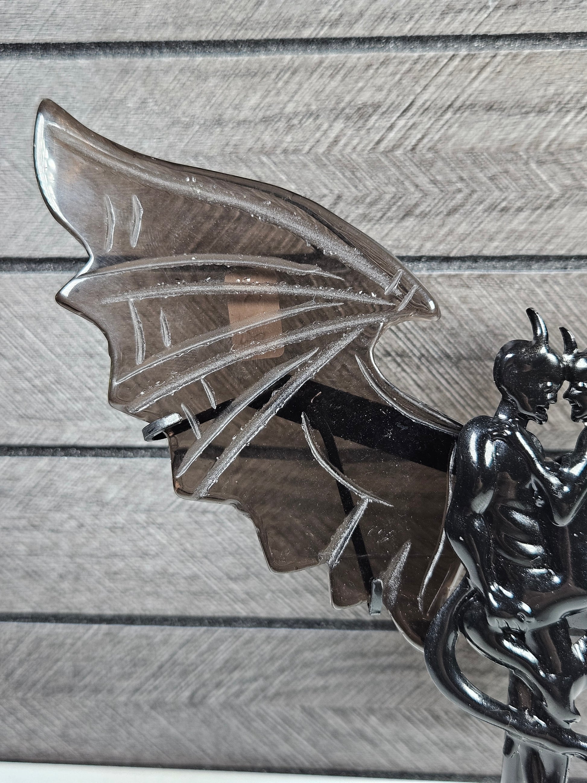 Dit IJs Obsidiaan duivel en engel koppel C38 is een bijzonder en symbolisch kristalduo dat licht en schaduw samenbrengt in één harmonieus kunstwerk. De set staat op een zwarte standaard en heeft een totale breedte van 18 cm en een hoogte van 17 cm. Het is een krachtig statementstuk met een diep spirituele uitstraling.