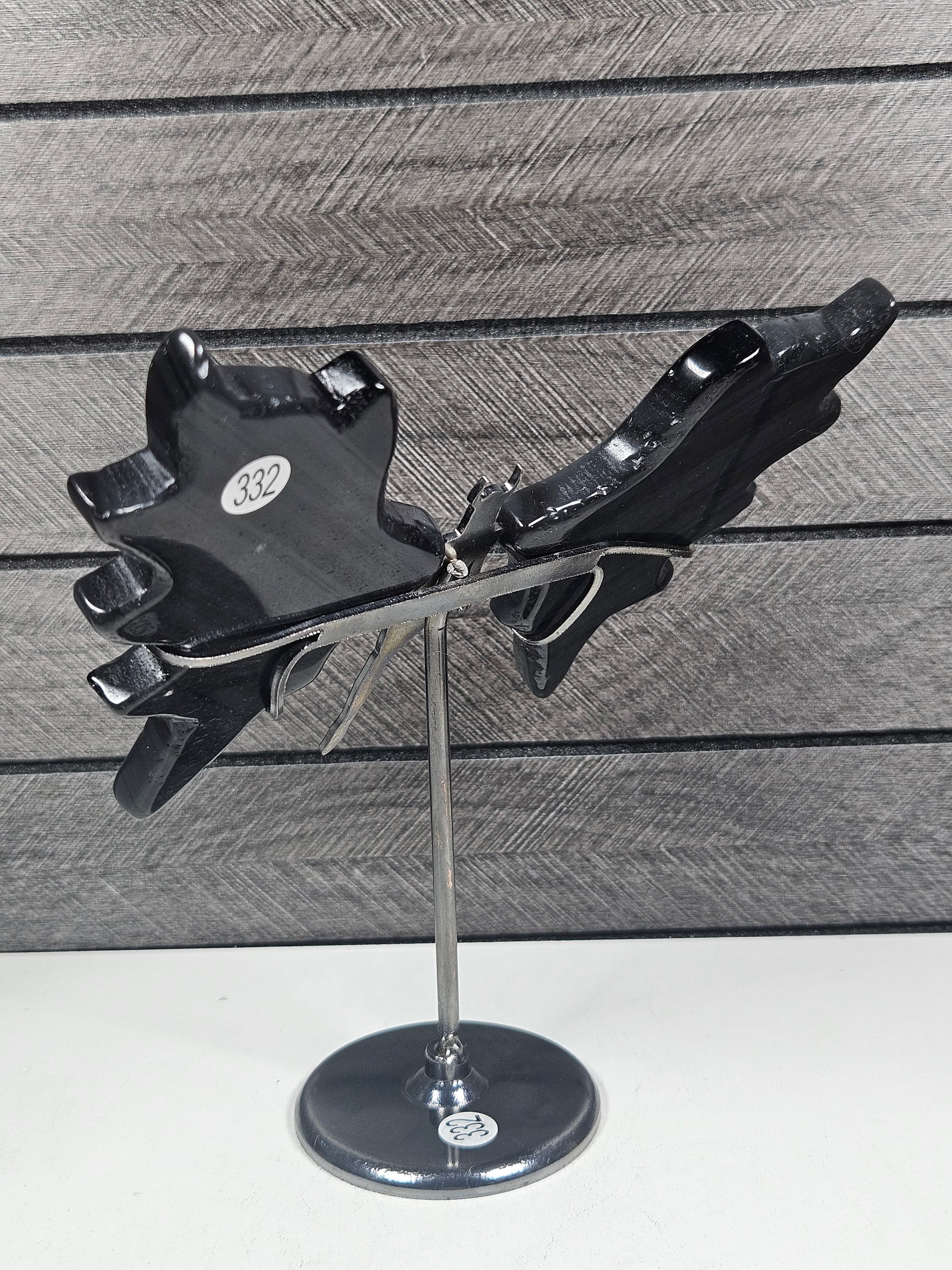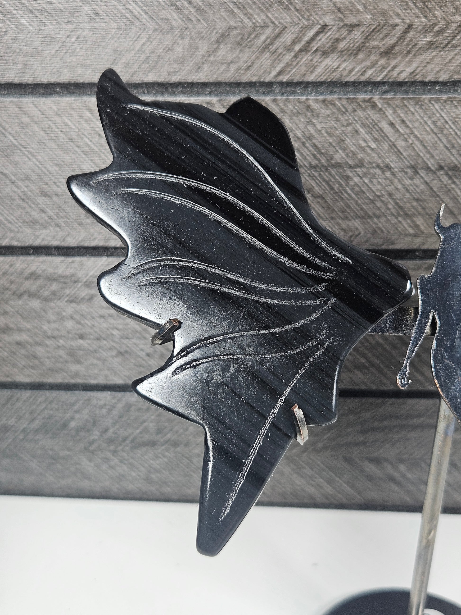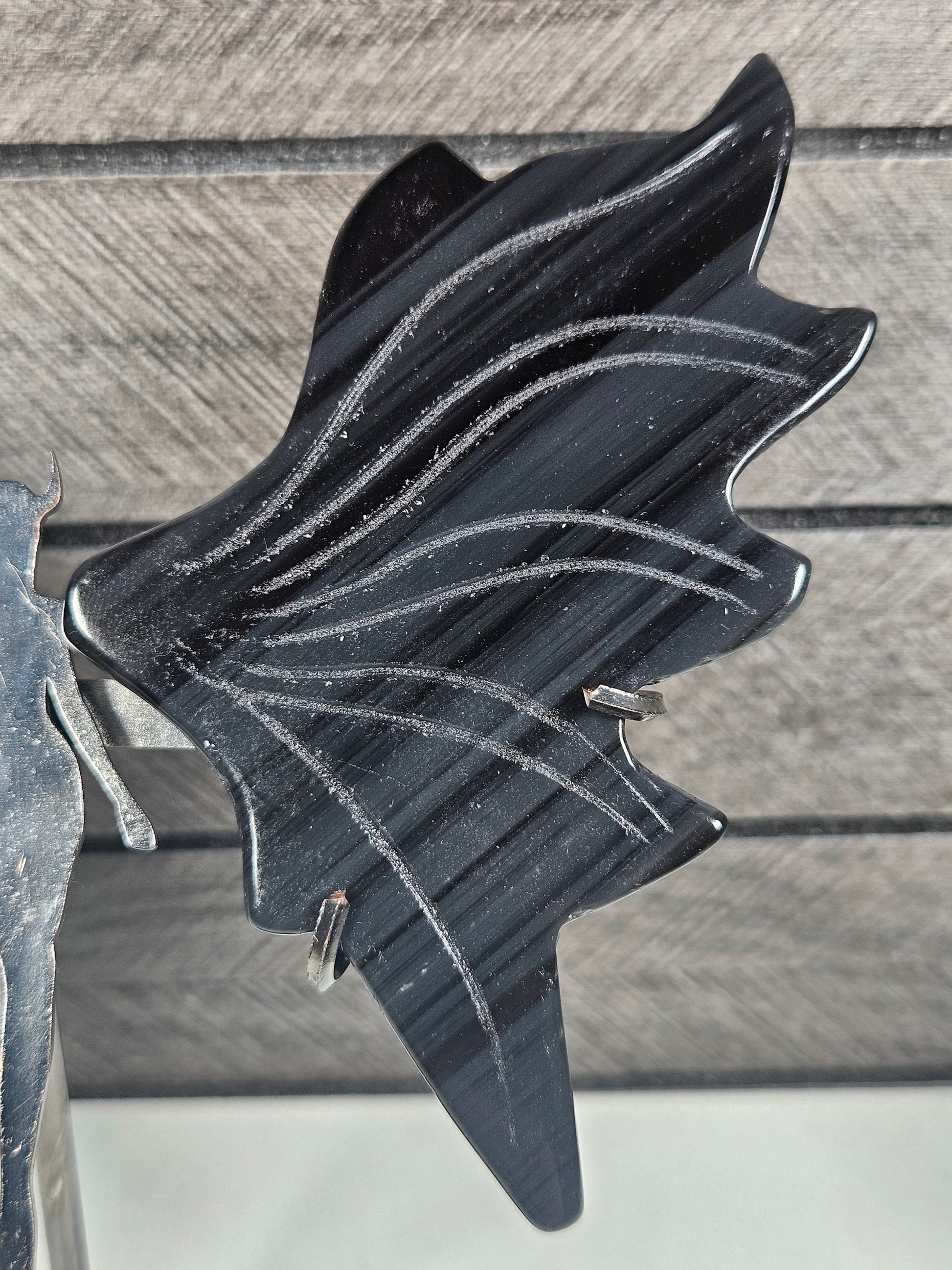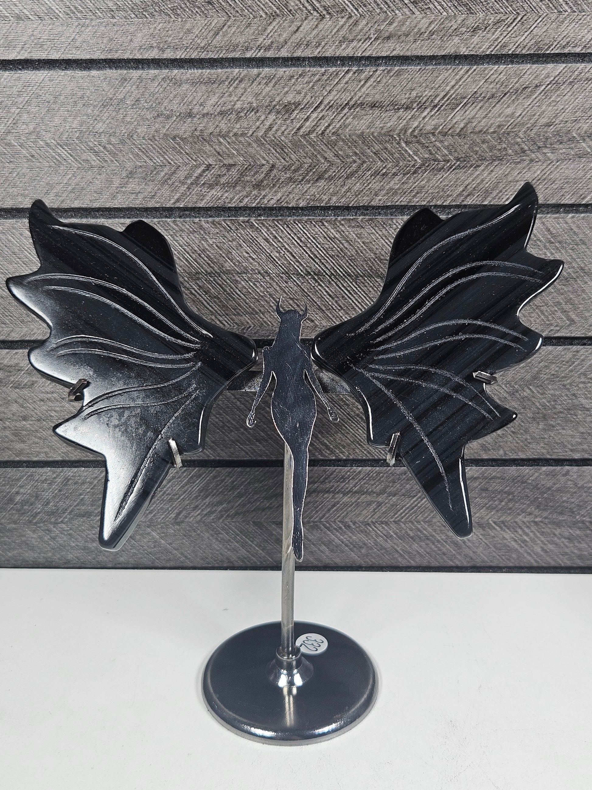 De sierlijke vleugels en het krachtige silhouet van de Duivel Dame geven dit stuk een mystieke en bijna magische uitstraling. De gunmetal standaard zorgt voor een elegante en stevige presentatie. Elk stuk is uniek in tekening en insluitsels, je ontvangt het exacte exemplaar van de foto.