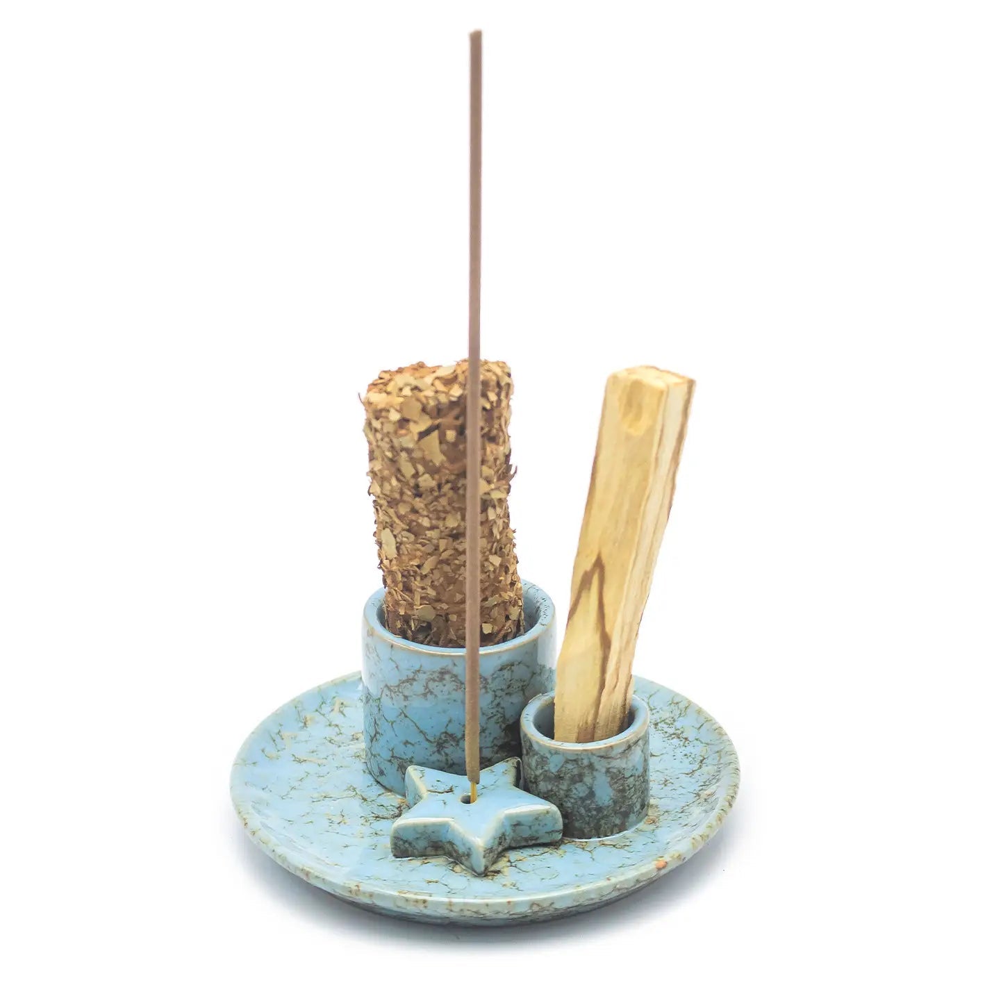 Deze compacte keramieken houder is een stijlvolle en praktische accessoire voor het branden van bijvoorbeeld wierookstokjes, salie en palo santo. Dankzij het slimme ontwerp met meerdere houders combineert dit schaaltje functionaliteit met een rustgevende uitstraling.