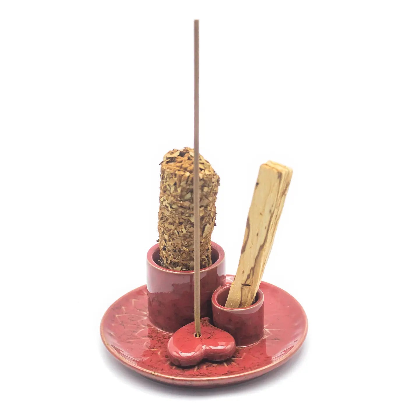 Deze keramieken houder in warme roodtint is een sfeervolle en praktische accessoire voor het branden van wierookstokjes, salie en palo santo. Dankzij het multifunctionele ontwerp is dit schaaltje ideaal voor meditatie, energetische reiniging en dagelijkse ontspanningsmomenten.
