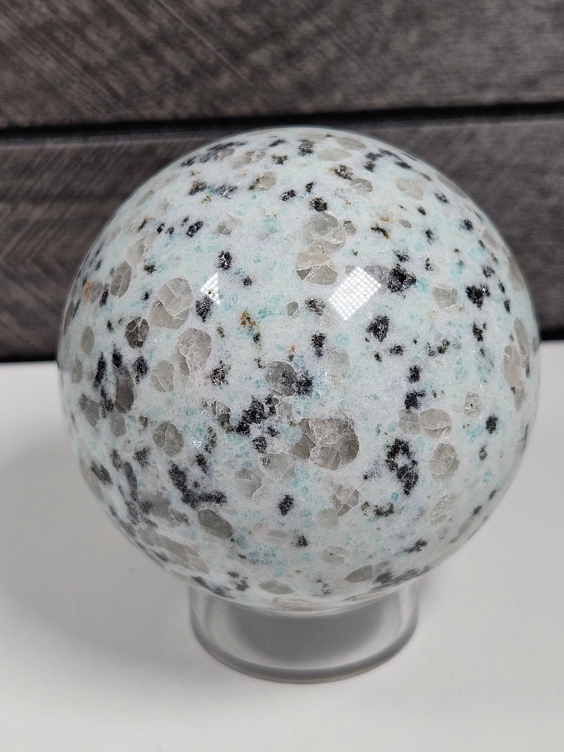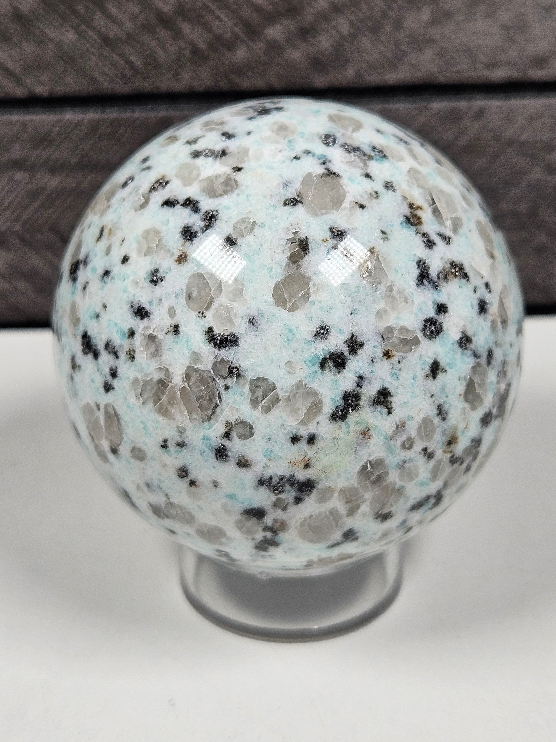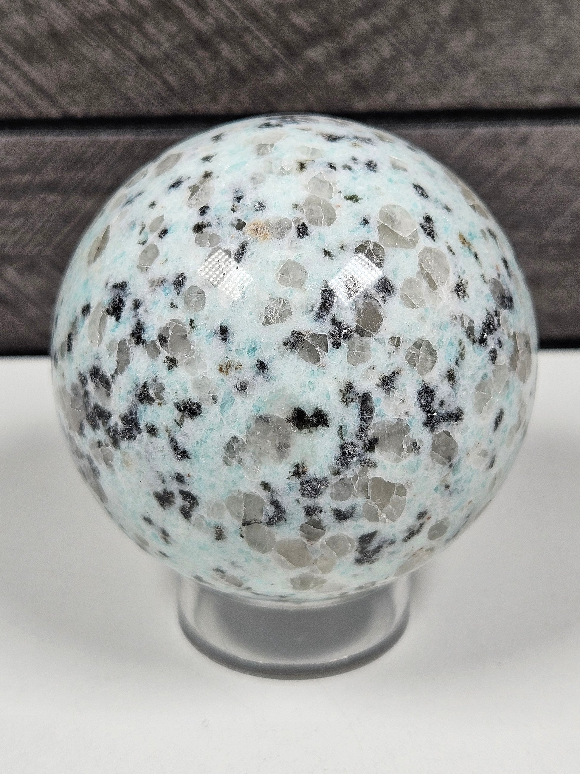 Dit specifieke exemplaar heeft een unieke kleurverdeling en natuurlijke structuur. Door het handzame formaat is de bol ideaal voor plaatsing op een bolhouder, bureau, plank of als onderdeel van een edelstenenverzameling.