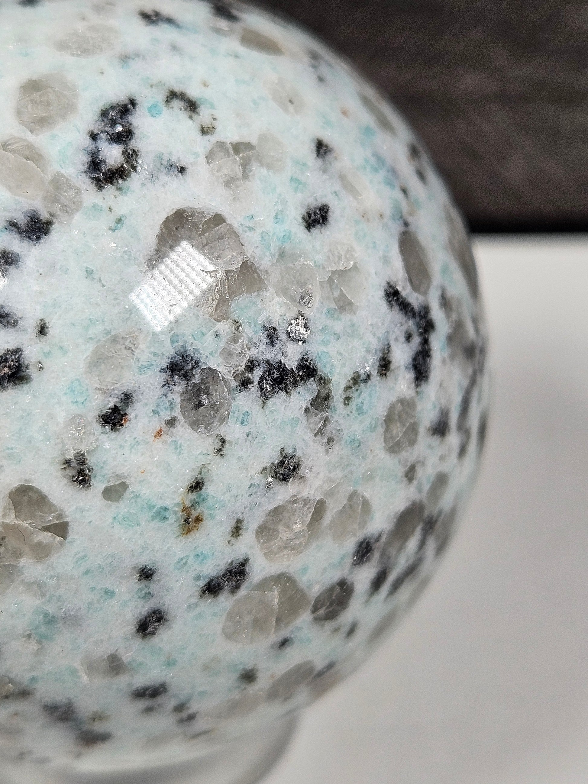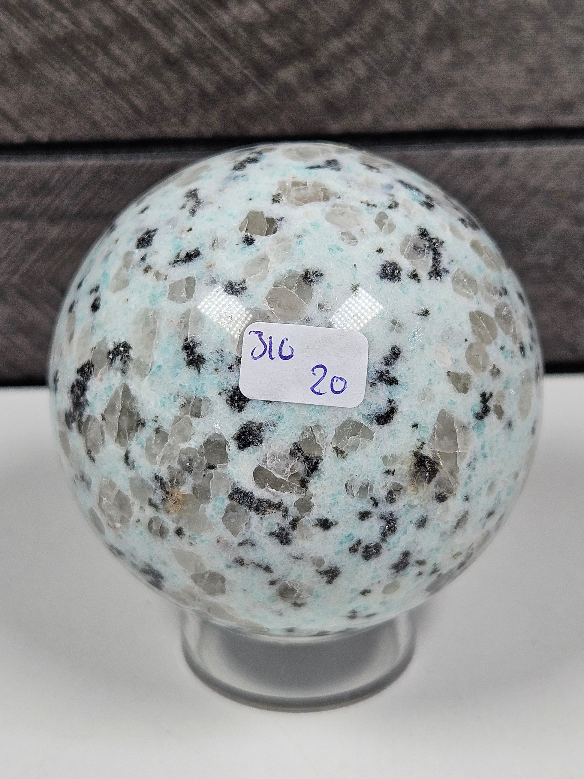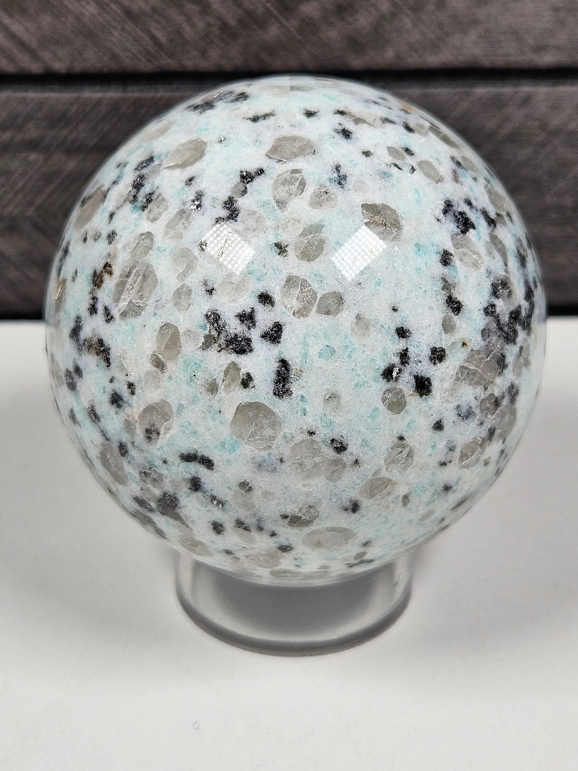 Dit specifieke exemplaar heeft een unieke kleurverdeling en natuurlijke structuur. Door het handzame formaat is de bol ideaal voor plaatsing op een bolhouder, bureau, plank of als onderdeel van een edelstenenverzameling.
