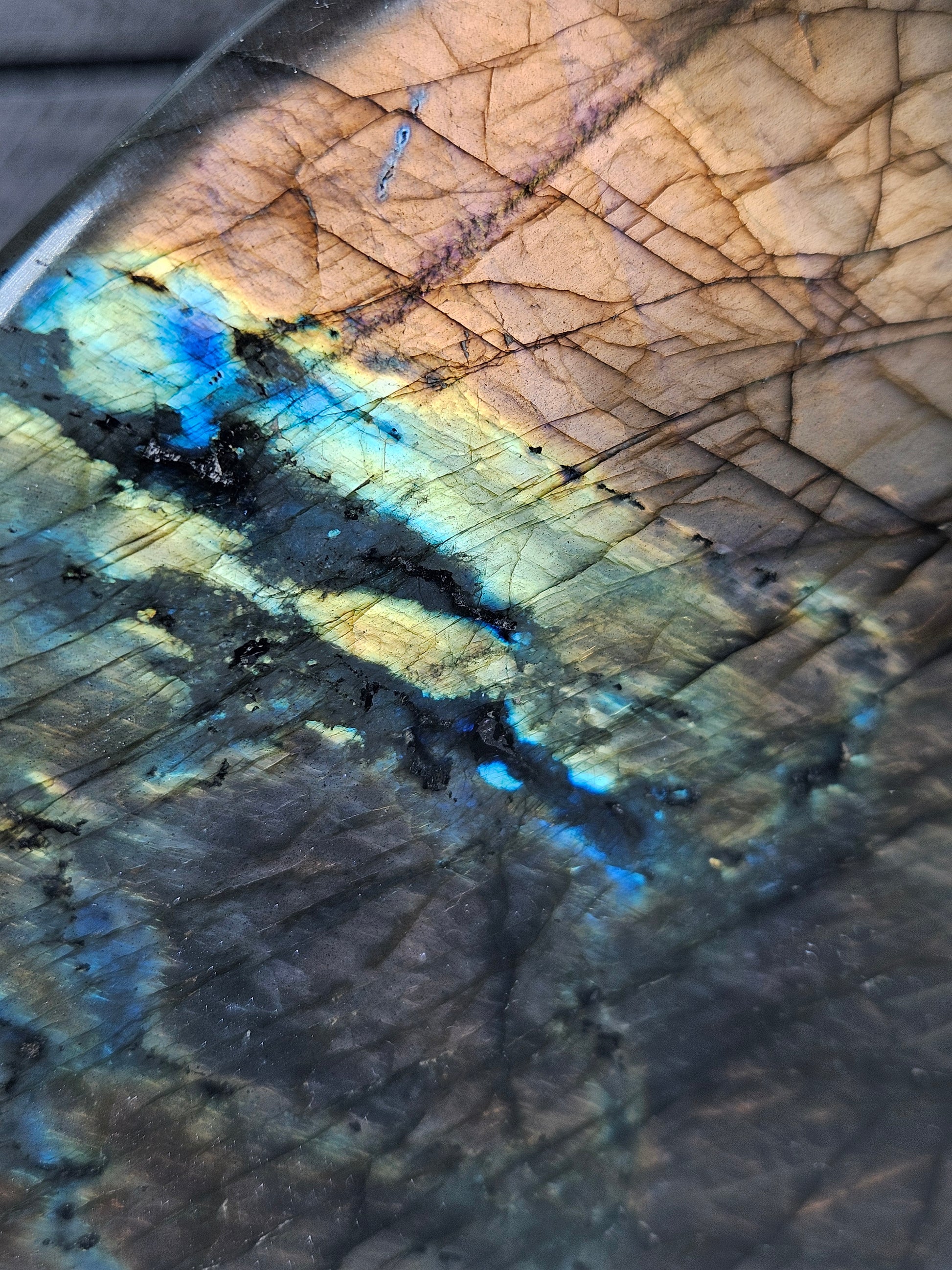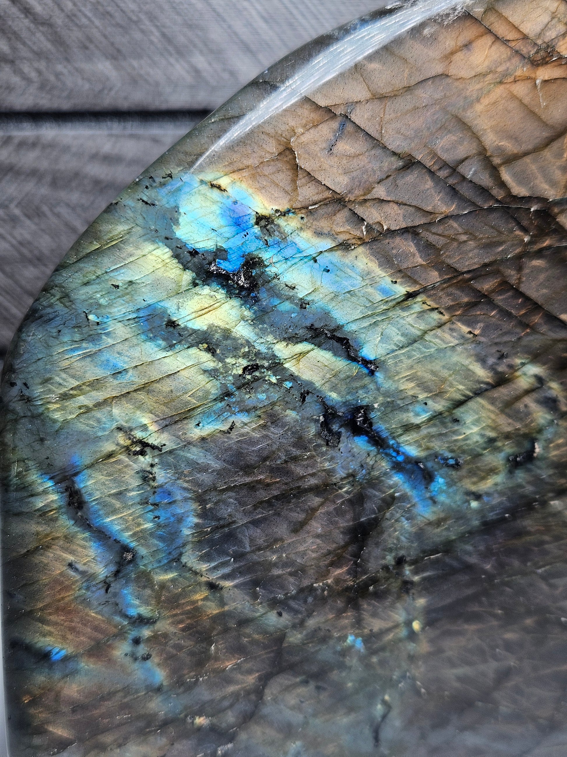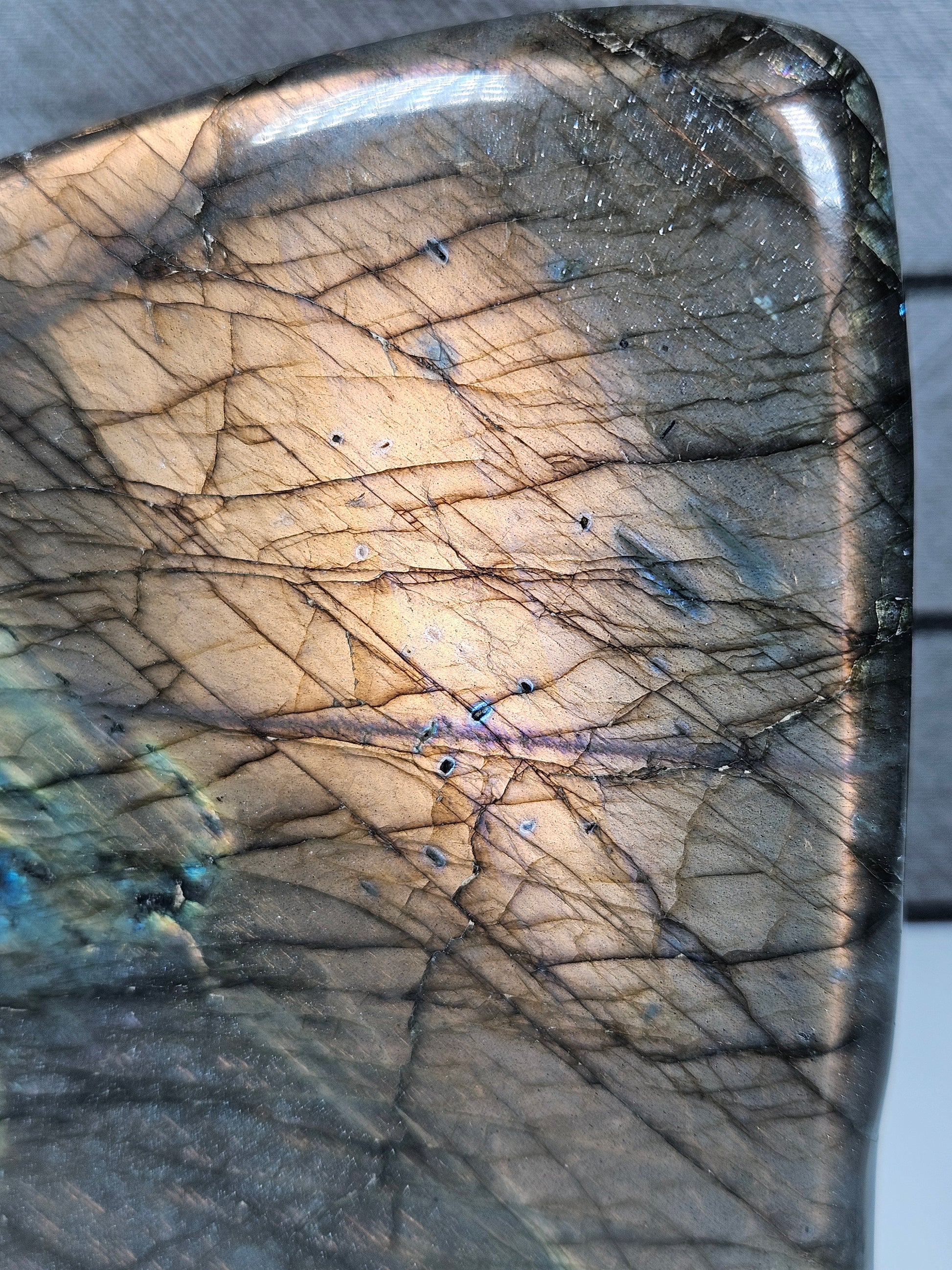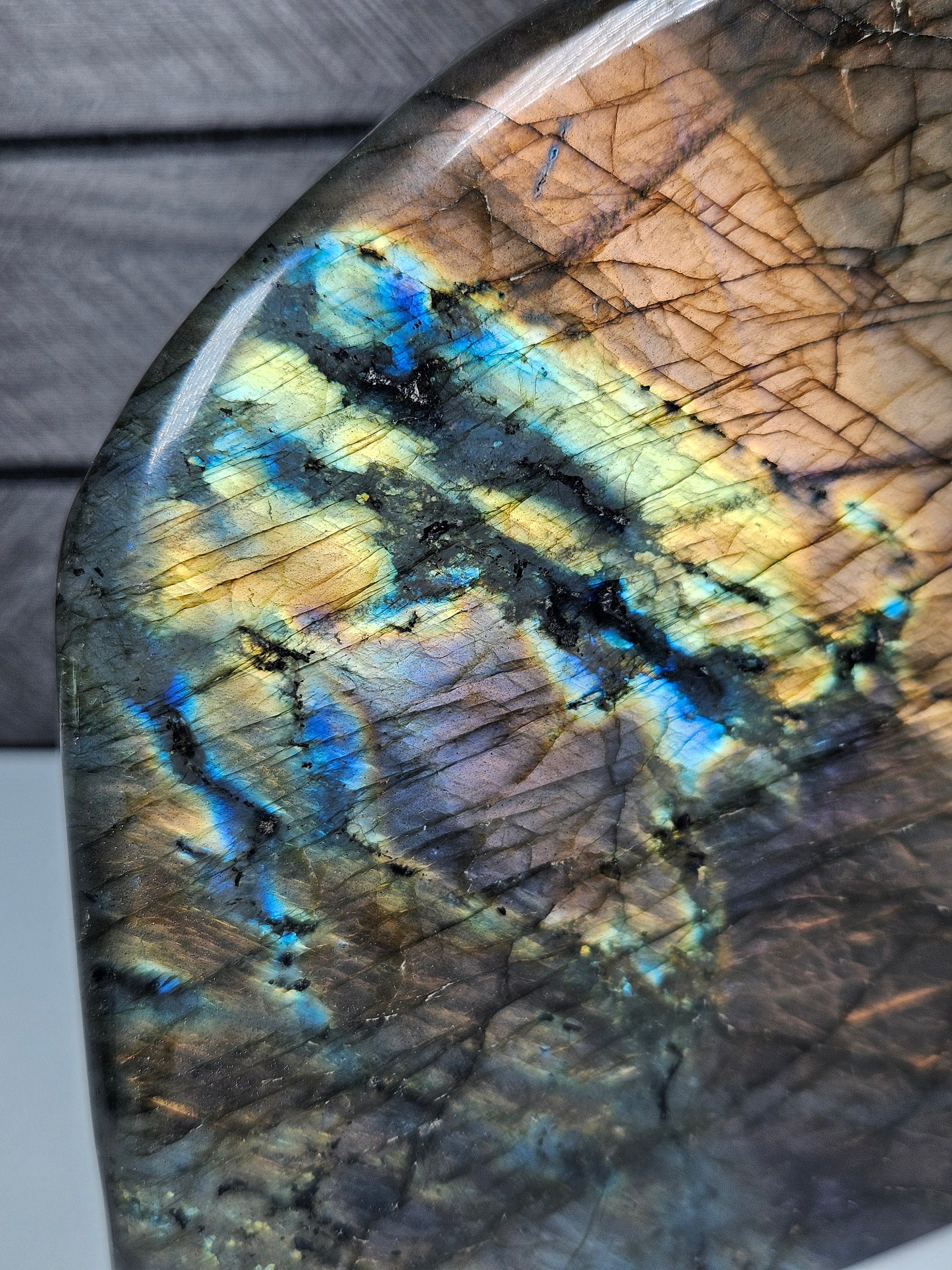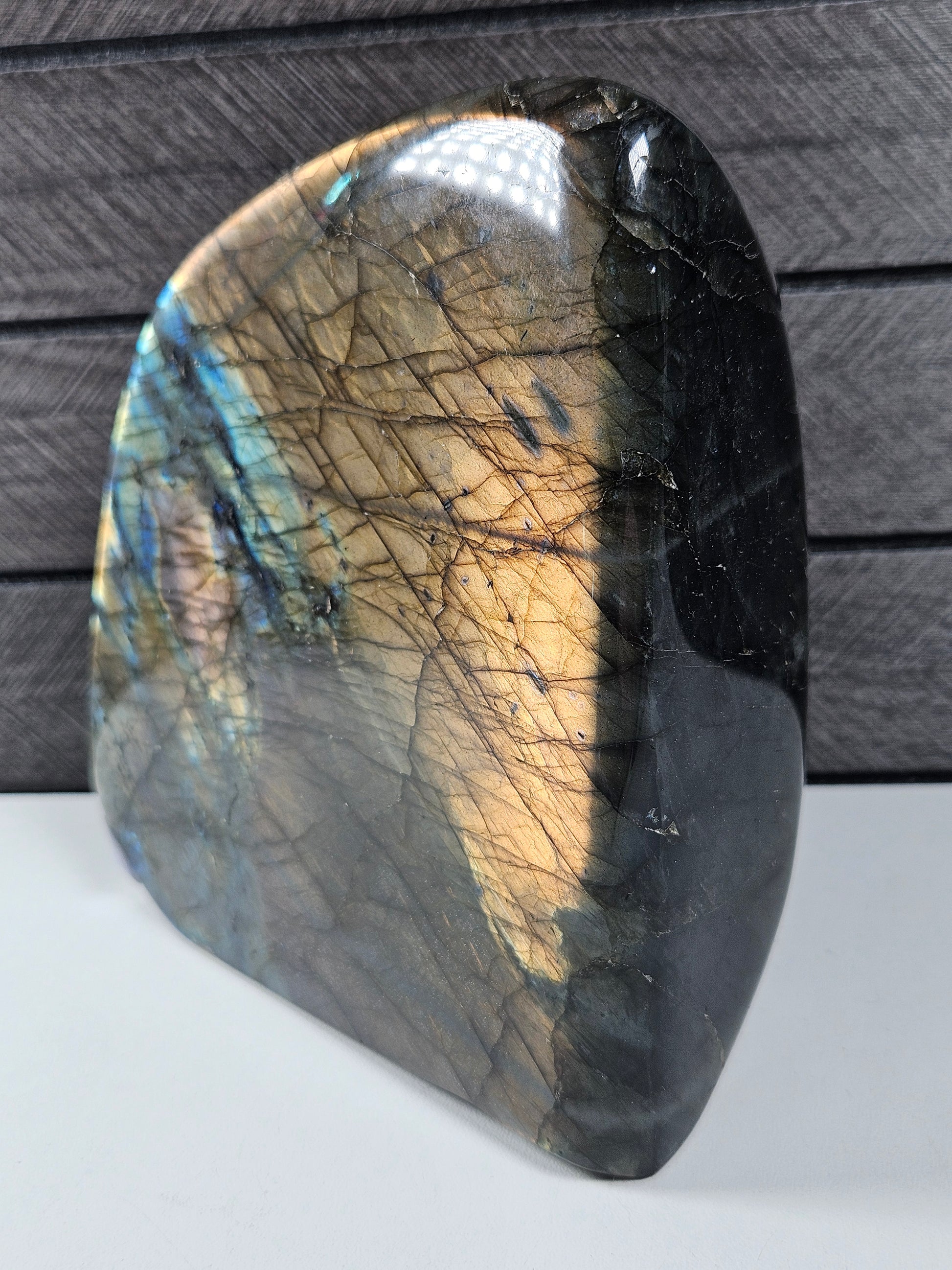 Deze indrukwekkende Labradoriet sculptuur van 1452 gram is een ware blikvanger. Met een hoogte van 13 cm, een breedte van 12,5 cm en een dikte van 5,5 cm heeft dit stuk een krachtige en stabiele uitstraling. De voorzijde toont een uitzonderlijk sterke labradorescentie met intense gouden, blauwe en subtiel paarse flashes die bij elke lichtinval tot leven komen.