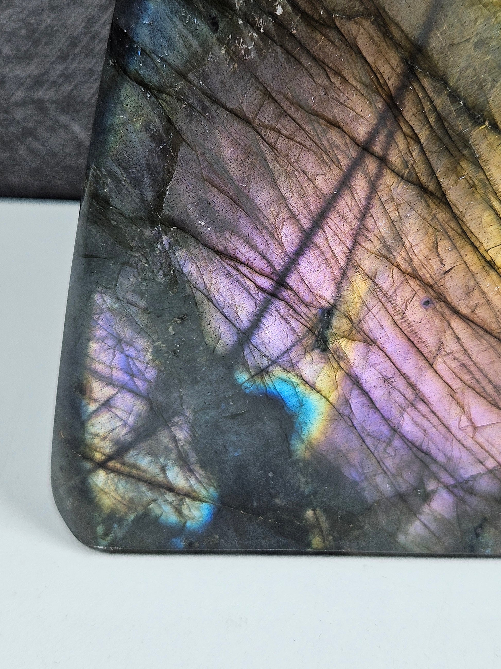 Wat direct opvalt is de sterke combinatie van paars, goud en blauwgroene flash. Het bovenste deel toont een warme goudgele gloed, terwijl het midden en onderste gedeelte schitteren in zachte paarstinten met accenten van turquoise en blauw. De natuurlijke lijnen en structuren in de steen versterken het diepte-effect, waardoor de kleuren bij elke beweging in het licht veranderen.