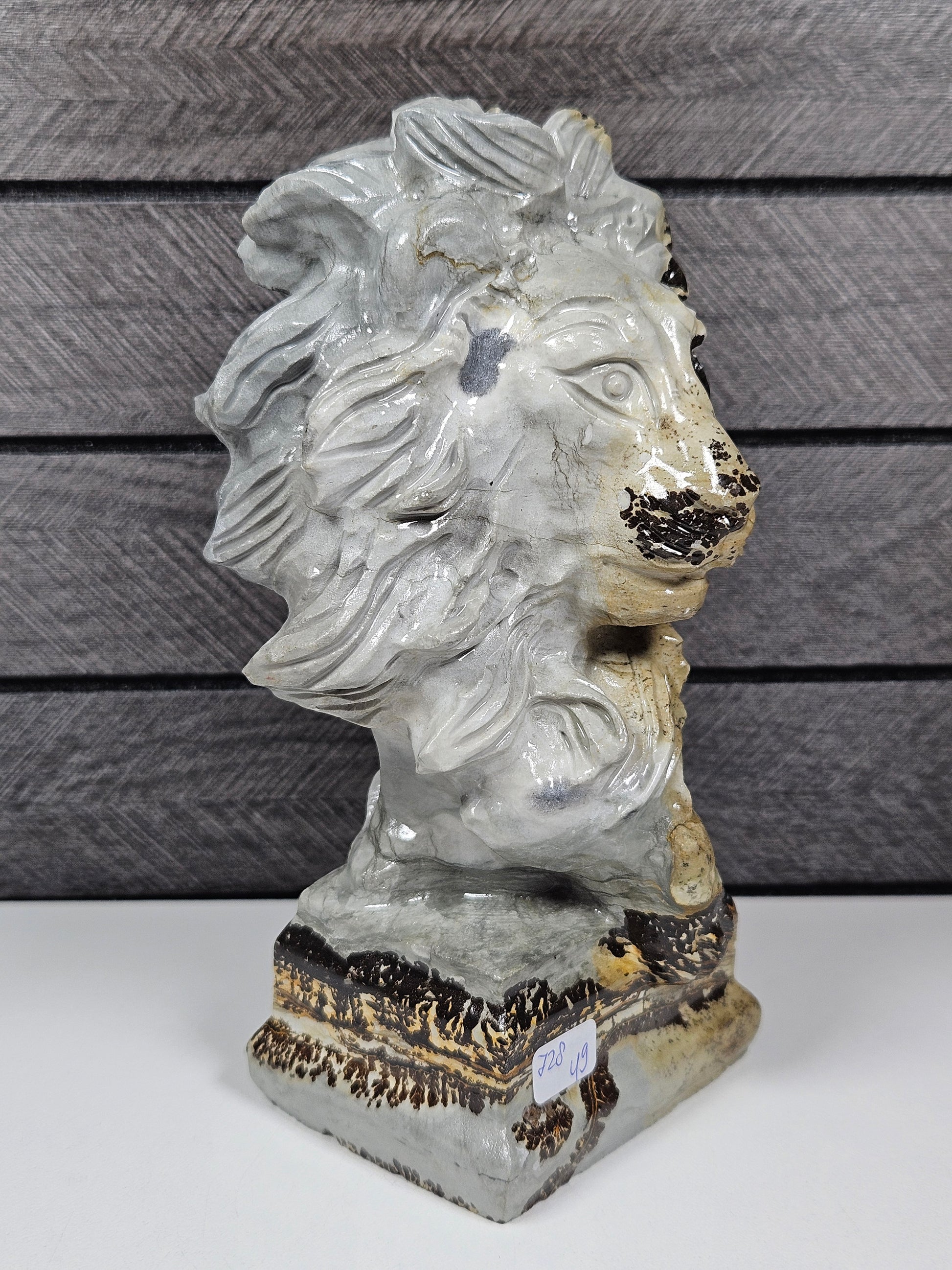 Landschapsjaspis wordt vaak geassocieerd met stabiliteit, aarding en verbondenheid met de natuur. In combinatie met de symboliek van de leeuw, kracht, moed en leiderschap, ontstaat een krachtige decoratieve sculptuur met een sterke uitstraling. Dit maakt het beeld geschikt als spiritueel object, krachtig interieuraccent of bijzonder verzamelstuk.
