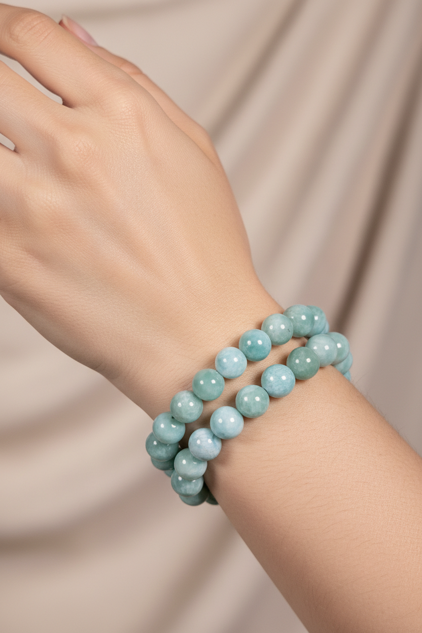 De Larimar armband (7mm) is een elegante edelsteenarmband met zachte lichtblauwe tot turquoise tinten die doen denken aan helder tropisch zeewater. Deze bijzondere steen staat bekend om zijn kalmerende en harmoniserende energie en wordt vaak gedragen om innerlijke rust, emotionele balans en heldere communicatie te ondersteunen.