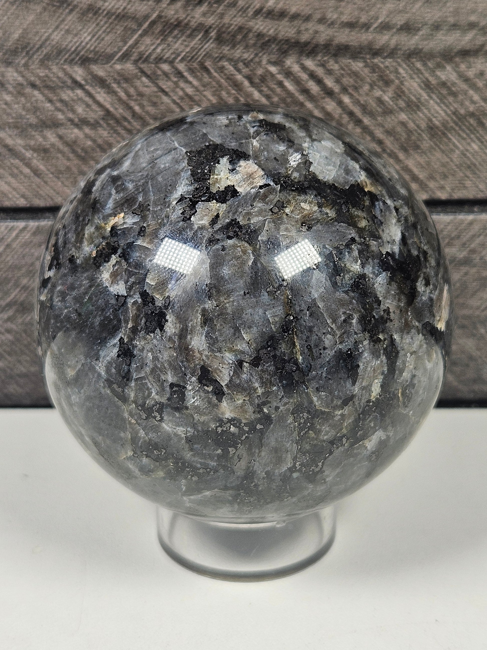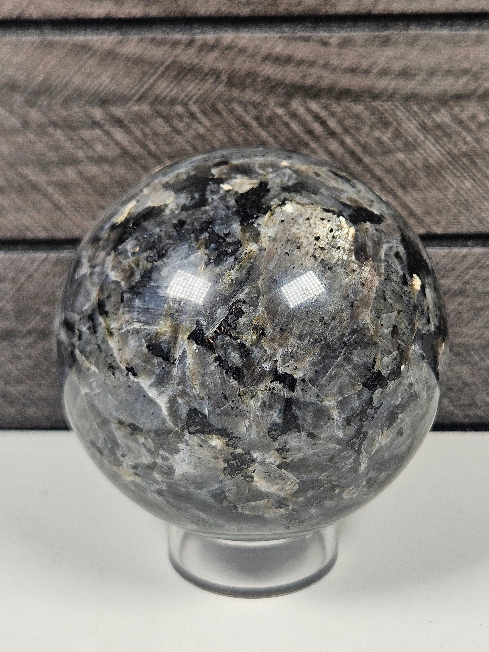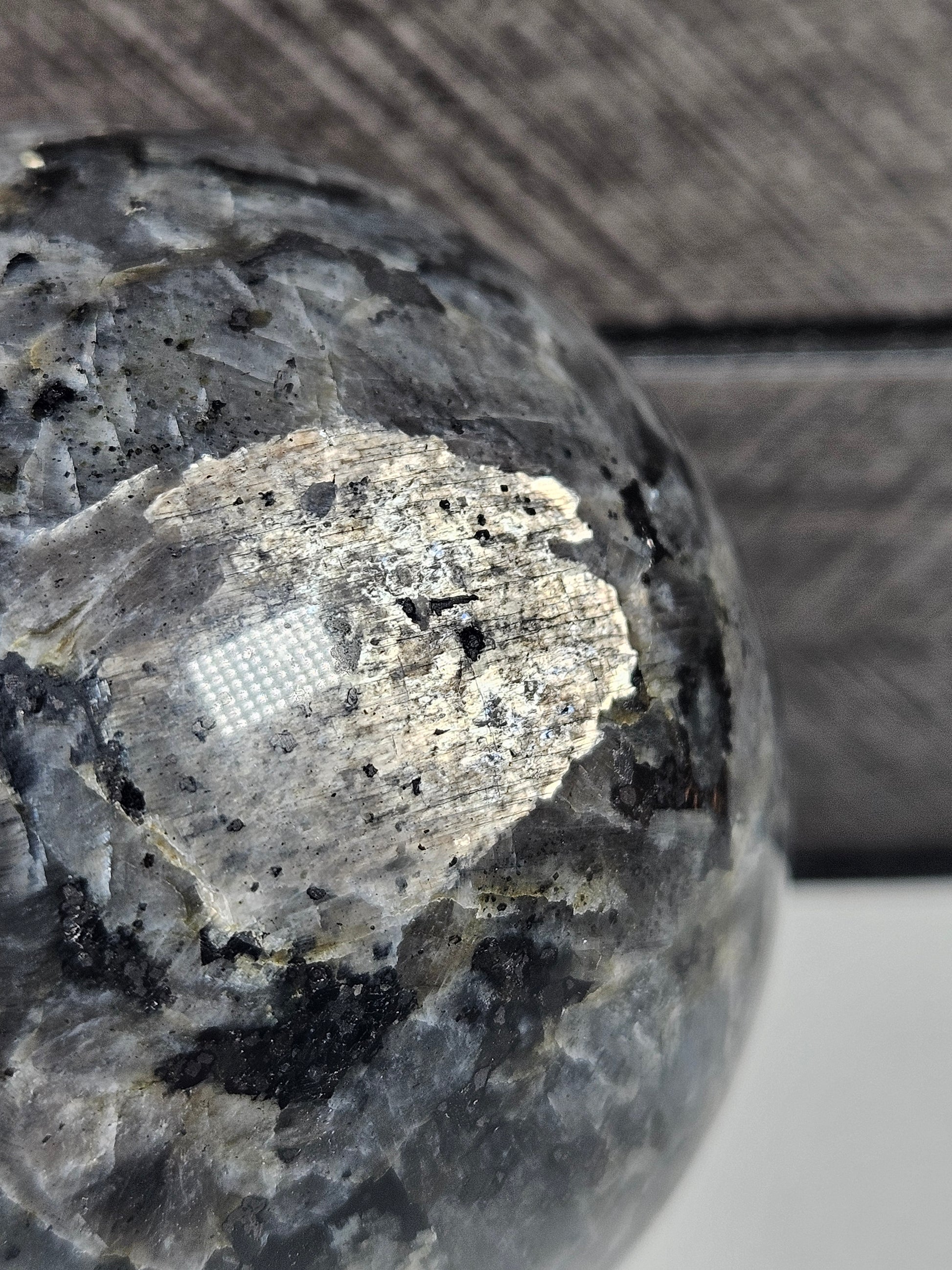 Deze larvikiet bol is een krachtige en tegelijk aardende edelsteen met een mysterieuze uitstraling. De diepe grijs-zwarte basis wordt subtiel verlicht door zilver- en blauwachtige schitteringen, die zichtbaar worden wanneer het licht erop valt. Dit natuurlijke glansspel geeft de bol een bijna magische diepte en maakt elk exemplaar uniek.