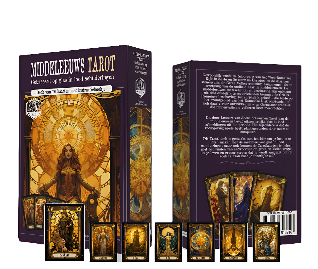 Gewoonlijk wordt de teloorgang van het West-Romeinse Rijk in de 4e en 5e eeuw na Christus, en de daarmee samenvallende Grote Volksverhuizing, aangenomen als de overgang van de oudheid naar de middeleeuwen. De middeleeuwse maatschappij en beschaving zijn ontstaan uit drie duidelijk te onderscheiden bronnen: de Grieks-Romeinse beschaving, het christelijk geloof – die beide op het grondgebied van het Romeinse Rijk ontstonden of zich daar verder ontwikkelden – en Germaanse tradities, die binnenvallende volkeren later meebrachten. Dit door Lennert van Joose ontworpen Tarot van de middeleeuwen bevat uitzonderlijke glas in lood afbeeldingen uit die periode. Het bijzondere is dat de vormgeving mede heeft plaatsgevonden door mens en computer. Dit Tarot deck is gemaakt met het idee om je kennis te laten maken met de middeleeuwse glas in lood schilderingen maar ook kunnen de Tarotkaarten je helpen met het vinden van antwoorden op grote en kleine vragen in je leven en ervoor zorgen dat je wordt aangezet om op zoek te gaan naar je innerlijke zelf.