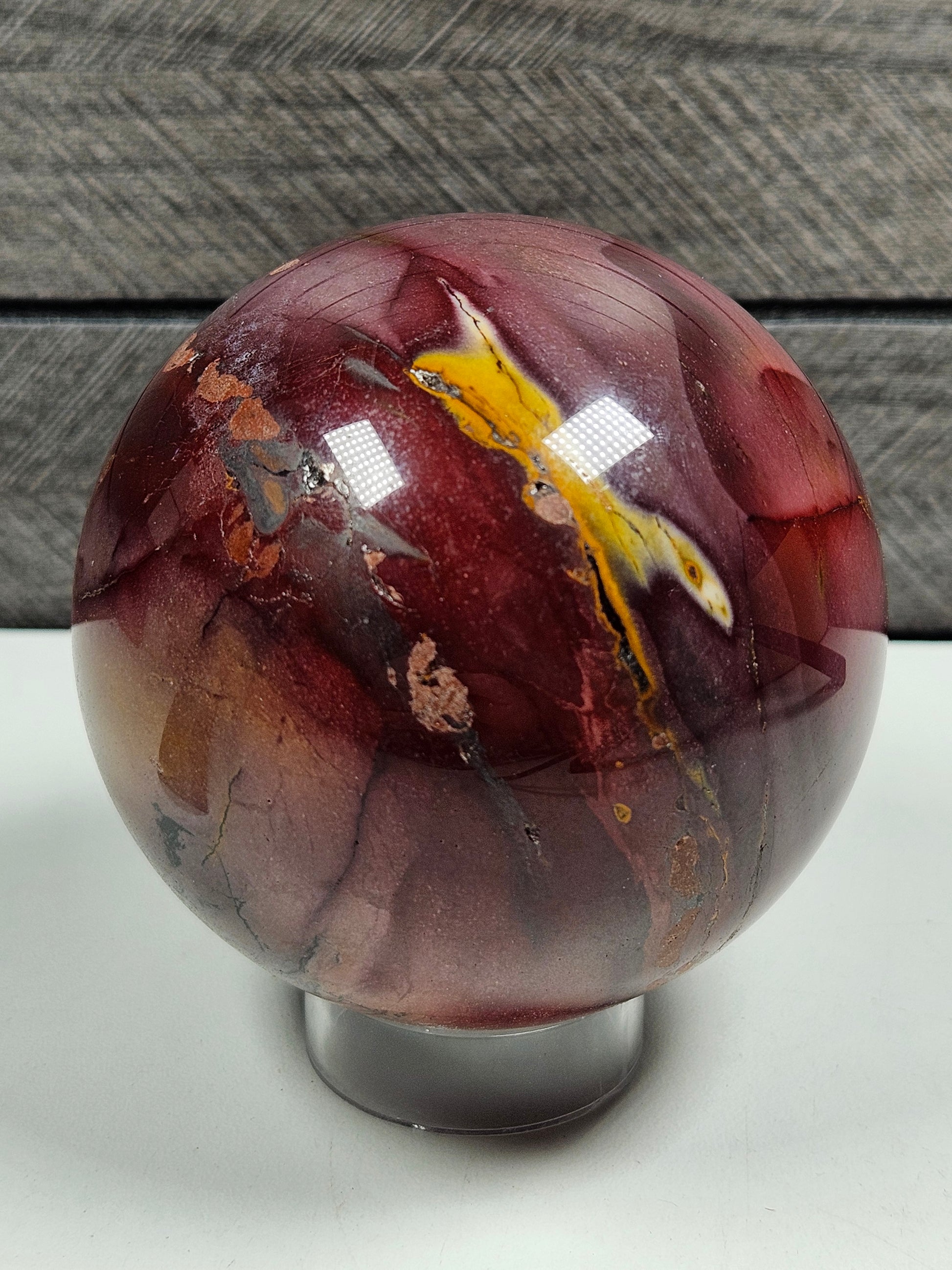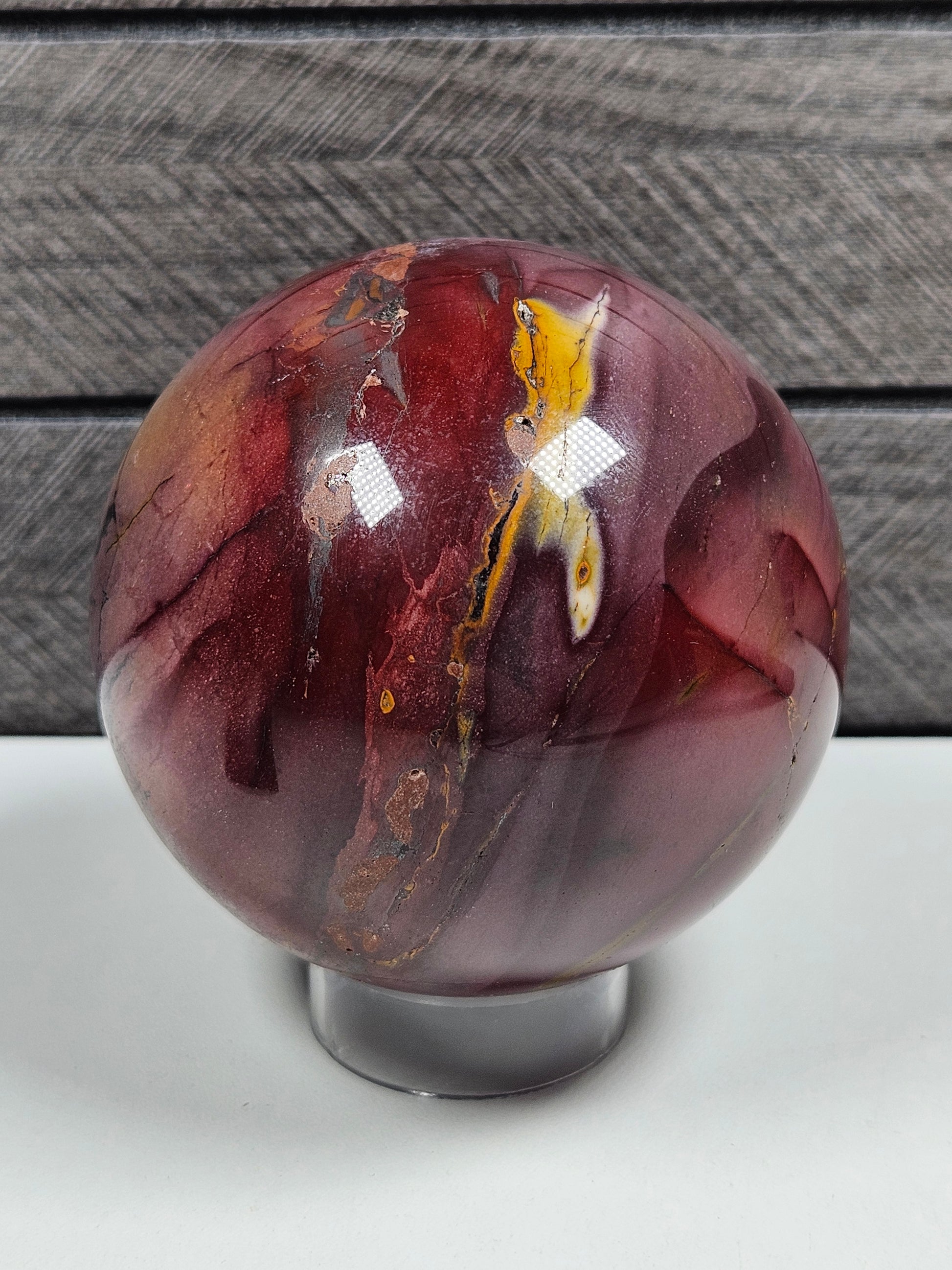 Deze Mookaiet bol van 486 gram met een diameter van circa 7 cm is een compact maar krachtig natuurproduct met warme aardetinten in rood, okergeel, crème en bruin. De natuurlijke kleurbanen en patronen maken elke bol uniek en geven het oppervlak een levendige uitstraling. Dankzij de gepolijste afwerking komen deze kleurnuances rondom prachtig tot hun recht.
