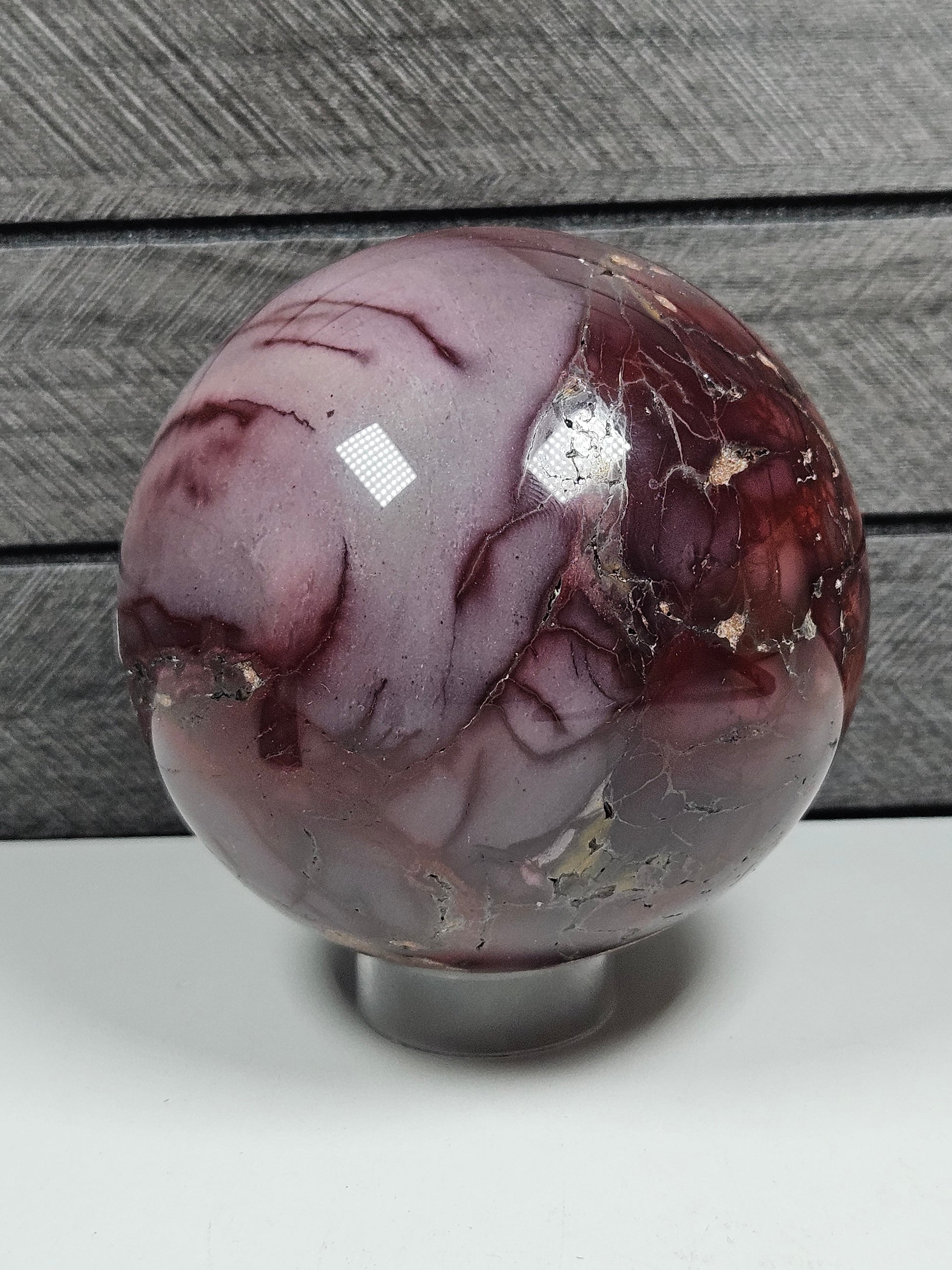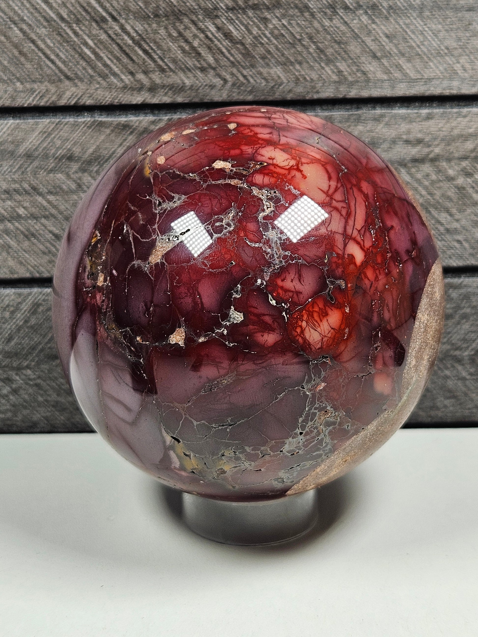 Dit specifieke exemplaar heeft een unieke tekening en krachtige kleurverdeling. Dankzij het royale formaat en gewicht heeft de bol een stevige aanwezigheid en komt hij prachtig tot zijn recht op een bolhouder, plank, tafel of in een edelstenenverzameling.
