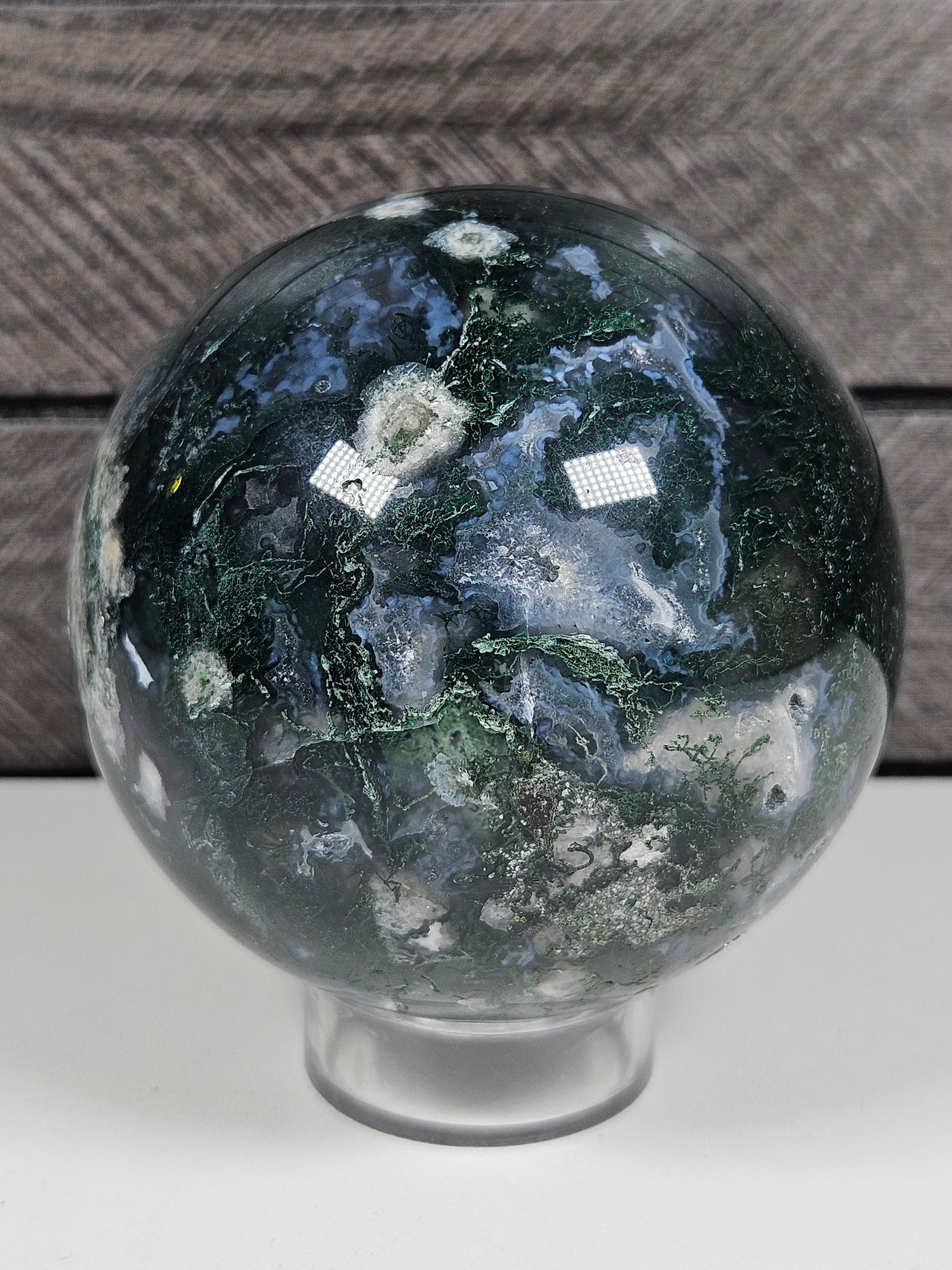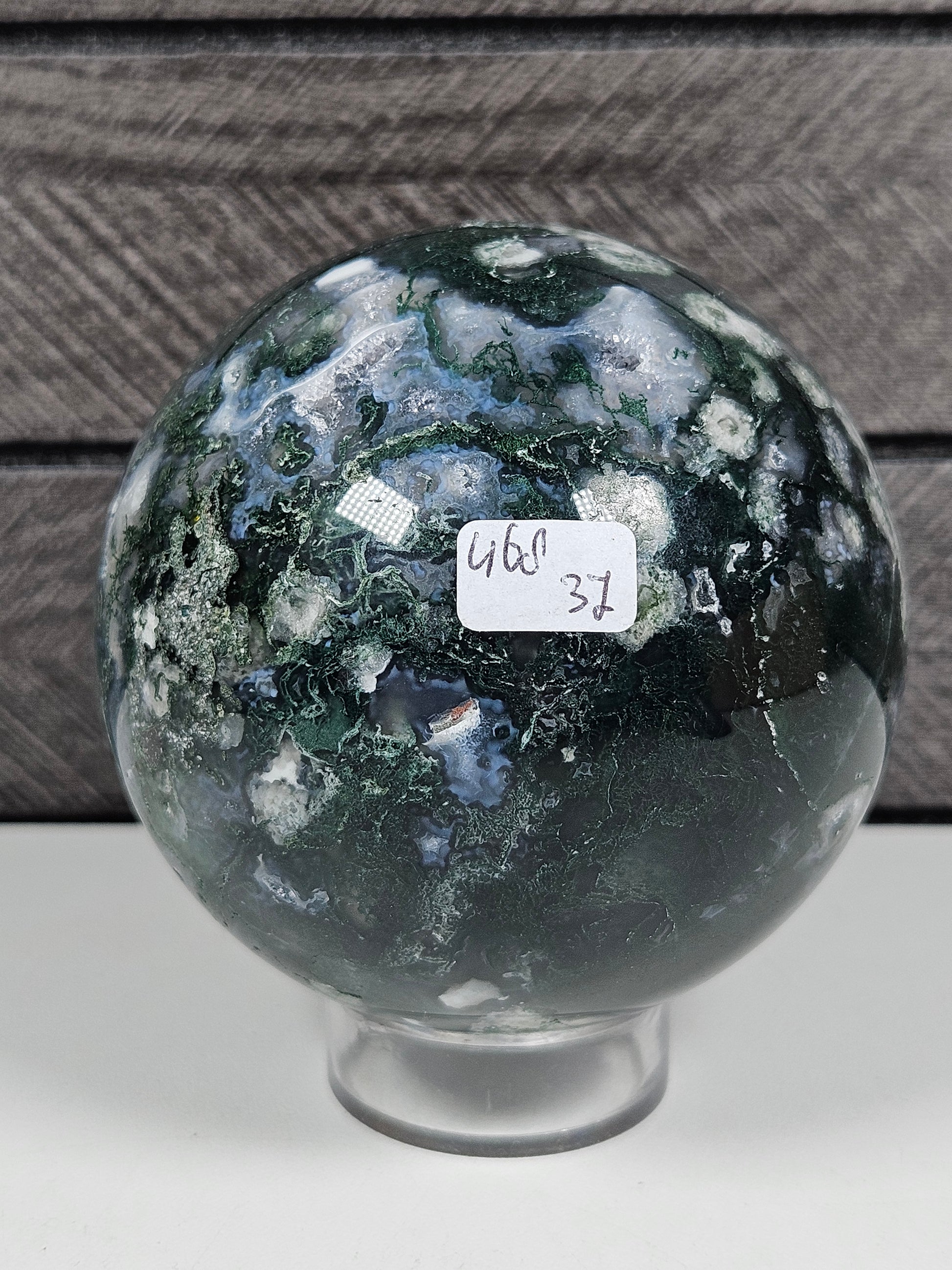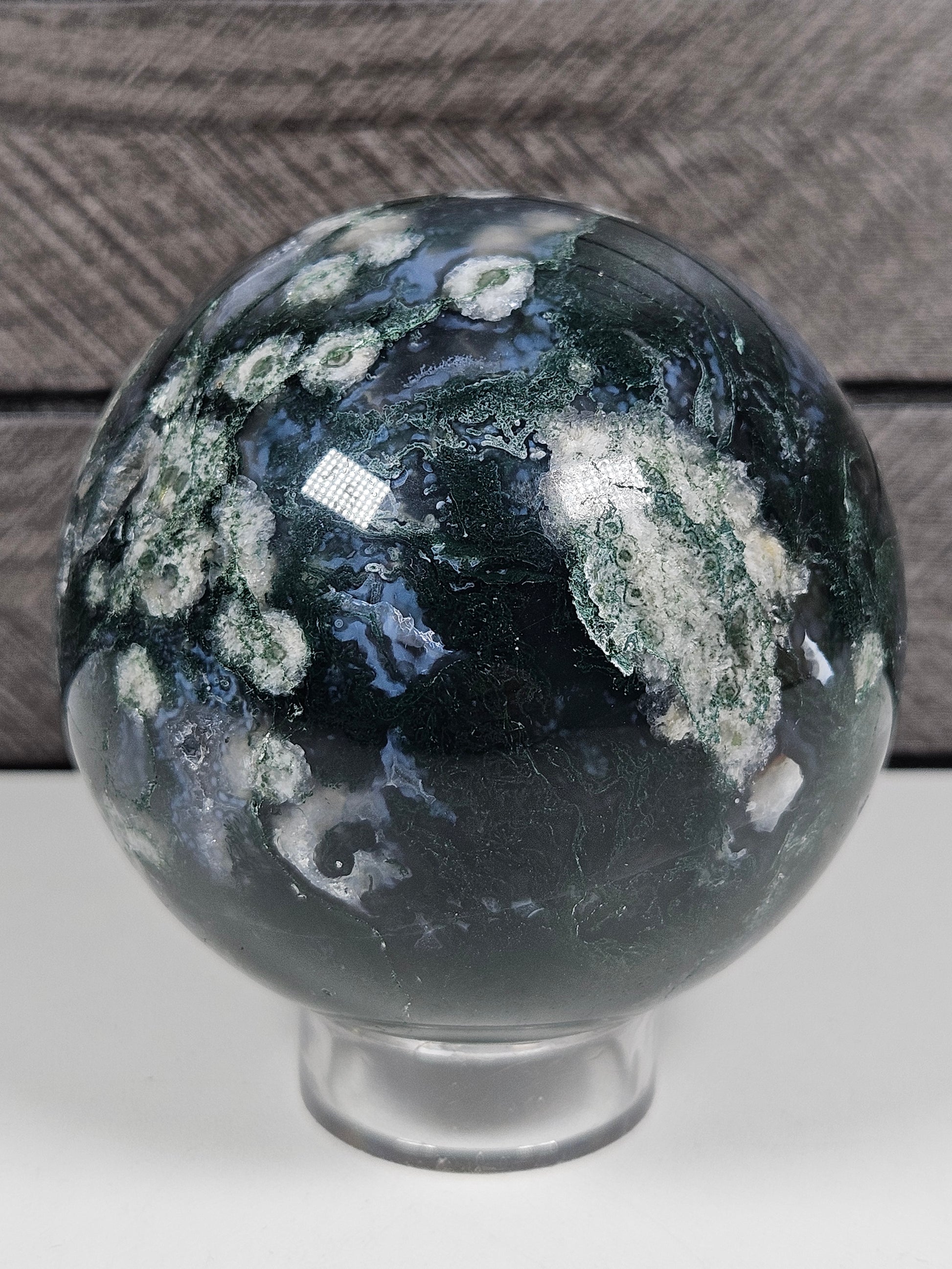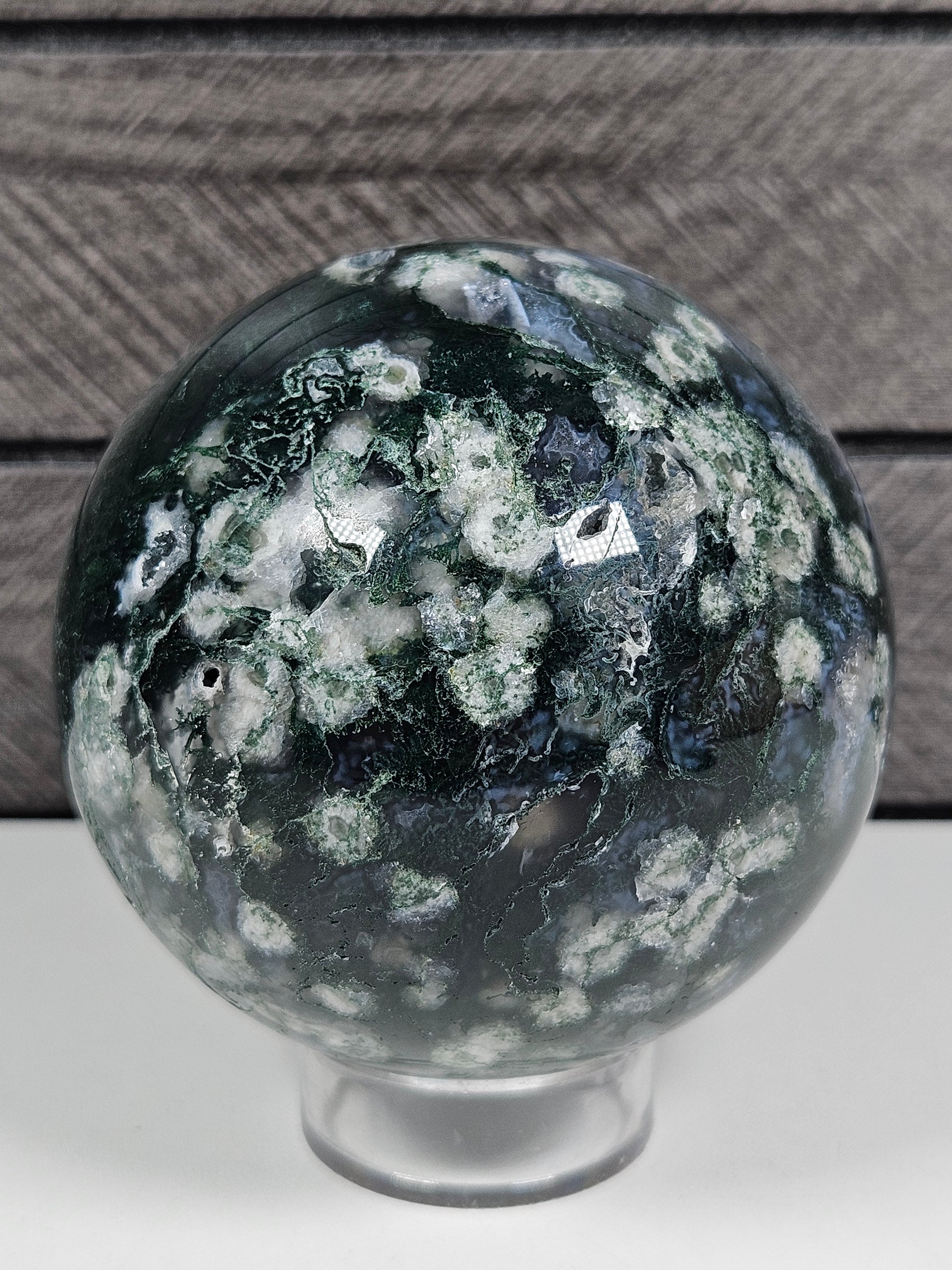 Deze bol is een uniek stuk natuursteen waarin mosagaat en calciet samenkomen. Kleur, insluitsels en patronen zijn volledig natuurlijk gevormd, waardoor elke bol een eigen karakter en uitstraling heeft. Je ontvangt precies het exemplaar dat op de foto staat.