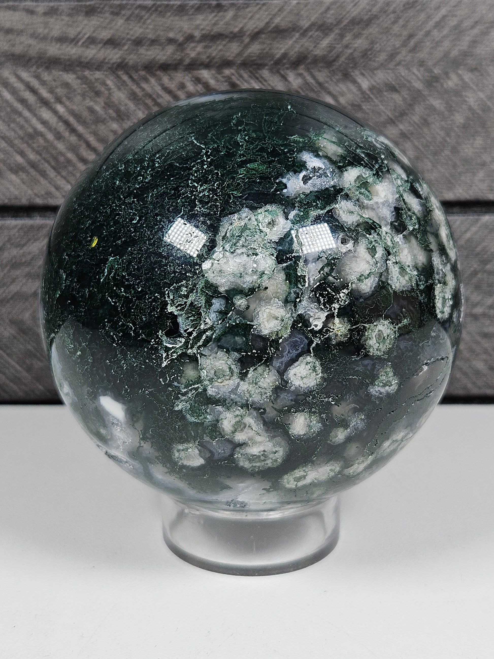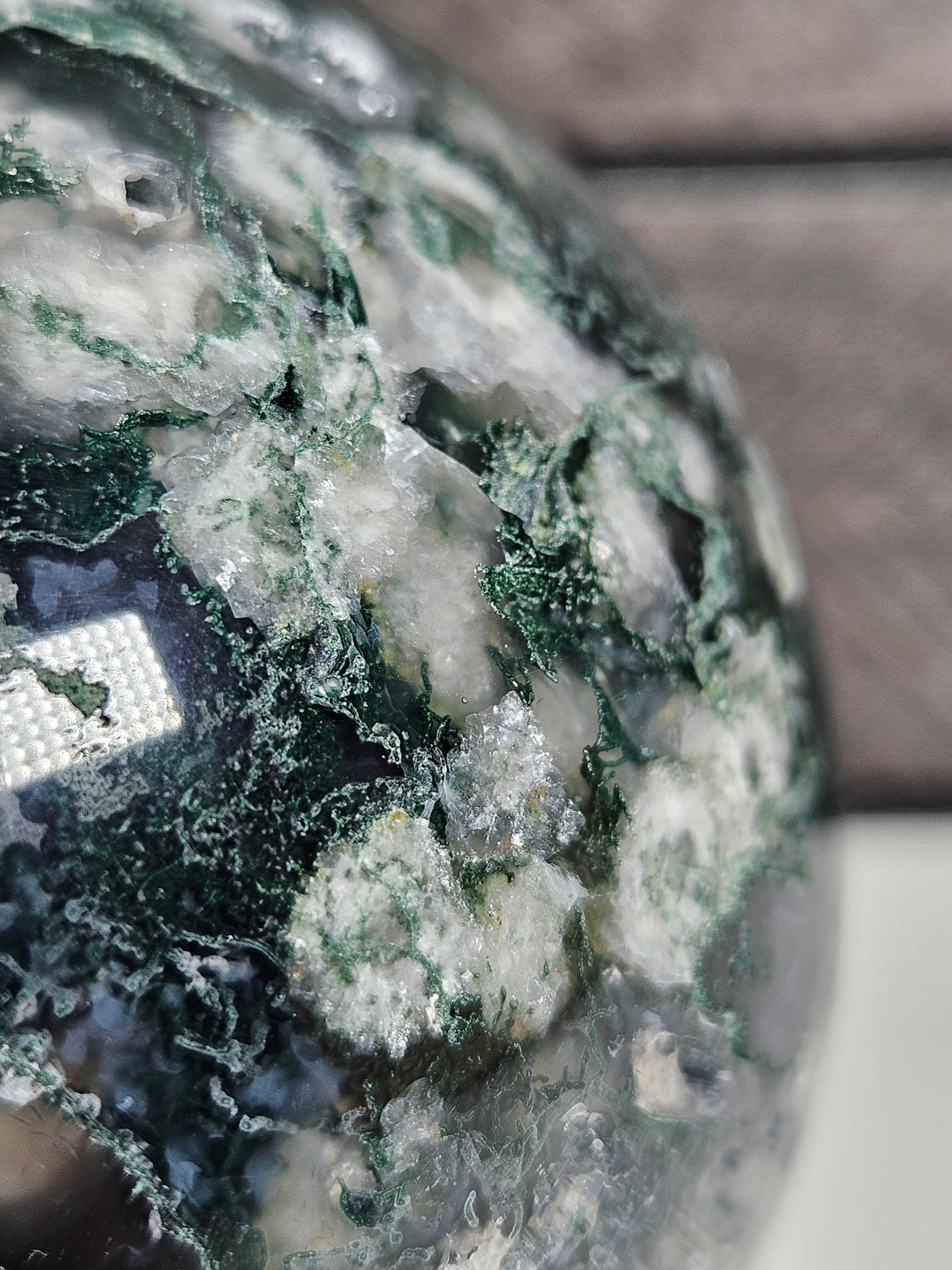 Deze prachtige bol van mosagaat en calciet heeft een natuurlijke en harmonieuze uitstraling met een mooi samenspel van kleuren. Groene, mosachtige insluitsels worden afgewisseld met zachte, lichte tinten van calciet, wat zorgt voor een levendig en tegelijkertijd rustgevend geheel. Door de bolvorm komt de unieke tekening van deze combinatie vanuit elke hoek prachtig naar voren.