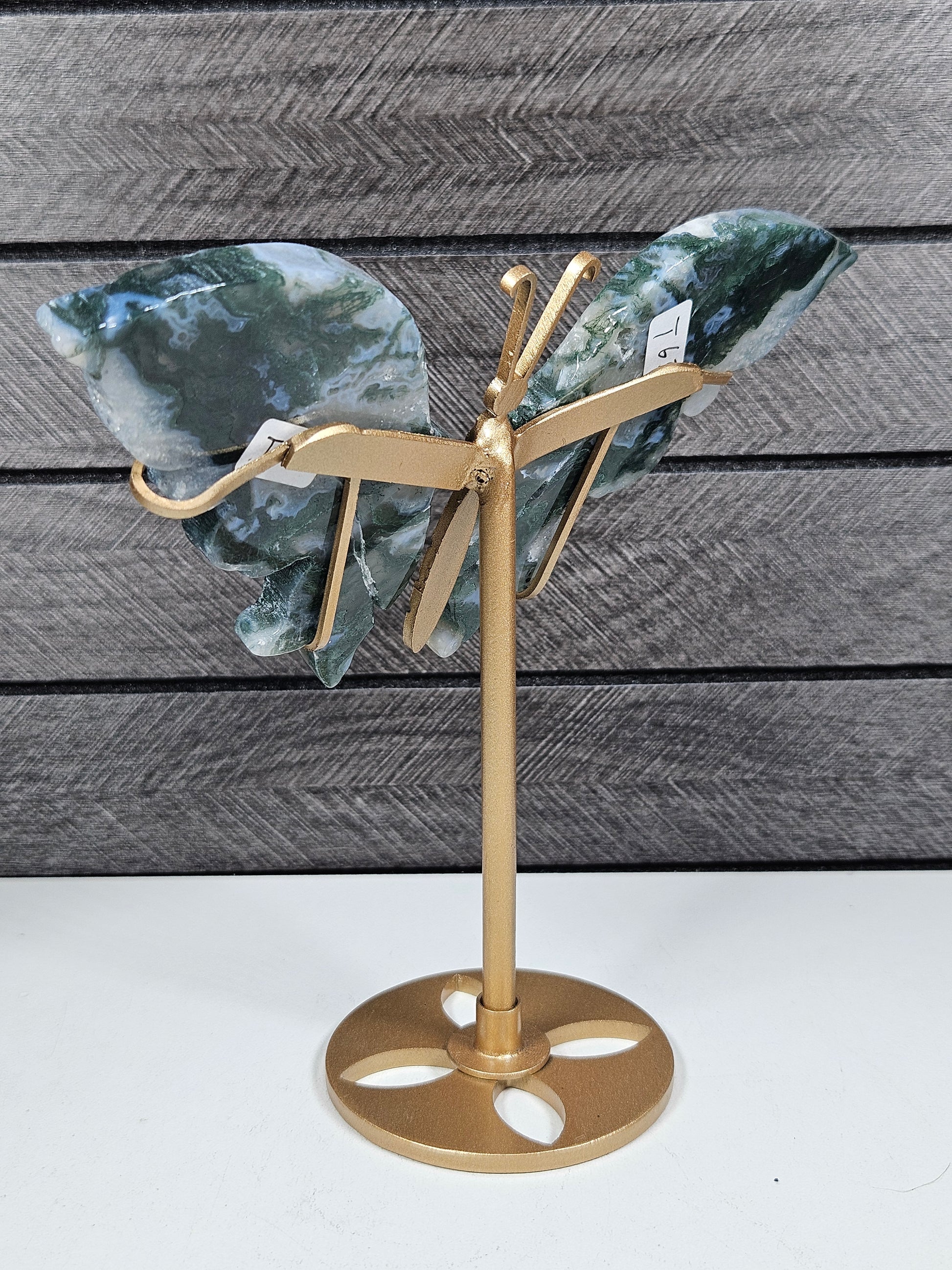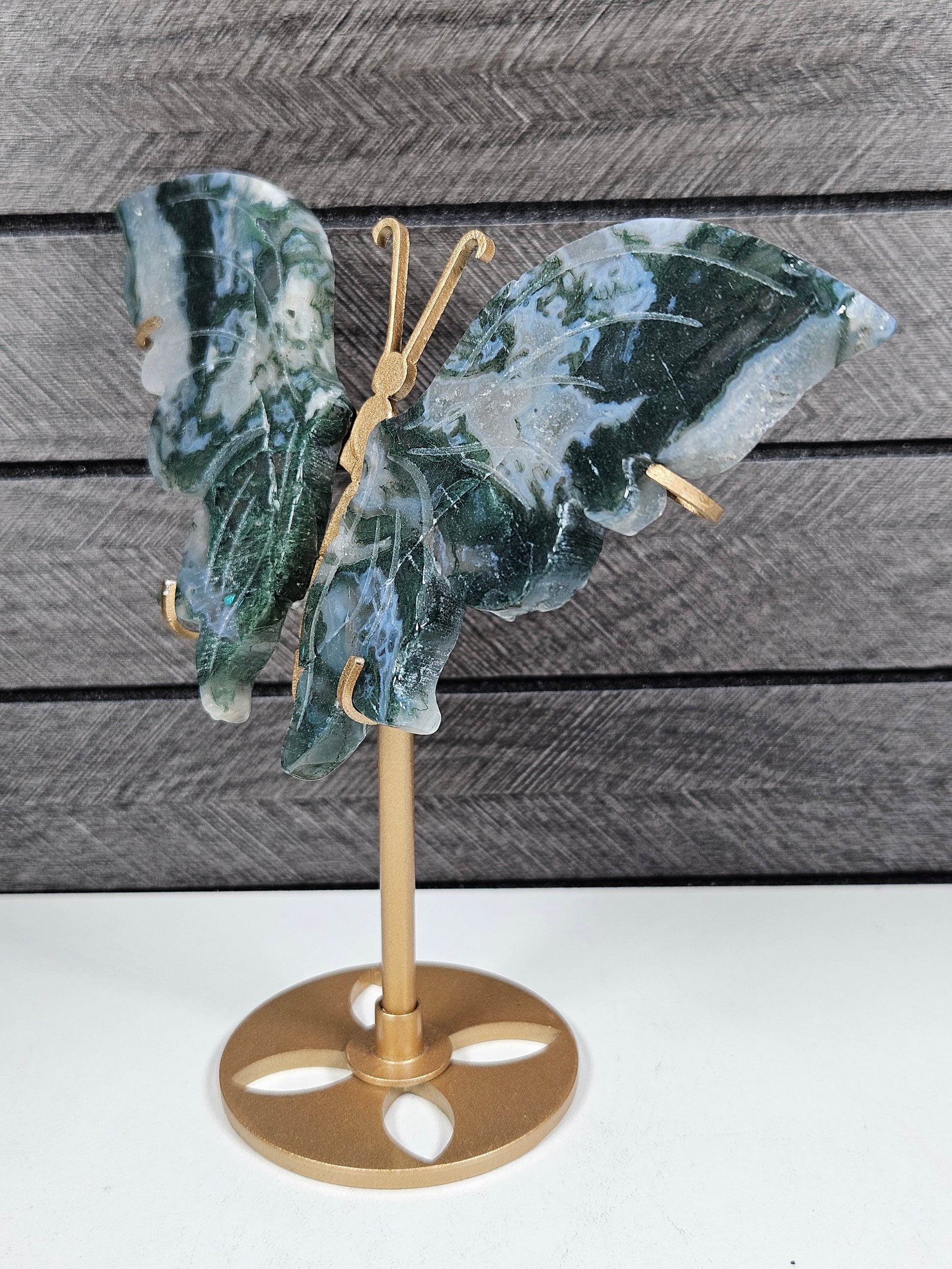 Deze Mosagaat vlinder is een handgemaakt decoratiestuk met een natuurlijke en krachtige uitstraling. Met een breedte van 16,5 cm en een hoogte van 14 cm is dit een royale en opvallende blikvanger voor je interieur, altaar of edelstenencollectie.