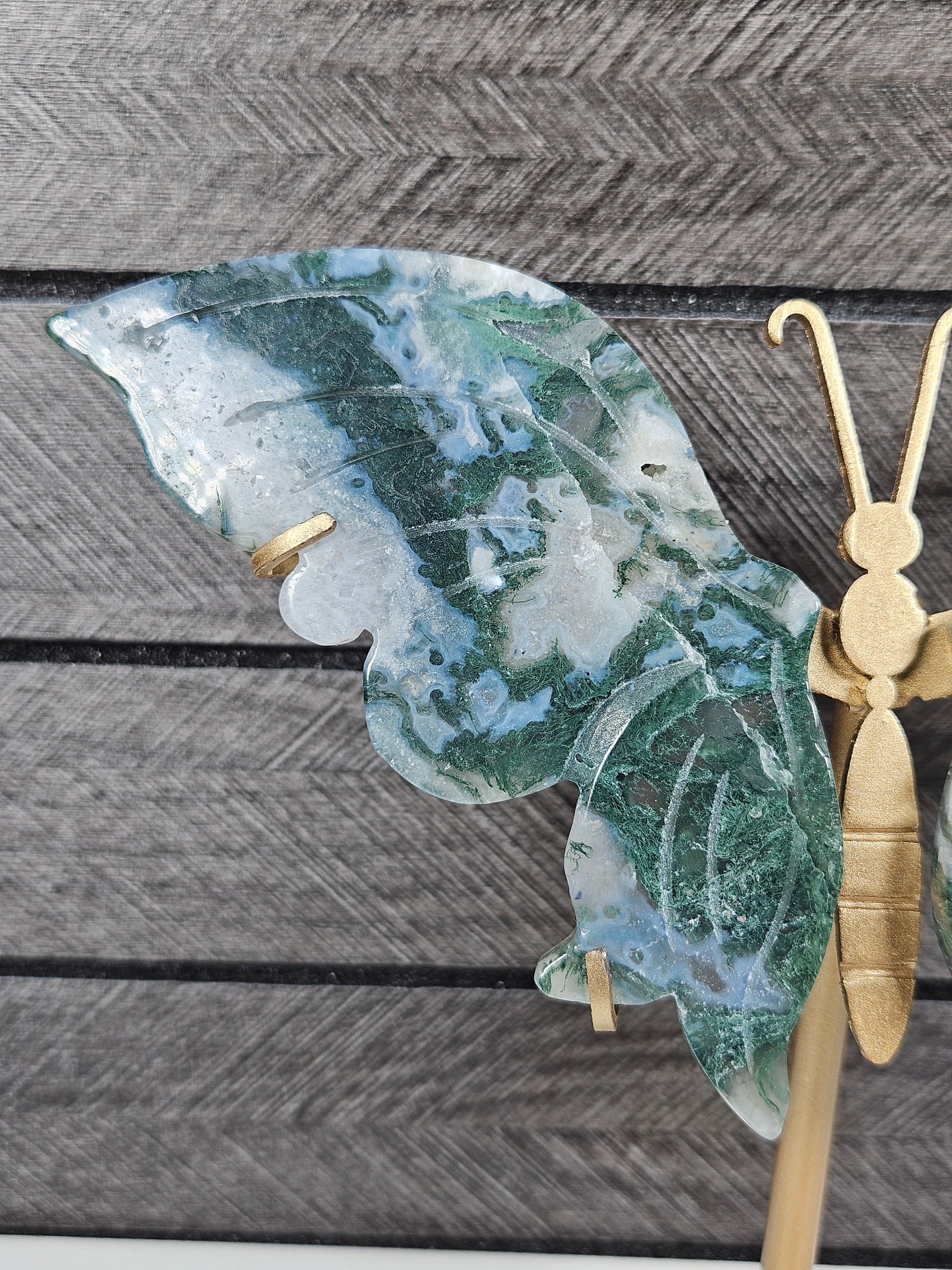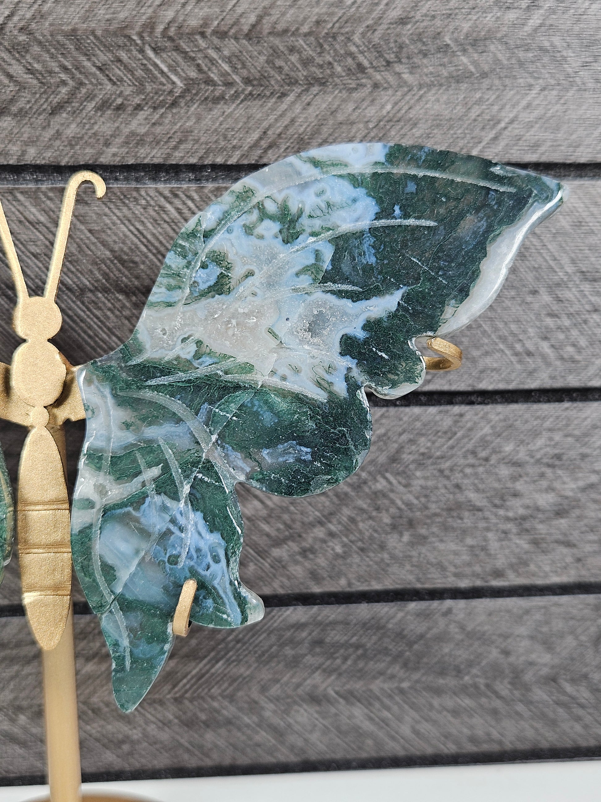 Mosagaat staat bekend als de steen van groei, balans en verbinding met de natuur. De groene insluitsels in de steen doen denken aan mos en landschappen, waardoor elke vlinder uniek is in tekening en kleur. Geen enkel exemplaar is hetzelfde. Je ontvangt exact het stuk dat op de foto staat.