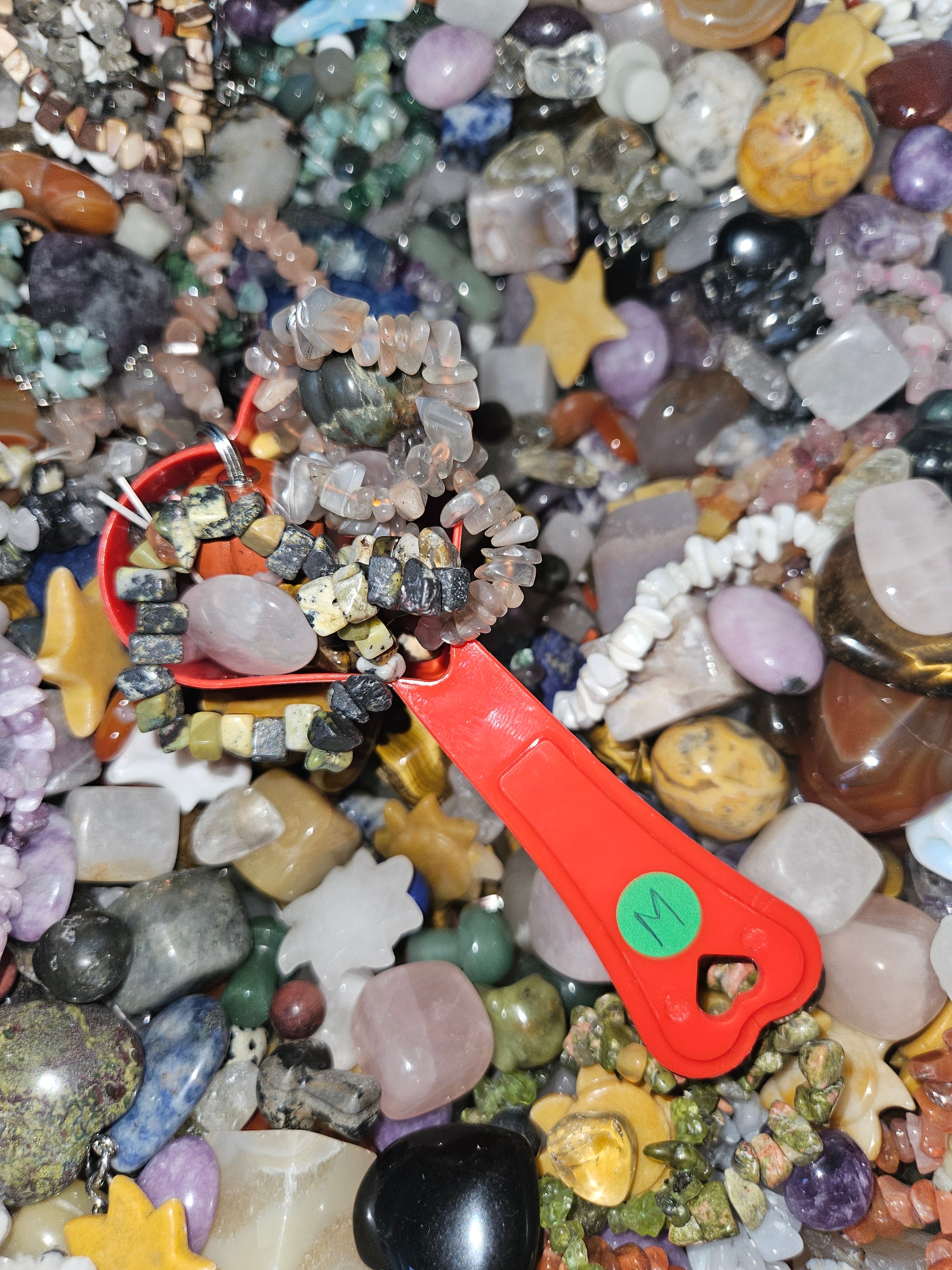 De foto's dienen als indicatie van het type edelstenen dat mogelijk in een scoop kan zitten. Elke scoop is uniek en de inhoud varieert. Laat je verrassen en betoveren!