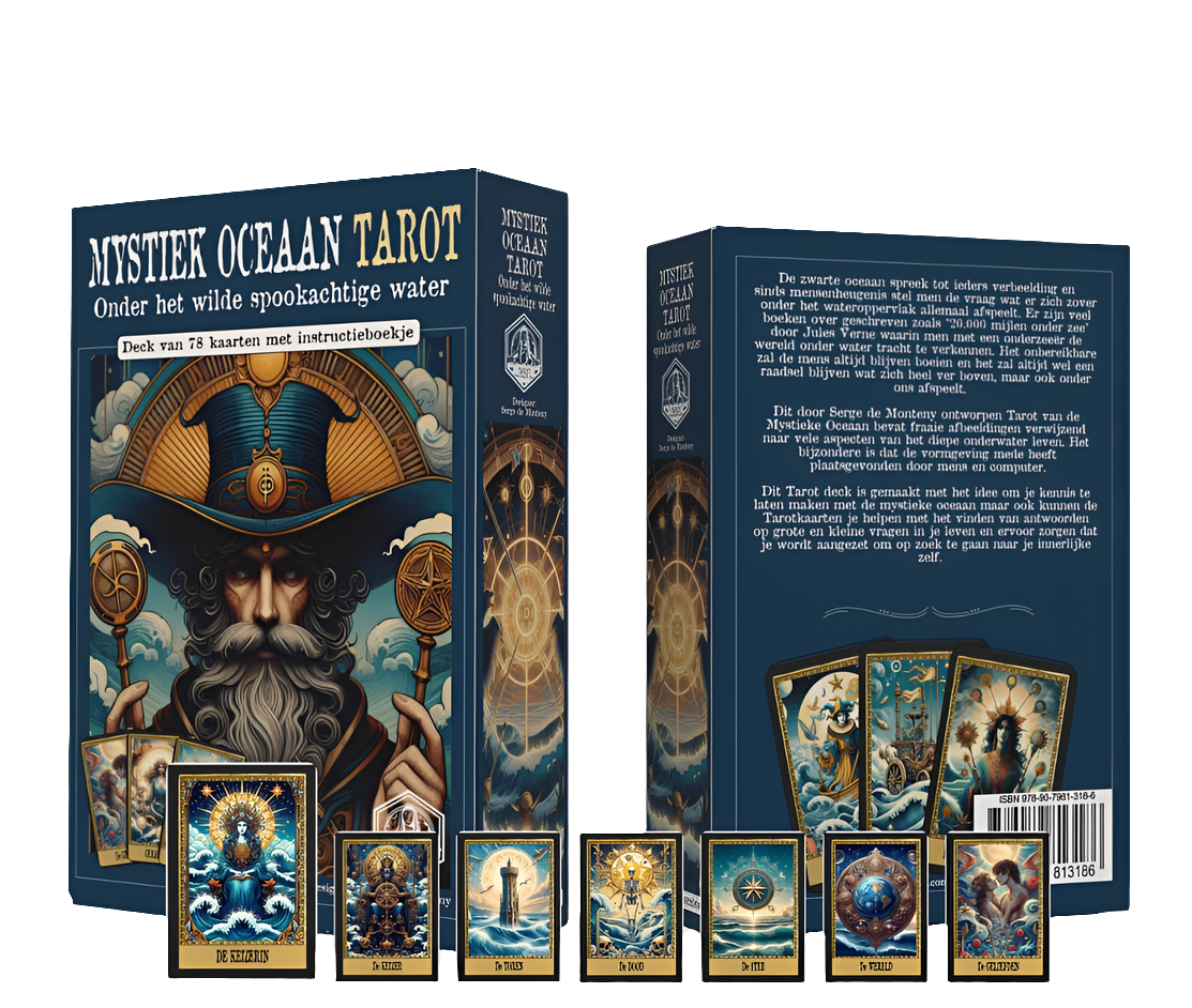 De zwarte oceaan spreek tot ieders verbeelding en sinds mensenheugenis stel men de vraag wat er zich zover onder het wateroppervlak allemaal afspeelt. Er zijn veel boeken over geschreven zoals "20.000 mijlen onder zee" door Jules Verne waarin men met een onderzeeër de wereld onder water tracht te verkennen. Het onbereikbare zal de mens altijd blijven boeien en het zal altijd wel een raadsel blijven wat zich heel ver boven, maar ook onder ons afspeelt. Dit door Serge de Monteny ontworpen Tarot van de Mystieke Oceaan bevat fraaie afbeeldingen verwijzend naar vele aspecten van het diepe onderwater leven. Het bijzondere is dat de vormgeving mede heeft plaatsgevonden door mens en computer. Dit Tarot deck is gemaakt met het idee om je kennis te laten maken met de mystieke oceaan maar ook kunnen de Tarotkaarten je helpen met het vinden van antwoorden op grote en kleine vragen in je leven en ervoor zorgen dat je wordt aangezet om op zoek te gaan naar je innerlijke zelf.