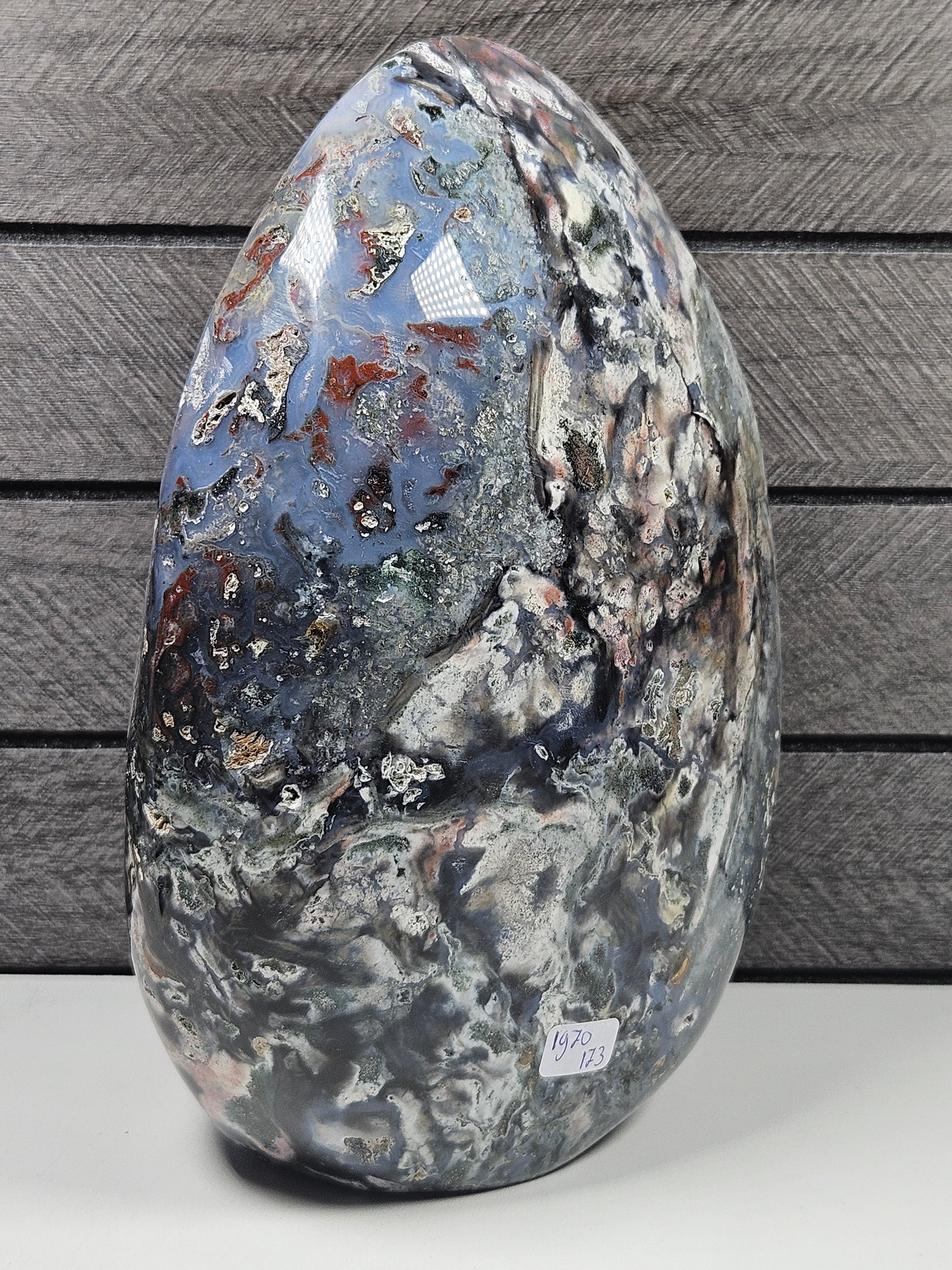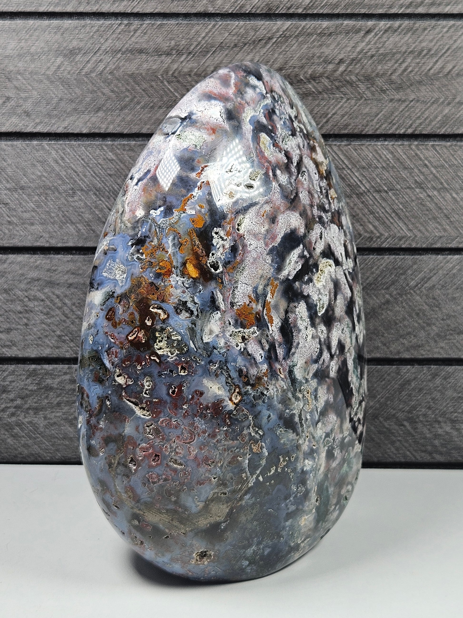 Het betreft een uniek artikel. De Oceaan Jaspis sculptuur die op de foto wordt weergegeven, is exact het exemplaar dat je ontvangt. Natuurlijke variaties in kleur, patroon en structuur horen bij dit natuurproduct en onderstrepen de authenticiteit.