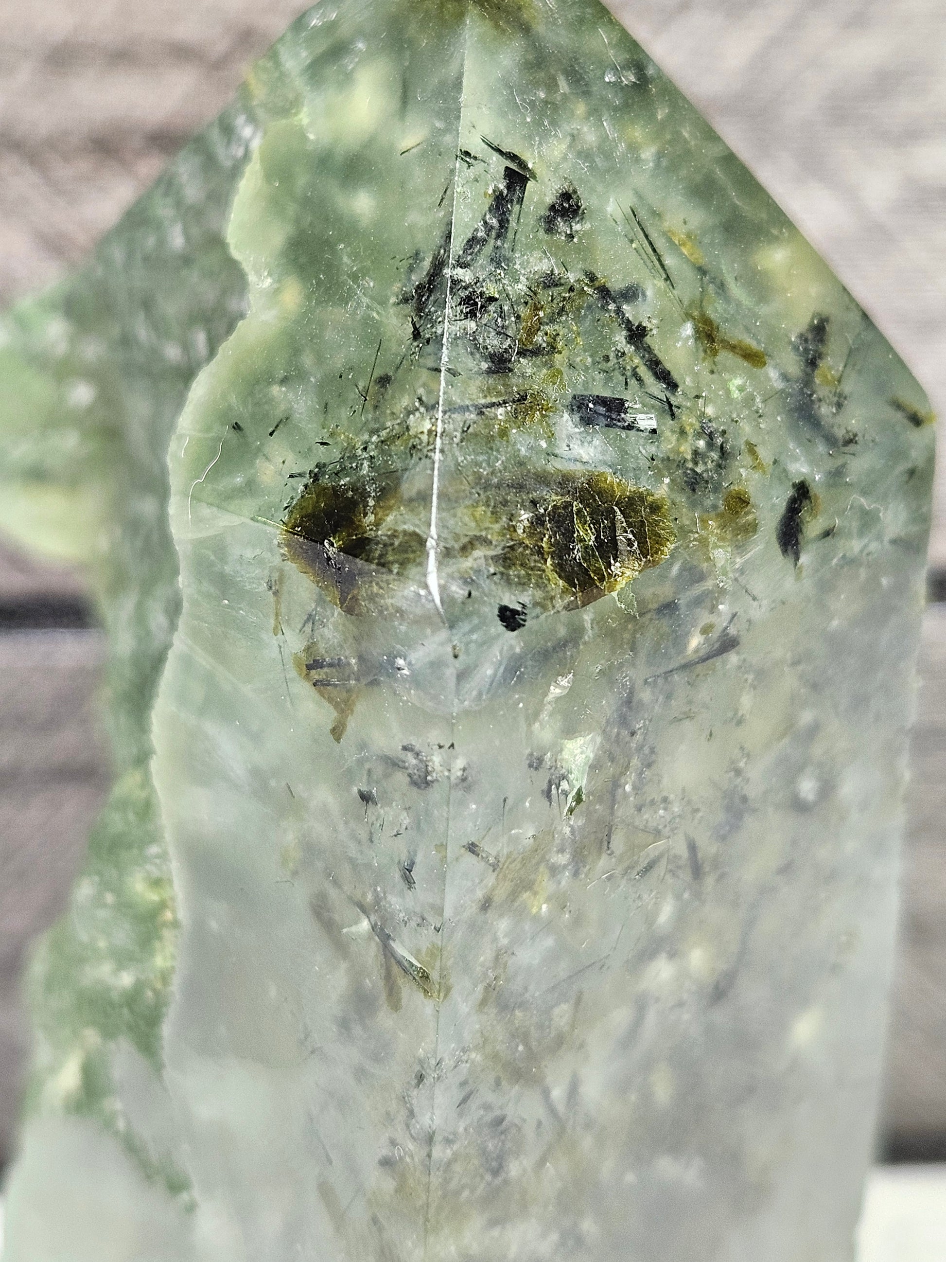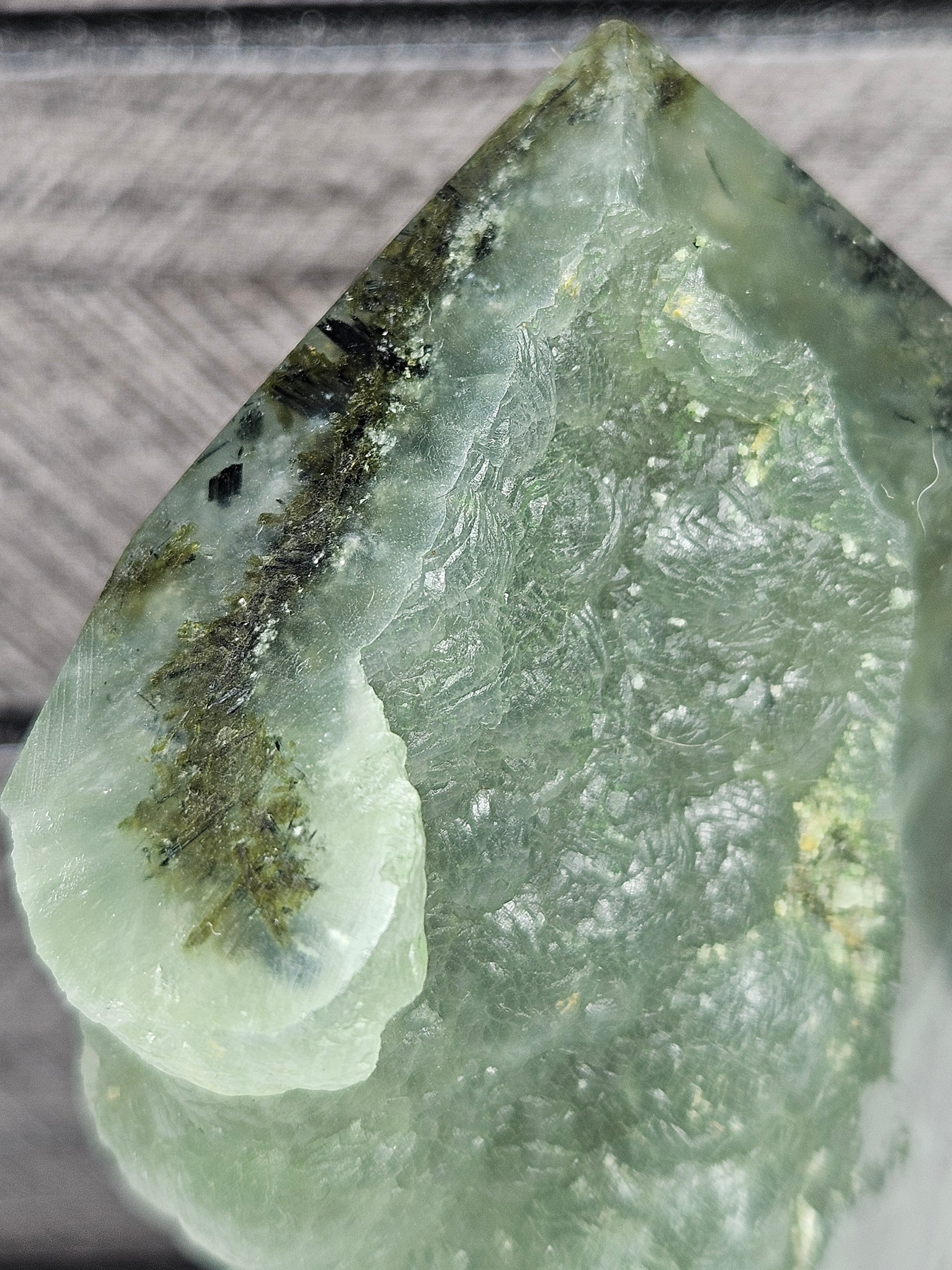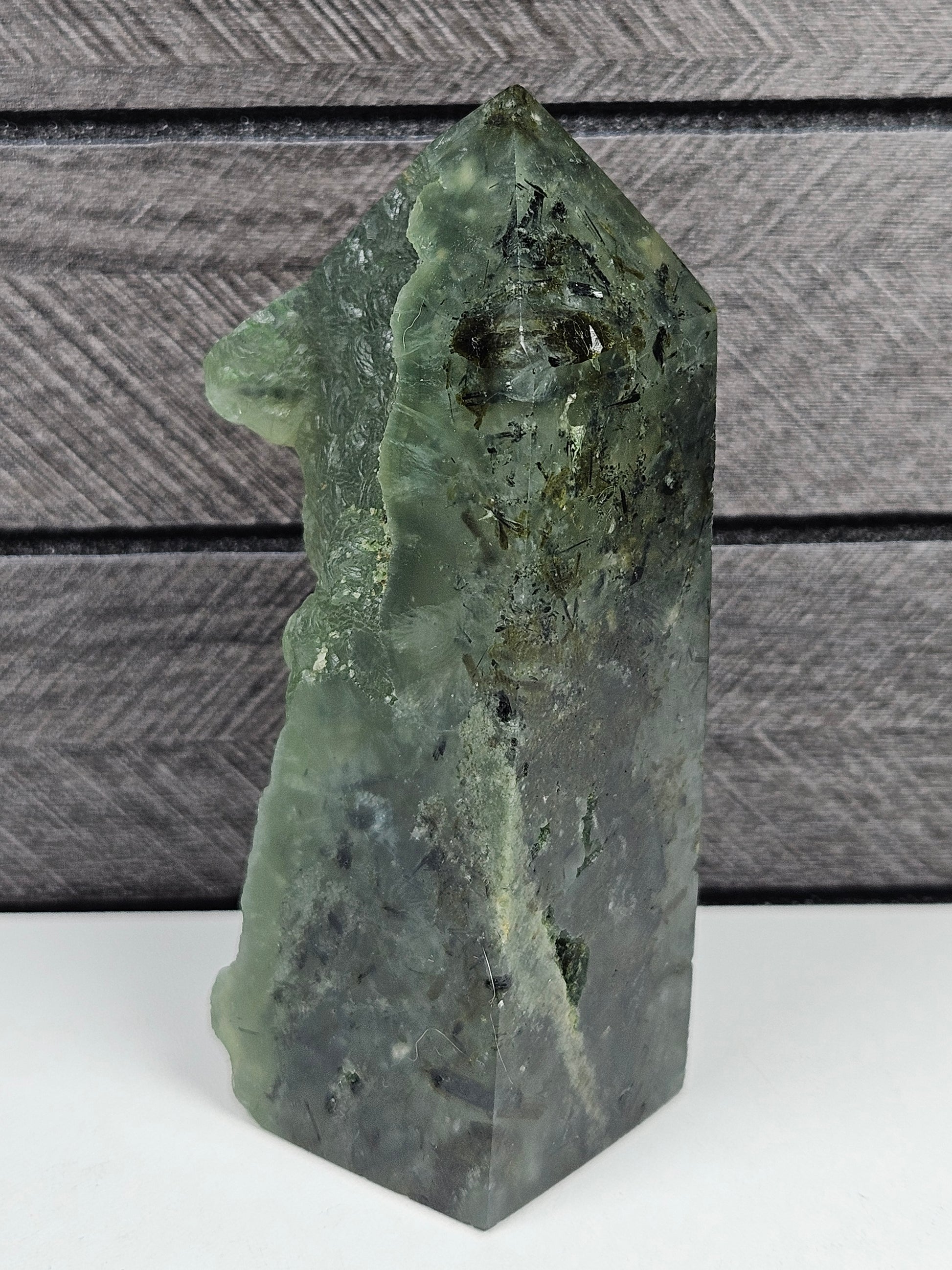 Prehniet draagt een energie die vaak wordt omschreven als rustgevend, hartgericht en aardend. Het is een steen die helpt om overzicht en emotionele balans te bewaren, zonder zwaar te voelen. De zachte groene schakeringen worden gezien als een symbool van vernieuwing en innerlijke harmonie. In torenvorm lijkt de energie zich rustig omhoog te bewegen, wat het ideaal maakt als een klein kristalanker in je dagelijkse omgeving.